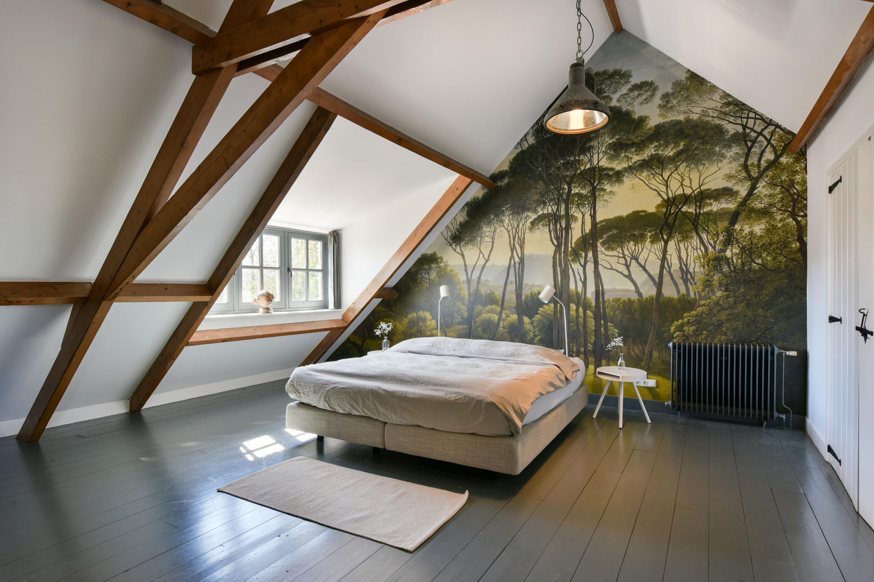 Another bedroom with dormer window features a custom wardrobe – a work of art in itself, designed by artist Daan van den Berg. This room combines practical use with artistic flair.