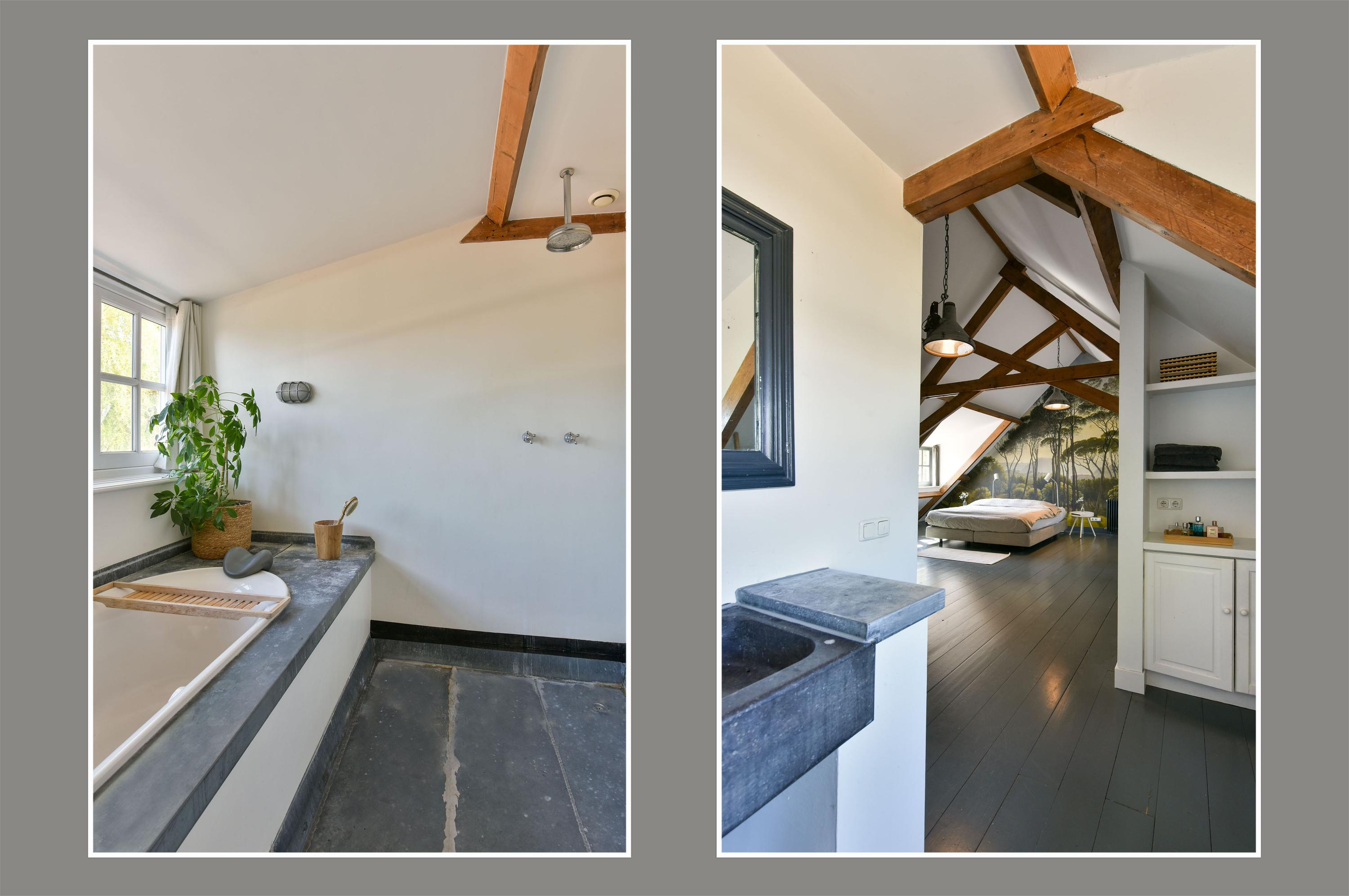 The former hayloft is now an impressive primary suite. A dormer window brings in plenty of light, while the adjacent walk-in closet is a dream come true. The open-plan bathroom adds style and edge, featuring a zinc bathtub as the focal point, a spacious zinc shower tray with rain shower, and a stone basin vanity. A separate toilet offers privacy.