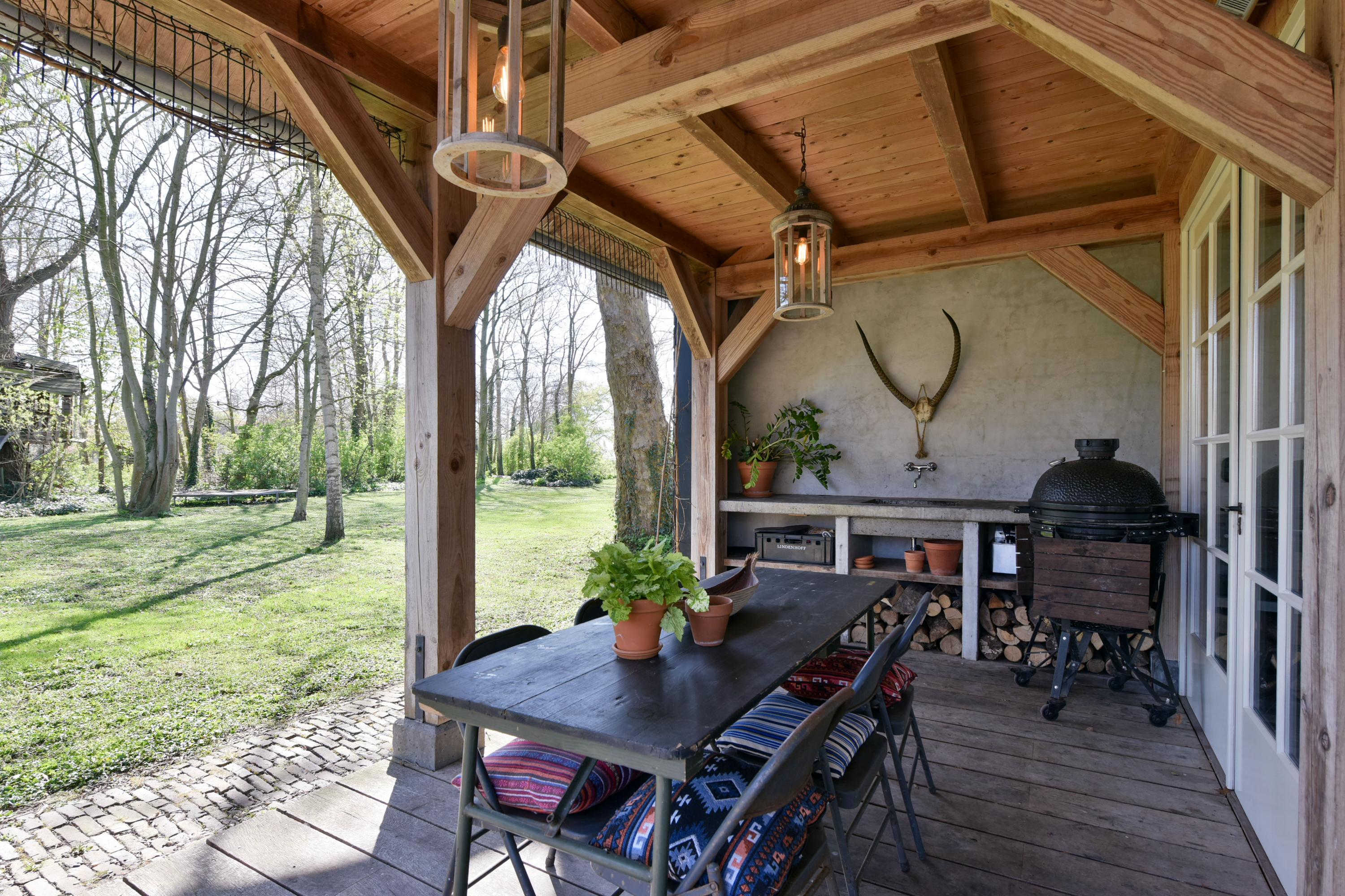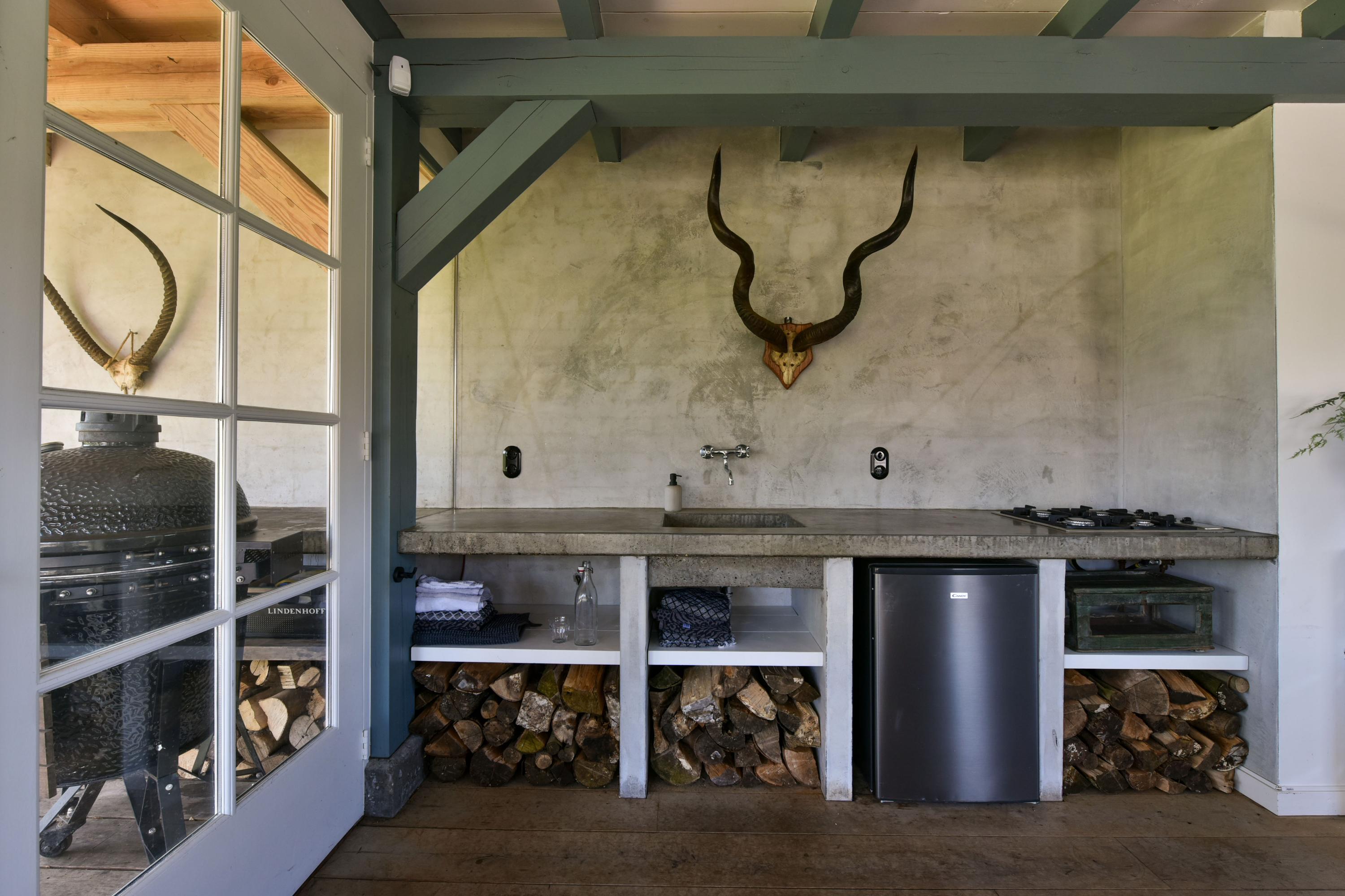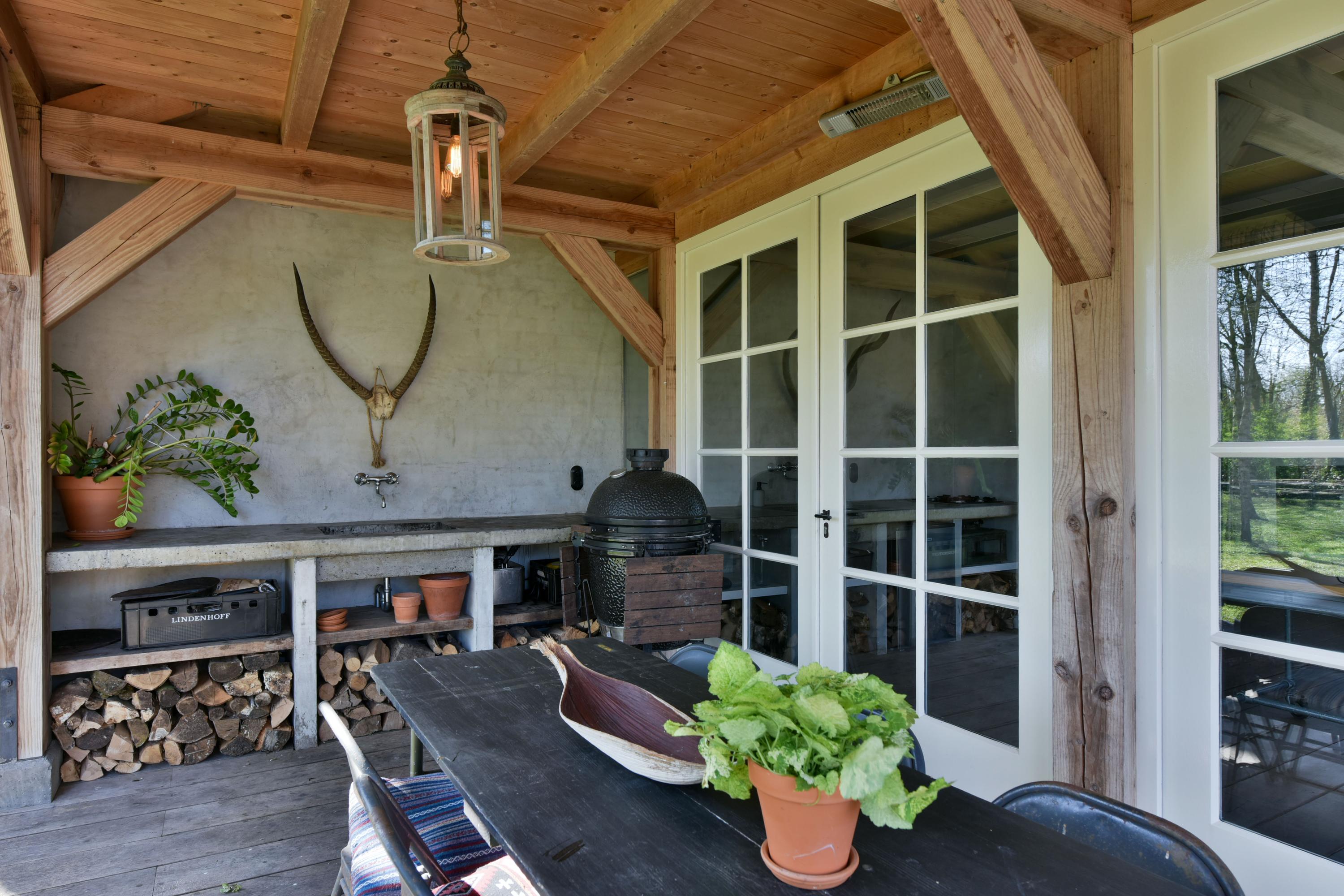 To the side of the house is a versatile and characterful outbuilding. Begin under the covered area, where a unique outdoor kitchen immediately catches the eye. The countertop seamlessly runs from outside to inside, serving as both outdoor and indoor workspace – a stylish, practical detail.