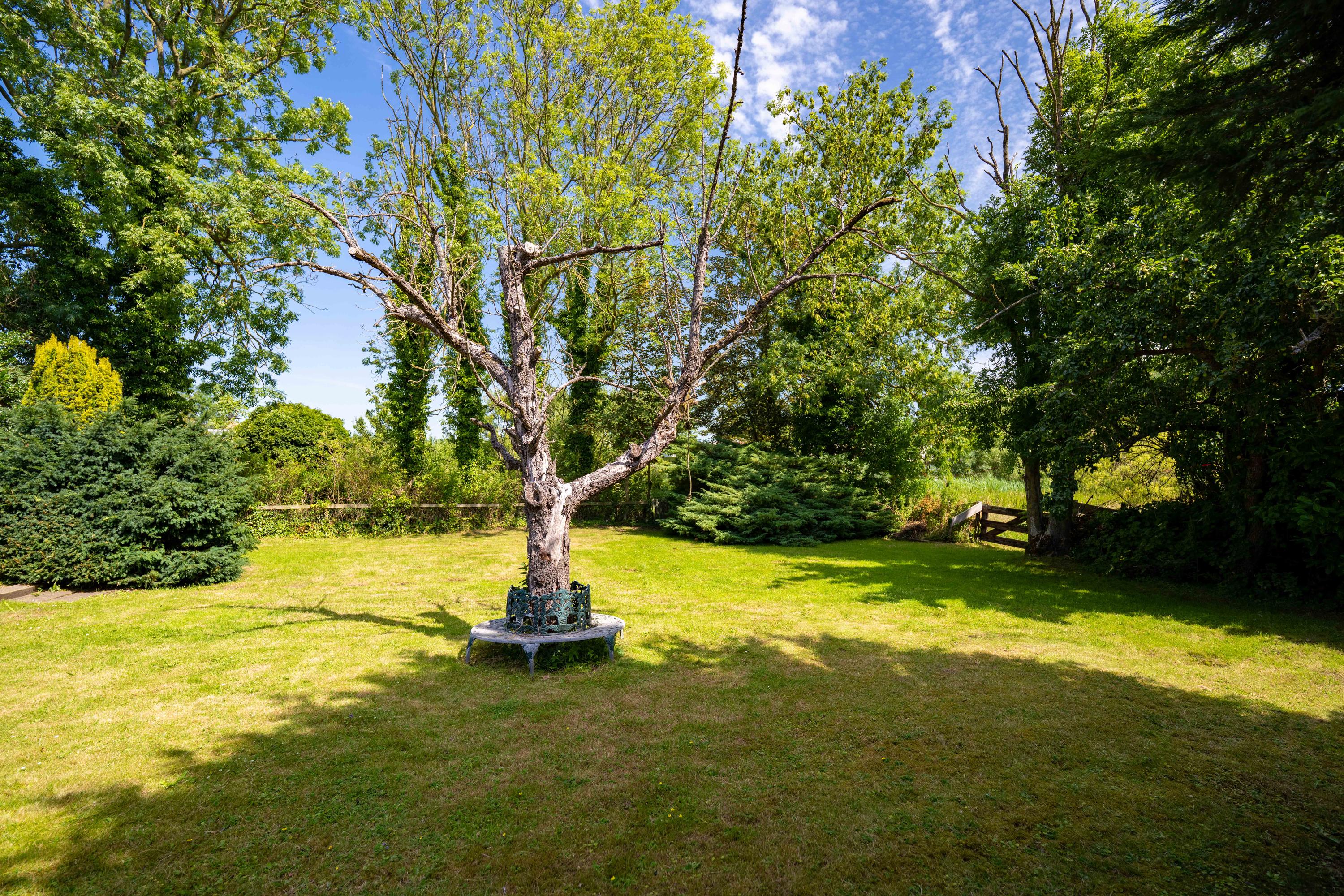 The design orients the residence to balance light, water, and privacy. Mature trees border the grounds, while an open meadow at the rear creates an uninterrupted pastoral view. Enclosed by water, the estate offers a tranquil environment for walking or keeping animals. Inside, the main level features an inviting hall, a spacious living zone divided by a central hearth, and a kitchen with a view to the terrace. The attached garage, accommodating four cars, integrates a secondary staircase with potential for private quarters or workspace above.