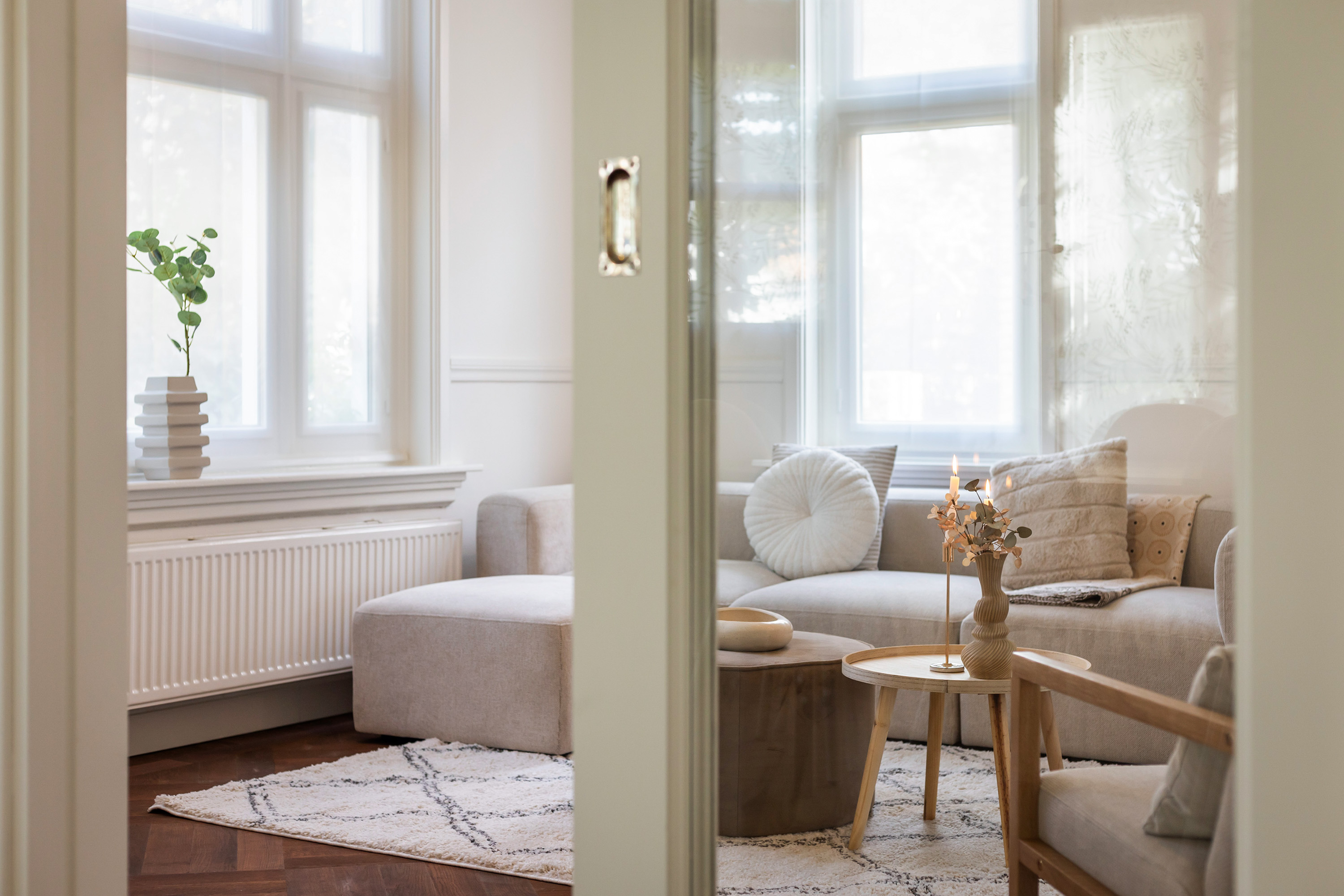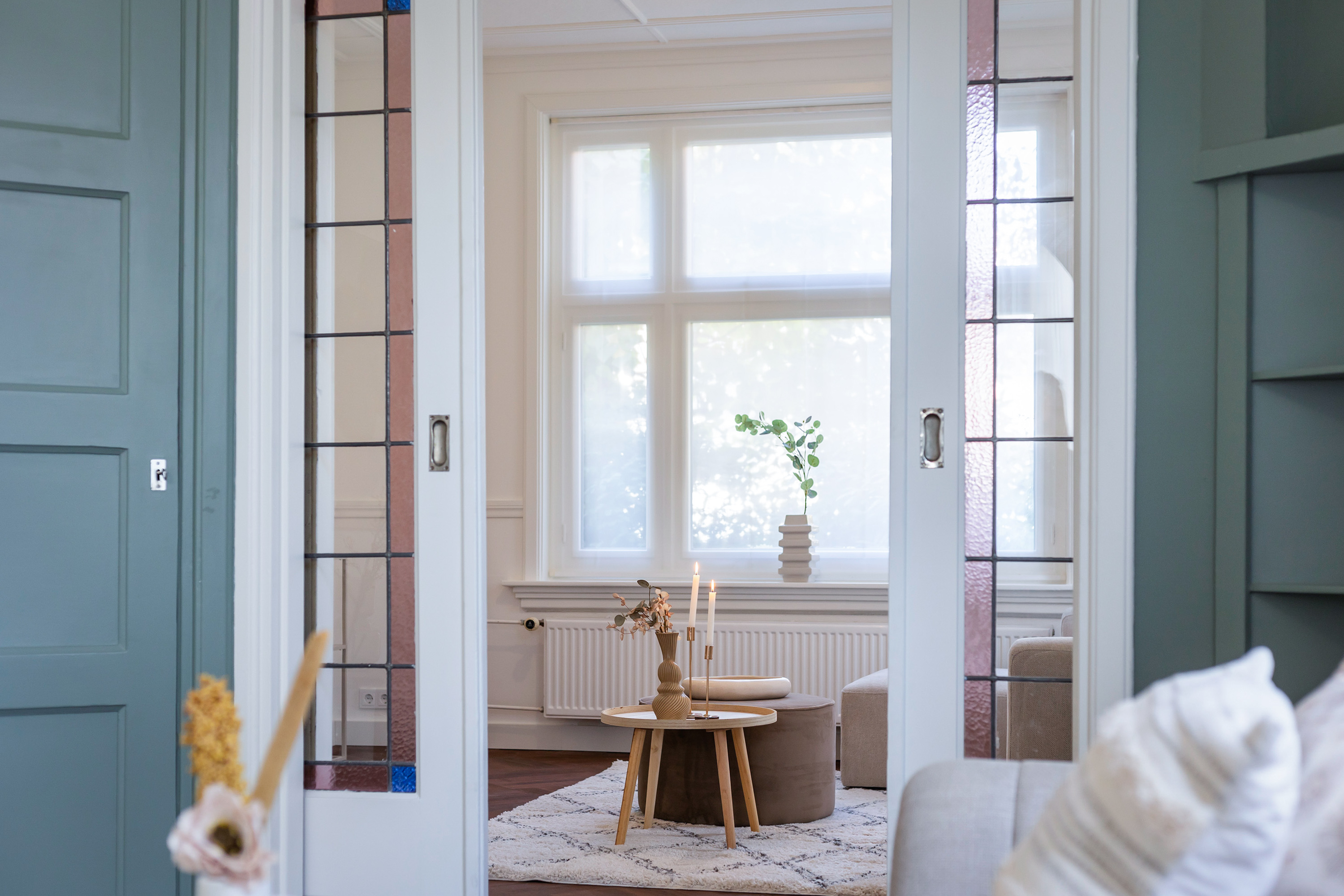 Inside, the atmosphere is warm, stylish and surprisingly spacious. The double front doors open onto a generous hallway with cloakroom space, access to the cellar and a modern toilet. From here you can reach both the kitchen-diner and the en-suite living rooms.