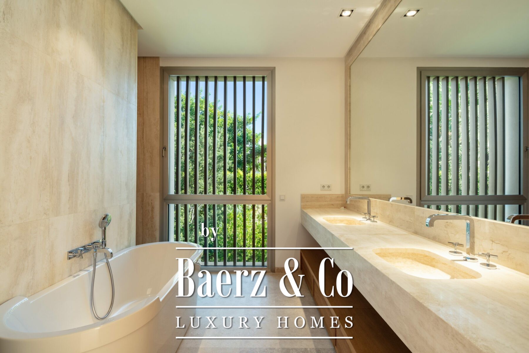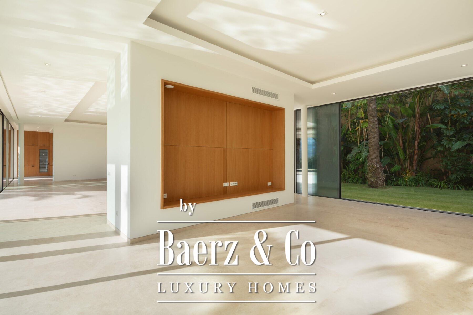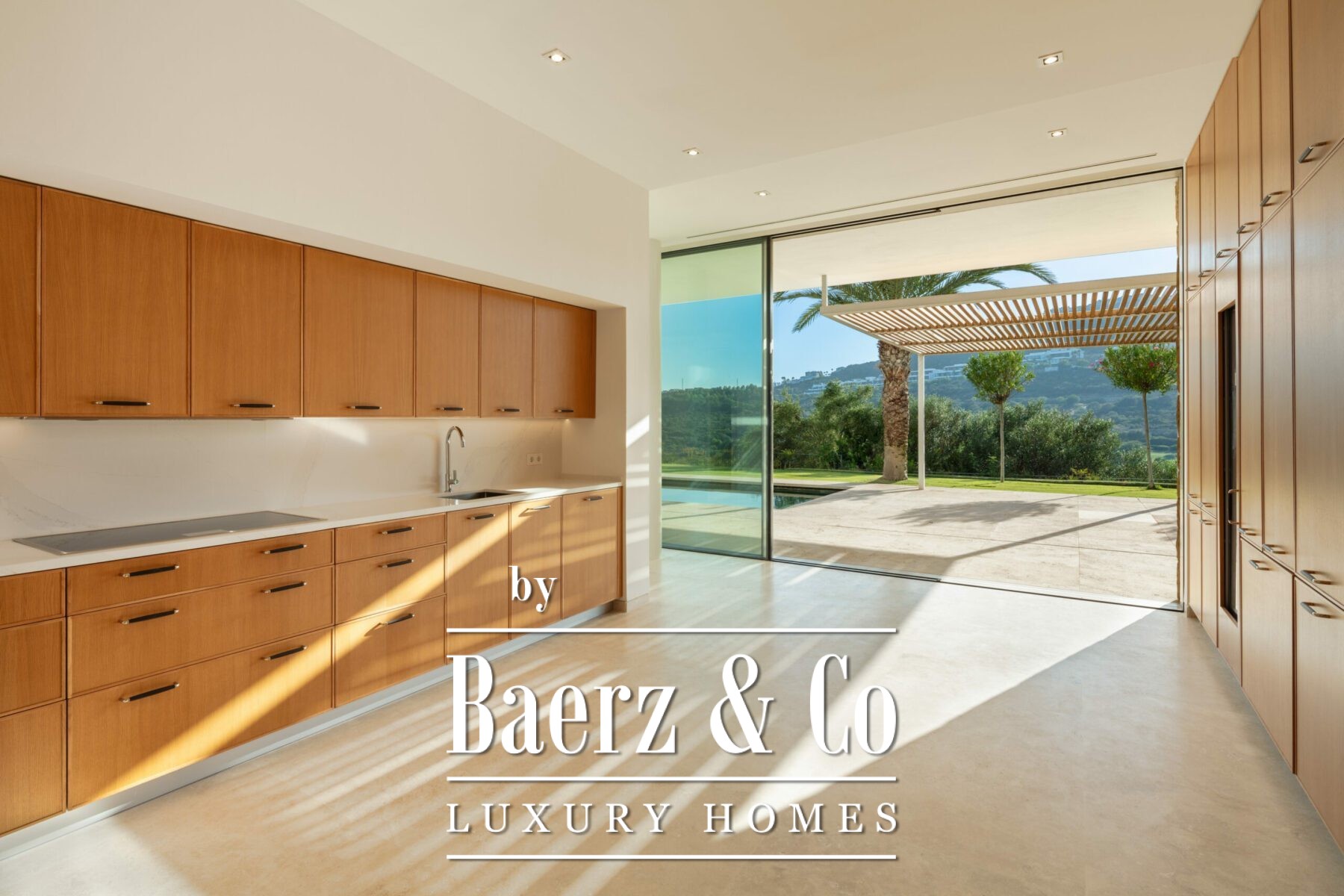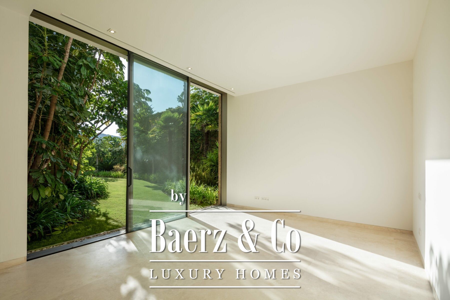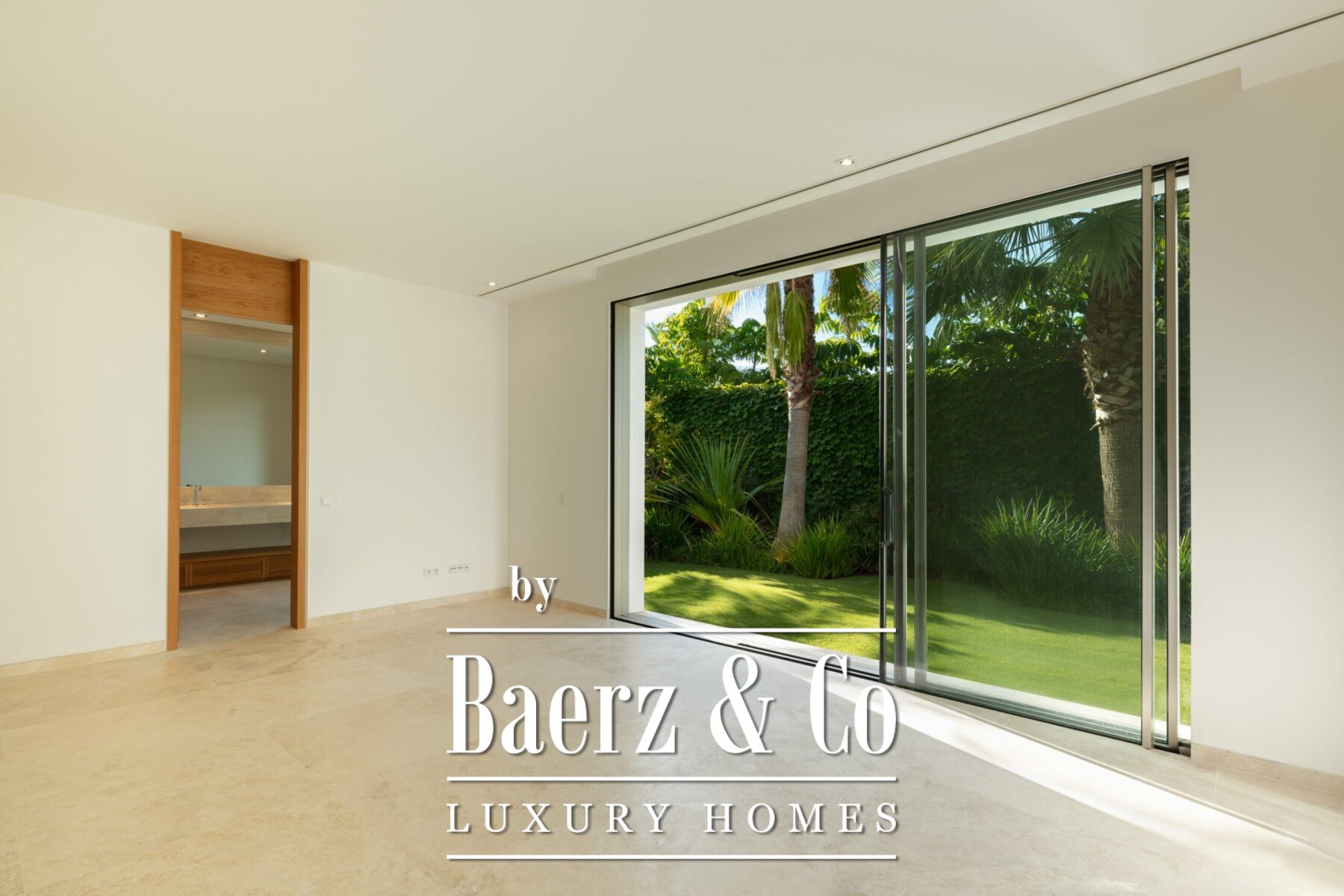 The villa’s architecture is precise and unburdened, allowing natural light to animate interiors defined by soft neutral tones and considered wooden accents. Four bedrooms are thoughtfully arranged upstairs, with a fifth on the ground floor for versatility. A Gaggenau-fitted kitchen and fluid living zones on the main level open to terraces through expansive glass doors, framing the garden and swimming pool in serene harmony.