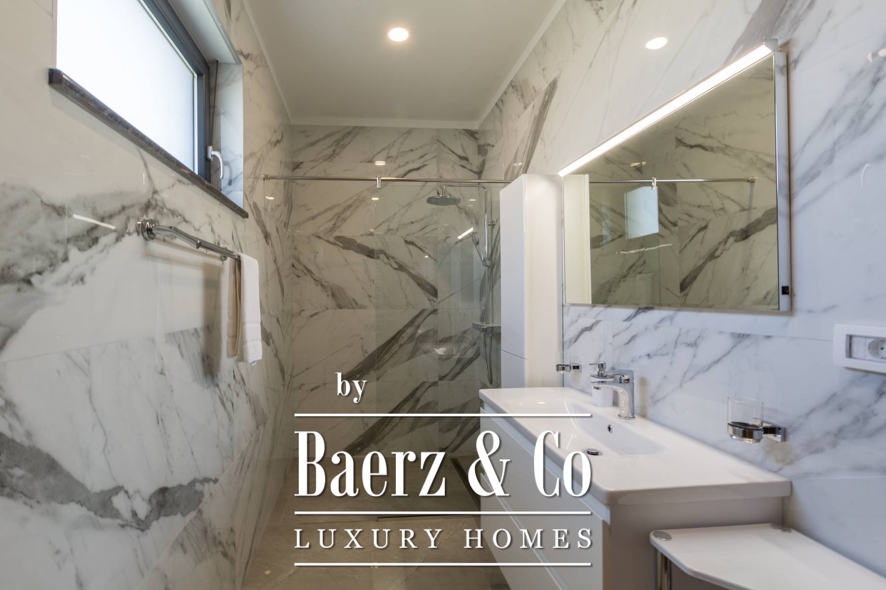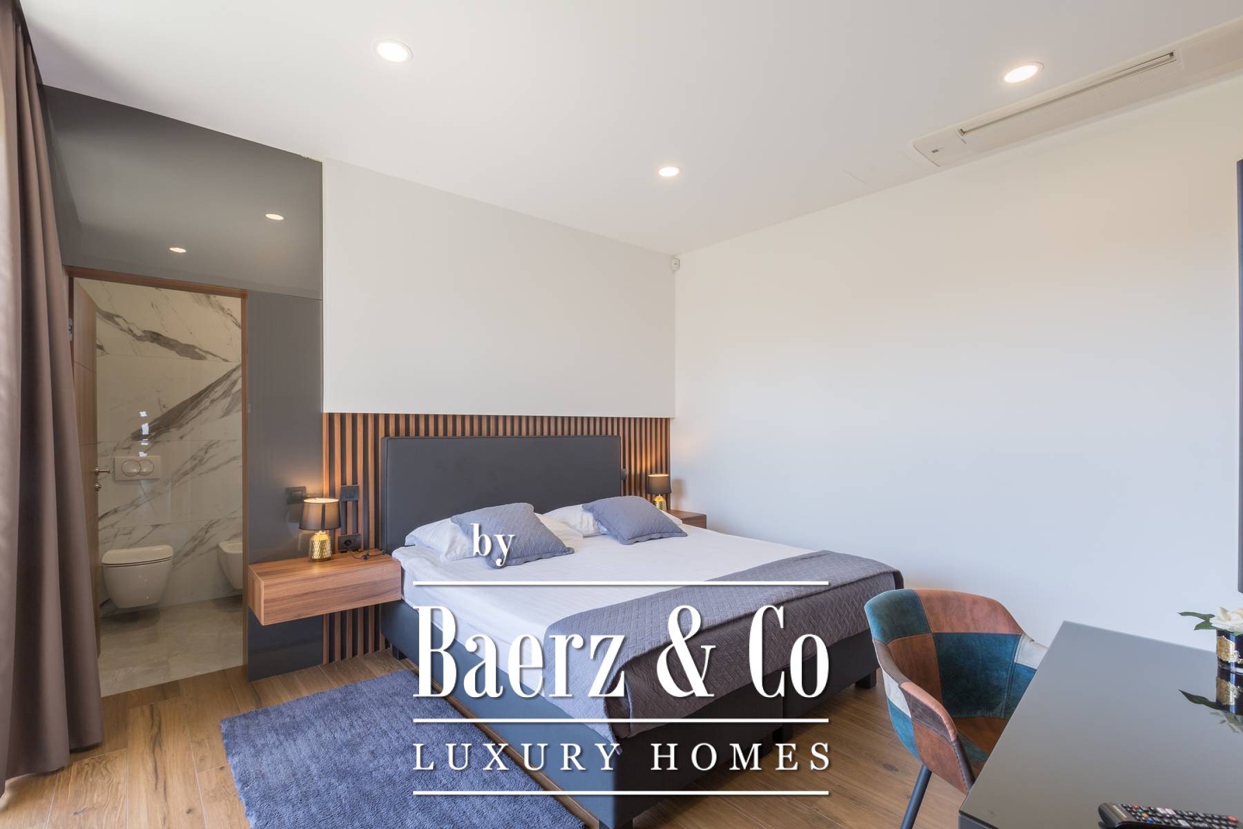 The villa balances privacy and conviviality, with four bedrooms each featuring en suite bathrooms and custom furnishings. Smart home controls extend seamlessly from climate to ambient shade, while underfloor heating and water-based heat pumps ensure comfort year-round. The principal bedroom on the ground floor is complemented by a utility room and modern kitchen with a central island. Upstairs, expansive terraces frame south-facing sea and garden vistas, while the top floor boasts a private fitness hall wrapped in glass, with a terrace prepared for a jacuzzi and sauna.