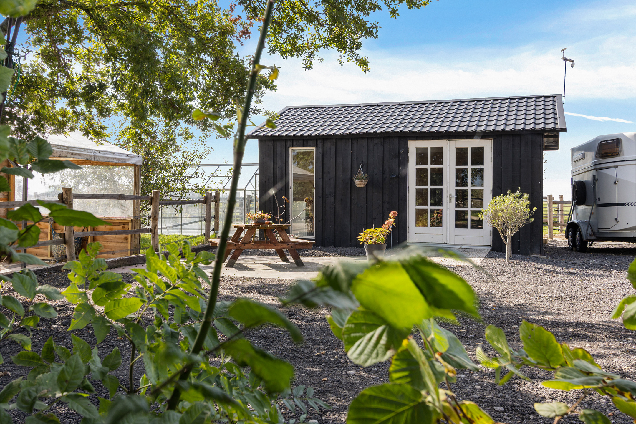The attractively insulated outbuilding is positioned in a private setting with views over the paddock paradise and the surrounding meadows. A delightful space with a kitchenette, wood-burning stove, and hot and cold running water, ideal as a studio, home office, or guest accommodation.