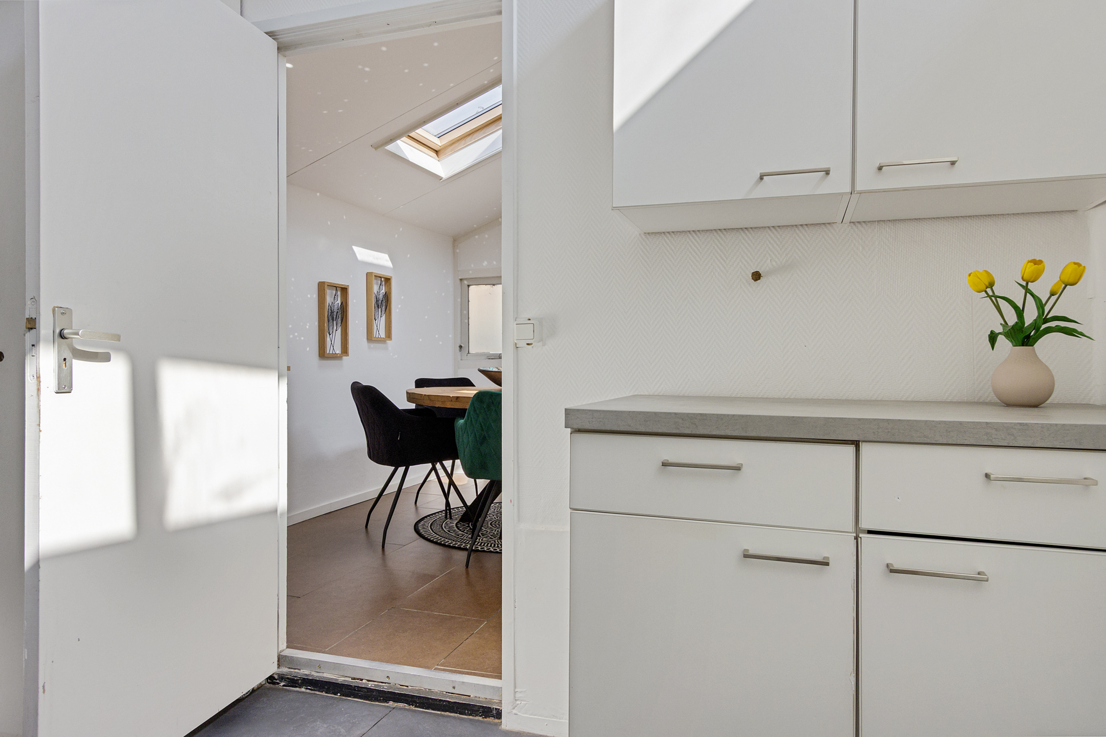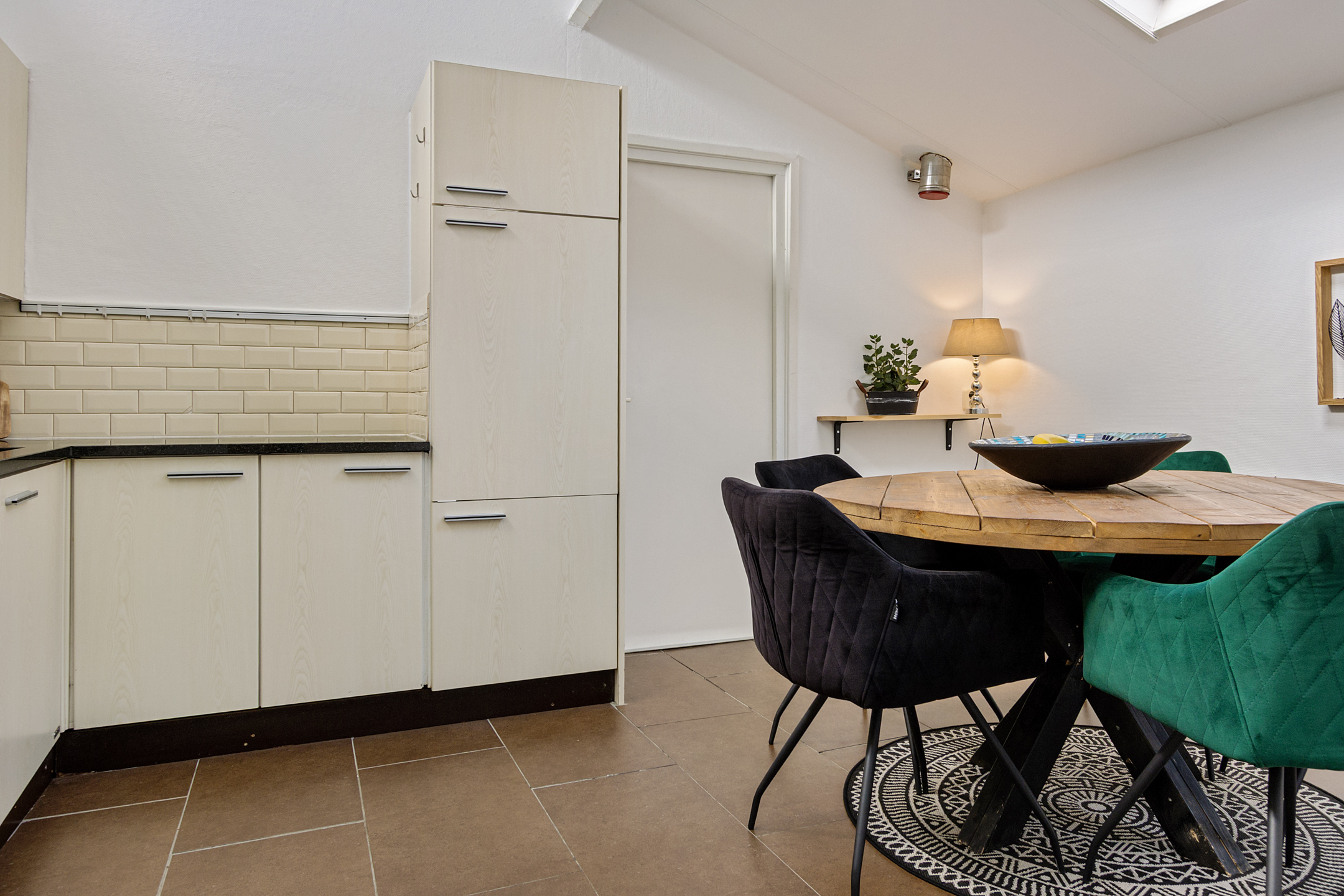 The cosy kitchen is finished in light tones and equipped with appliances from 2024.