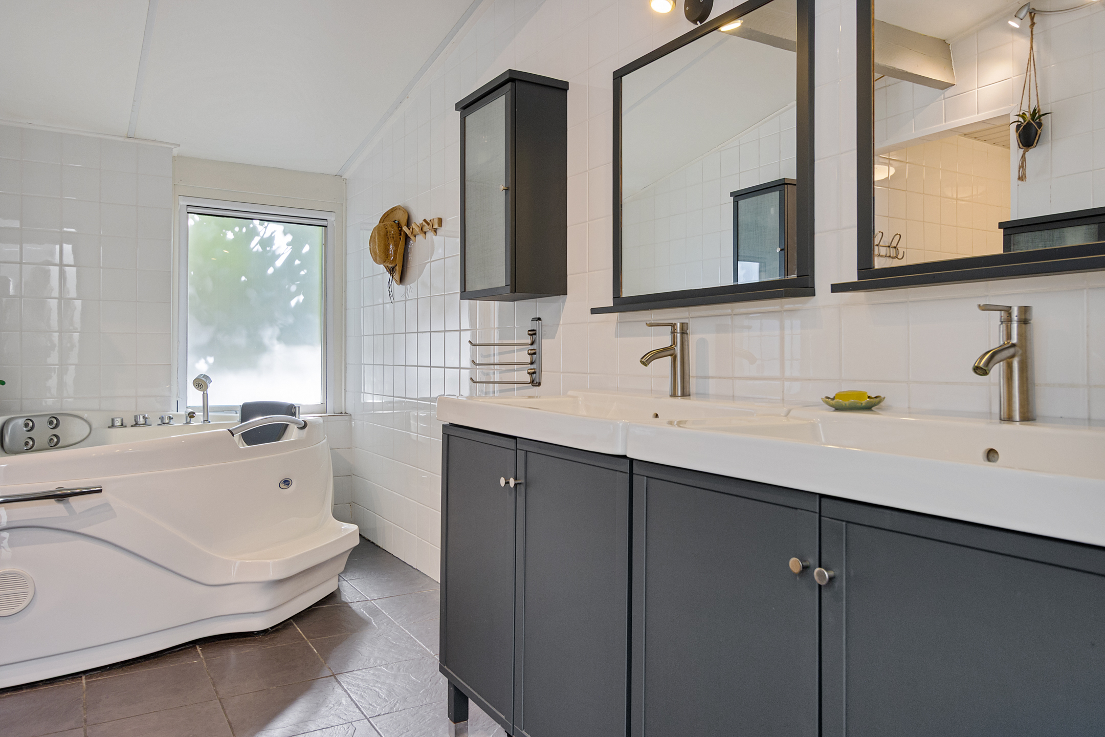 The master bedroom is located at the rear of the house and overlooks the stables. The ground-floor bathroom features a walk-in shower, whirlpool bath, double washbasin, and sauna.