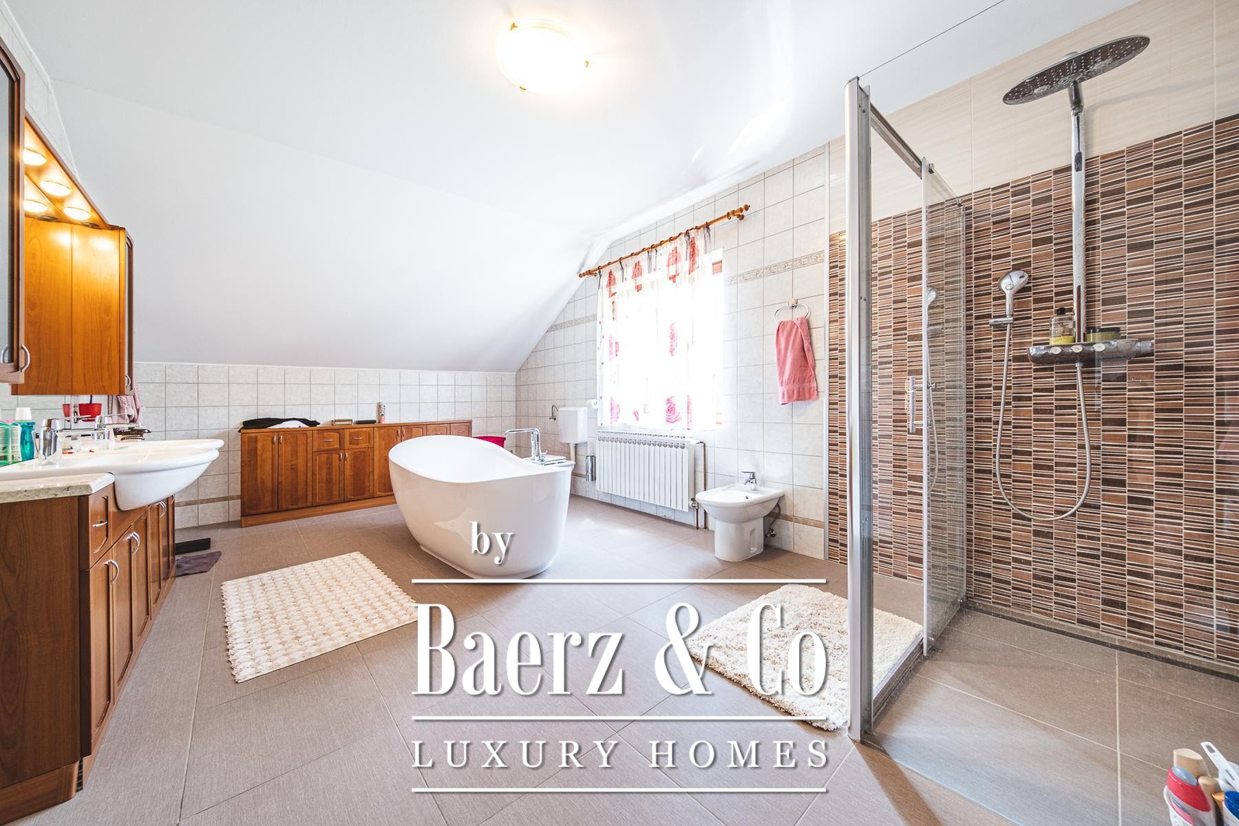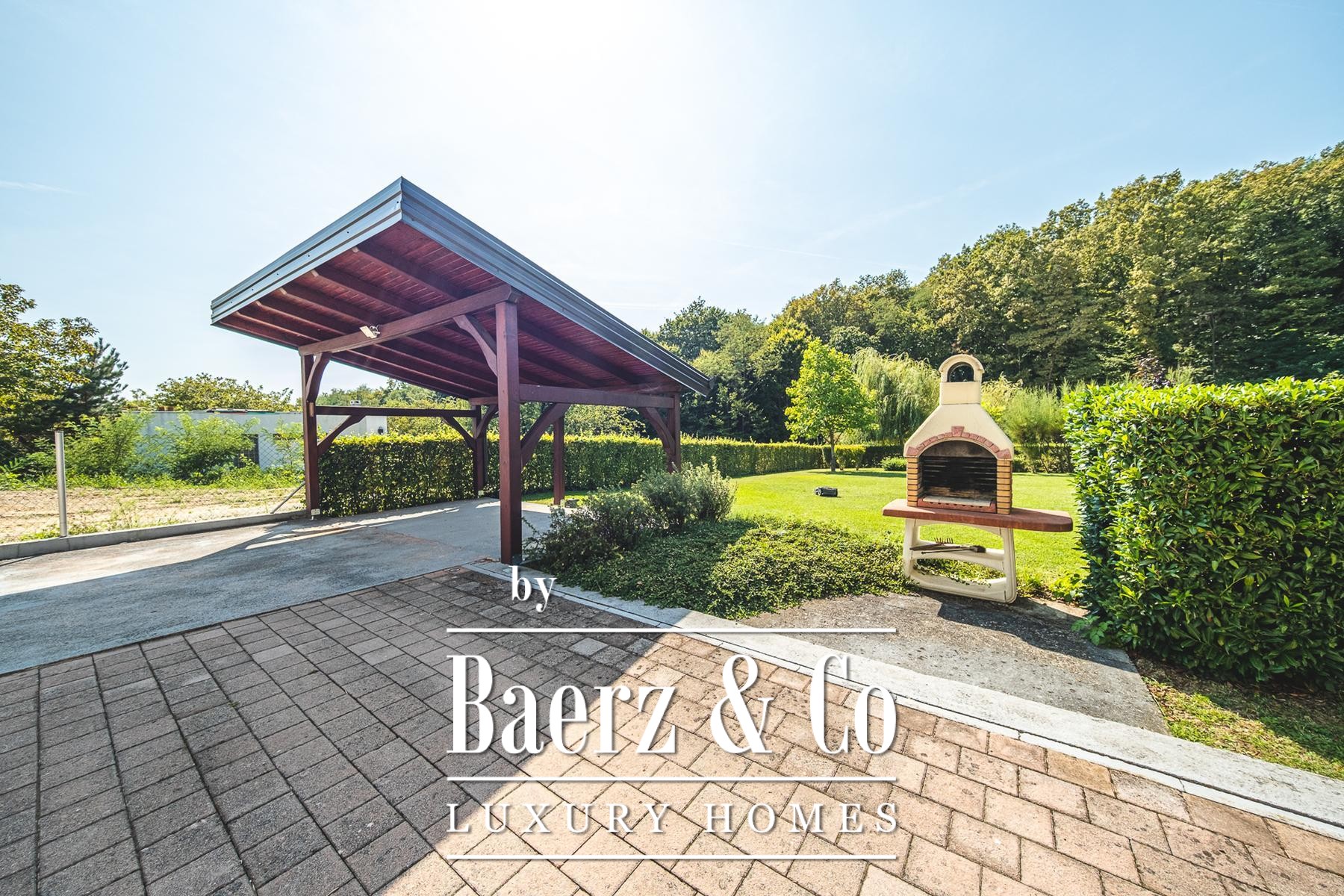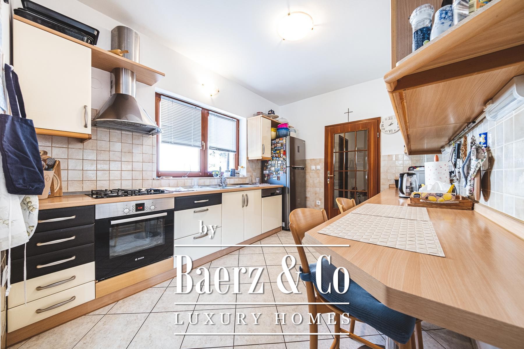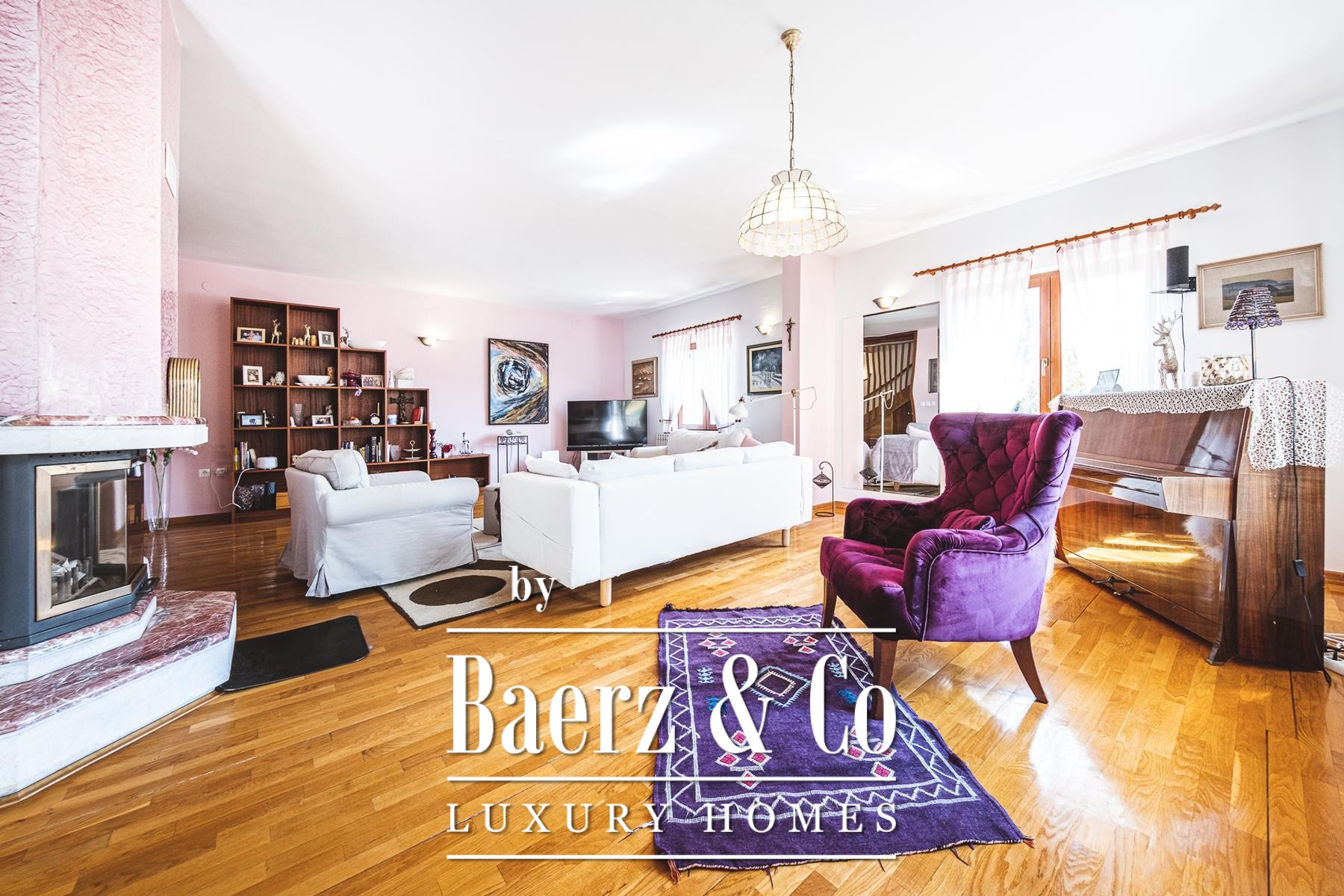 bedroom with bathroom and dressing room. Excellent layout of the rooms and extremely good orientation contribute to the brightness of all rooms, especially the living room. A semi-furnished, fully equipped kitchen and plenty of built-in furniture are for sale. Beautifully landscaped garden, heated access road to the garage and parking lot. Air-conditioned, underfloor heating in bathrooms, fireplace... Located in an idyllic location tucked away from the main road, close to public transport, kindergarten, primary school and all necessary facilities. All other information on request.