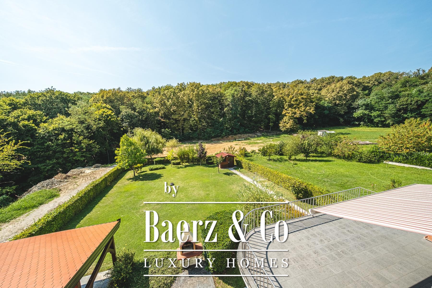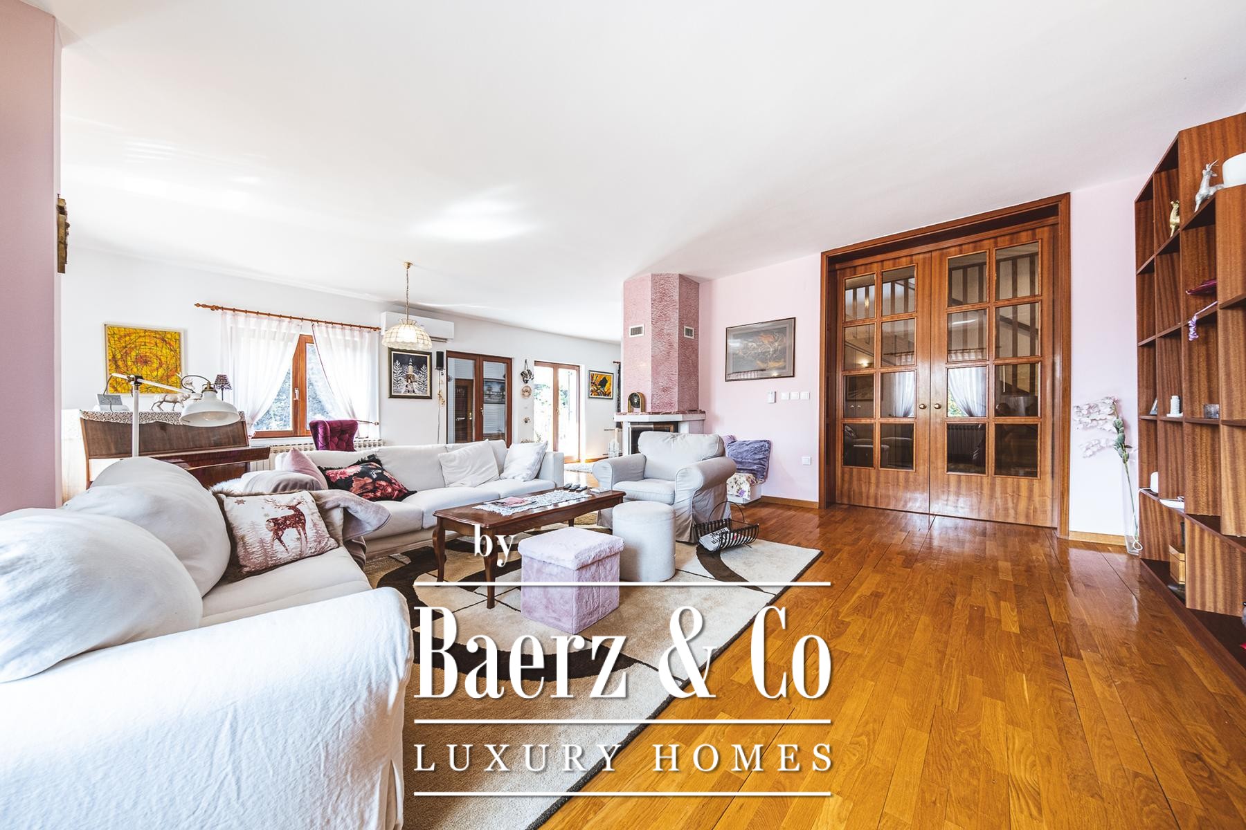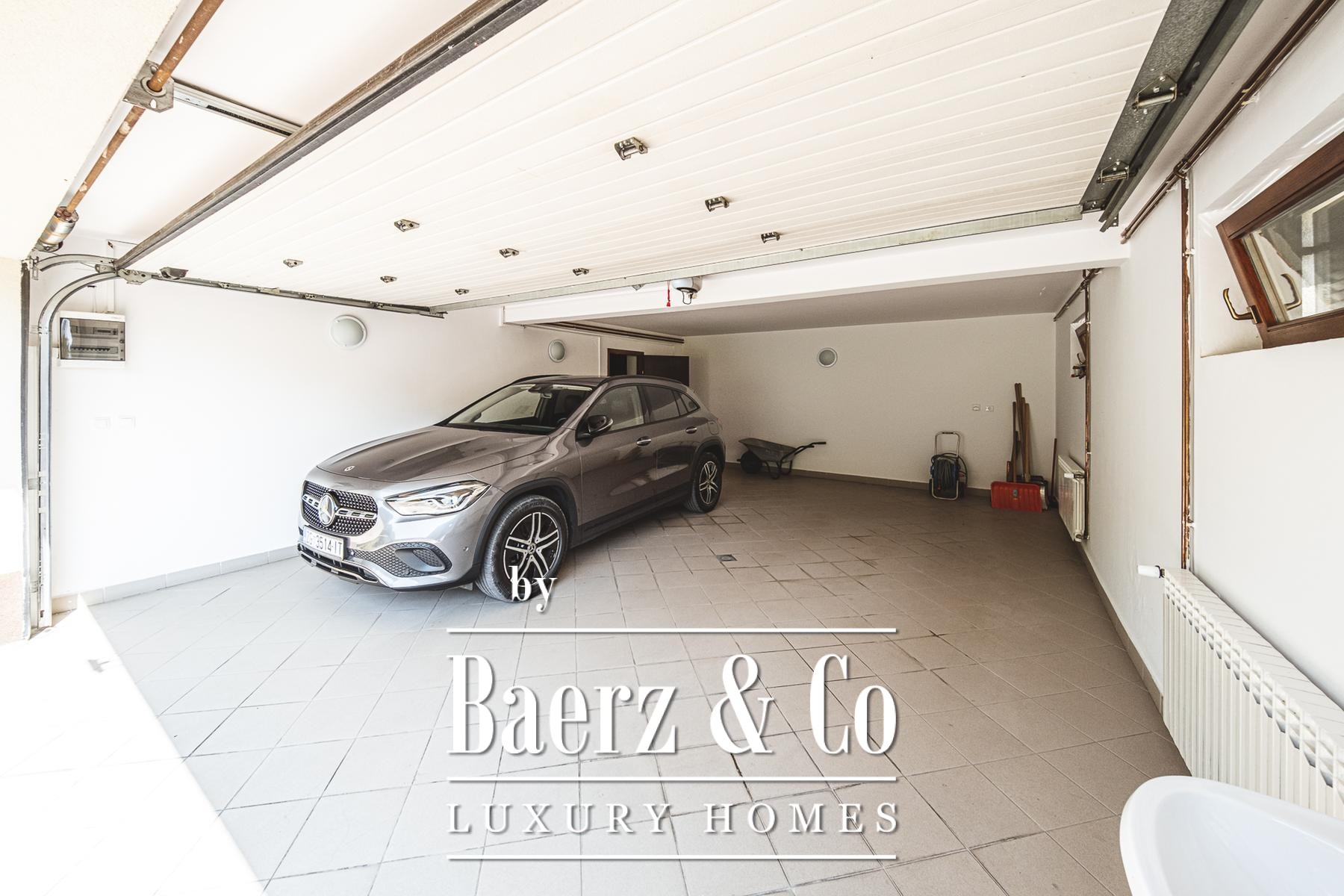 bedroom with bathroom and dressing room. Excellent layout of the rooms and extremely good orientation contribute to the brightness of all rooms, especially the living room. A semi-furnished, fully equipped kitchen and plenty of built-in furniture are for sale. Beautifully landscaped garden, heated access road to the garage and parking lot. Air-conditioned, underfloor heating in bathrooms, fireplace... Located in an idyllic location tucked away from the main road, close to public transport, kindergarten, primary school and all necessary facilities. All other information on request.