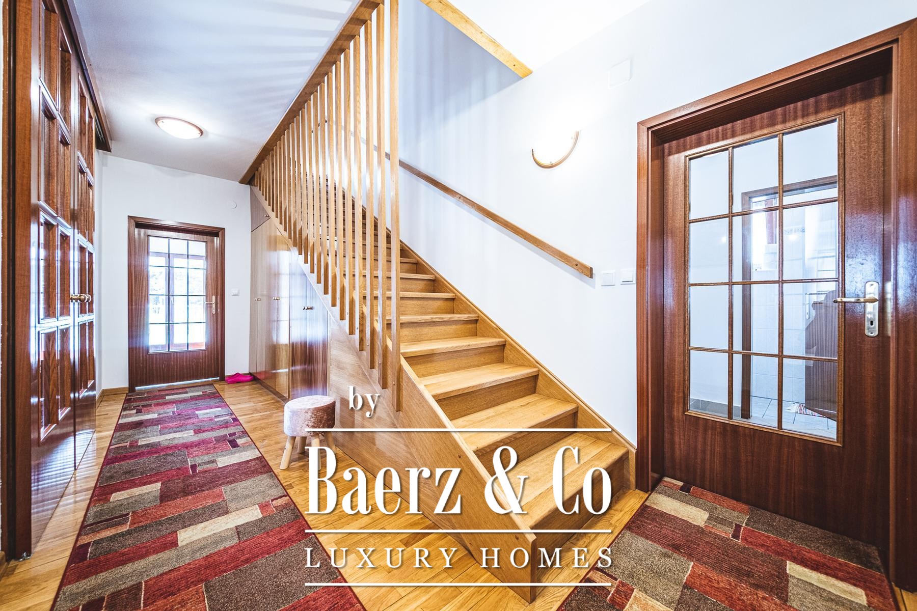 Gornja Dubrava, a beautiful house of 450 m2 located on a plot of land of 1133 m2. Arranged yard and garden, double garage, possibility to park several vehicles in the yard. An incredible peaceful location, surrounded by nature, ideal for a peaceful family life. It is built on 3 floors. Basement: hallway, storage, additional room (room), double garage with direct access to the house. Ground floor: entrance hall, spacious living room with open floor plan dining room with access to the terrace, kitchen, bedroom/study, guest toilet, staircase. First floor: hallway, two bedrooms, bathroom, master