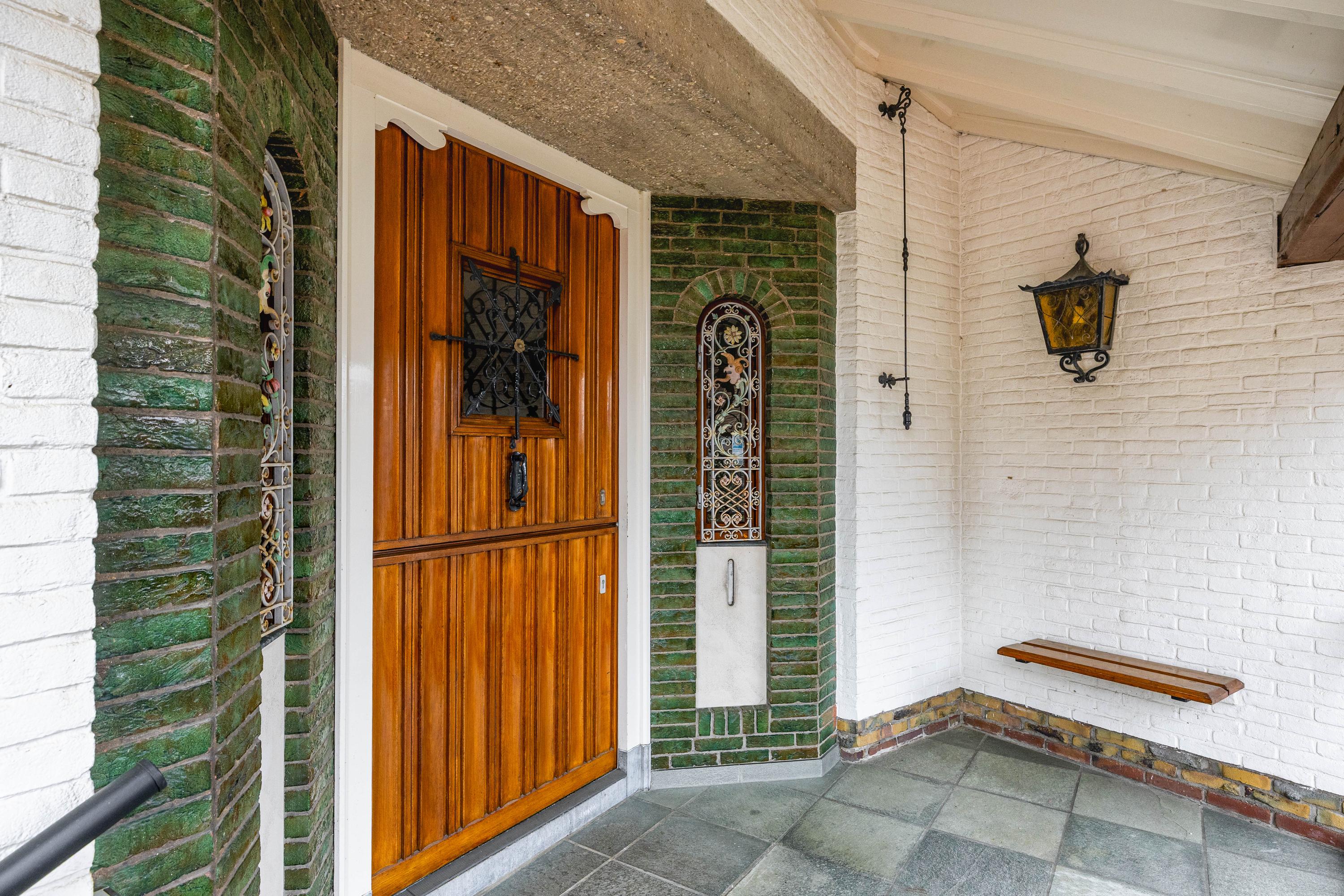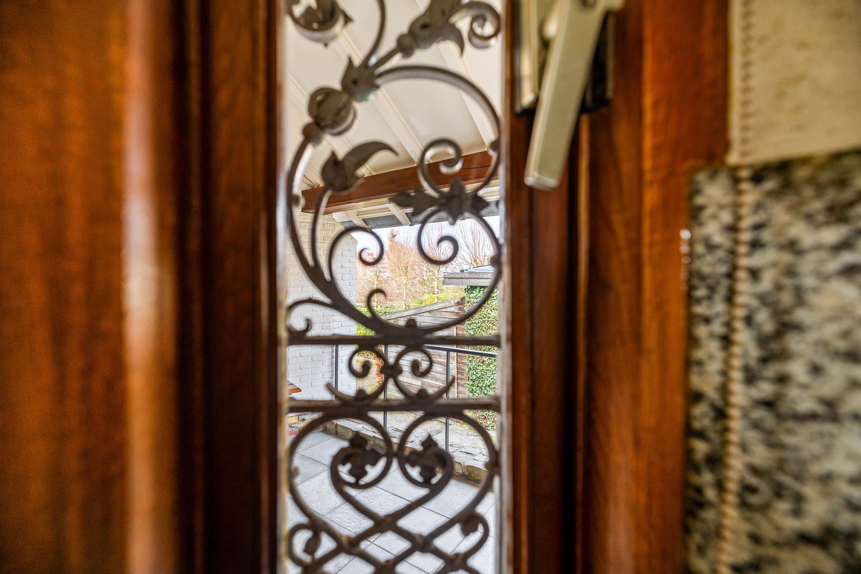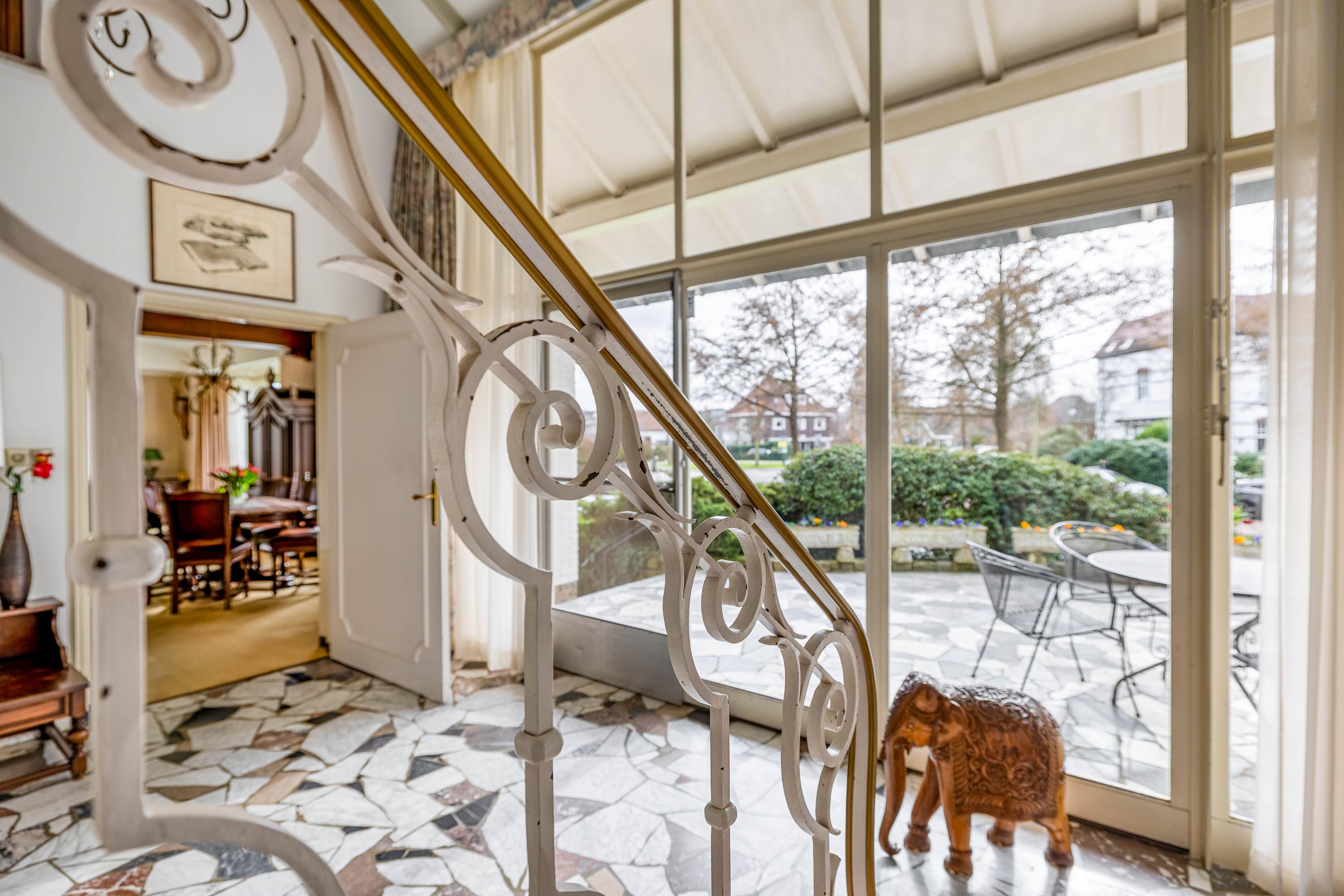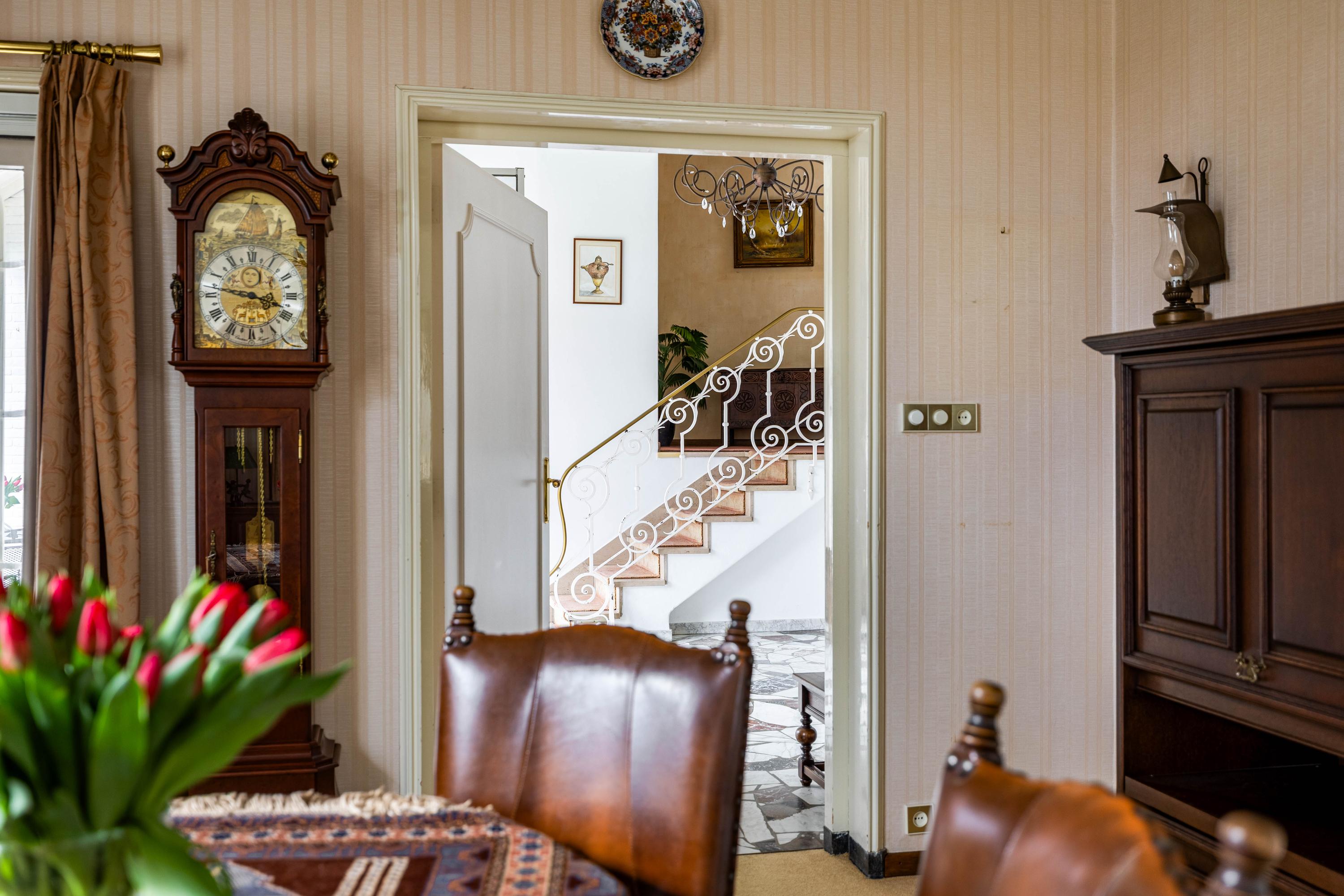 The living room is spacious and stately, featuring a fireplace and a bay window with a large pane of glass. Due to the elevated position of the house, you enjoy views over the park on two sides. Light floods in generously thanks to the large windows on the sunny side. Adjacent is the dining room, with a door to the terrace and to the kitchen. The enclosed kitchen is laid out in an L-shape and features built-in appliances and fixed cupboard space.