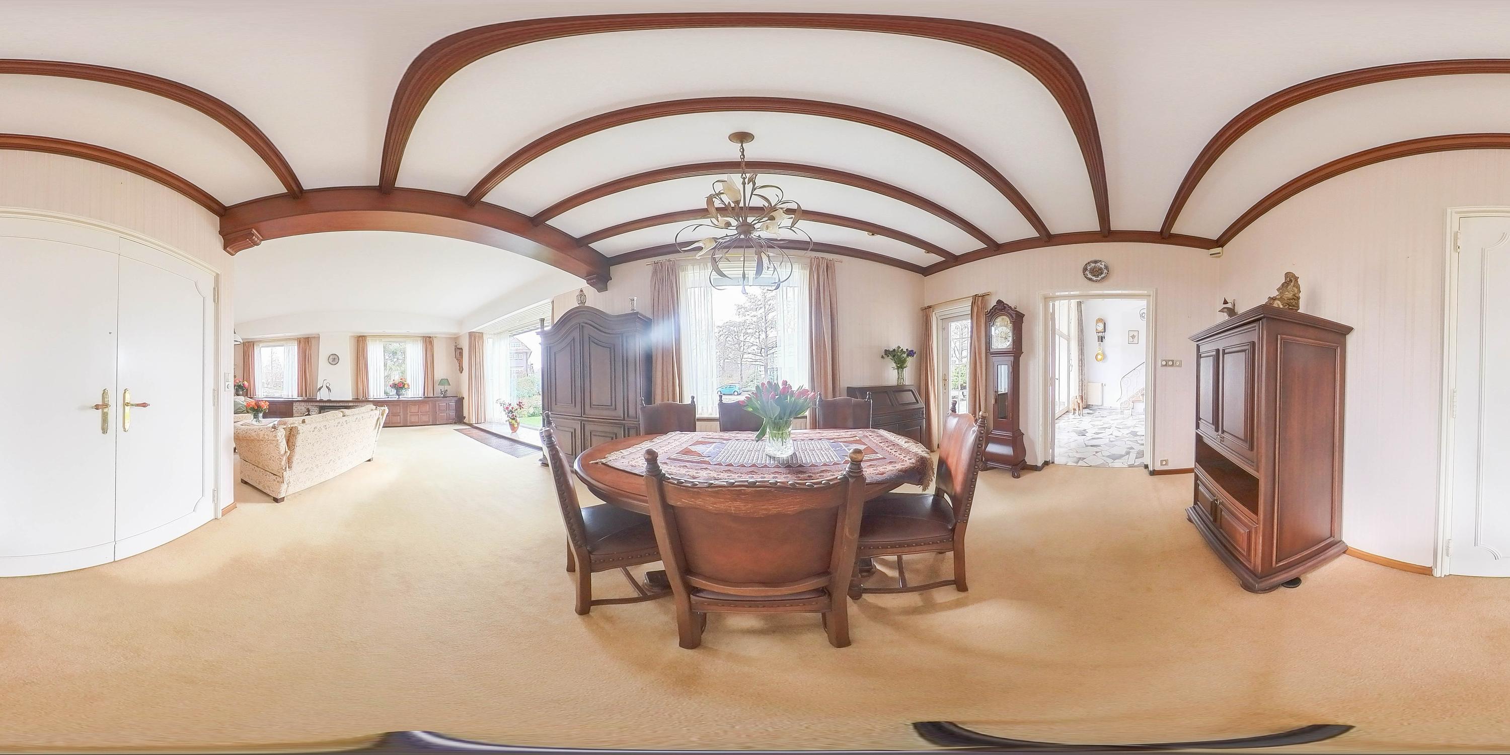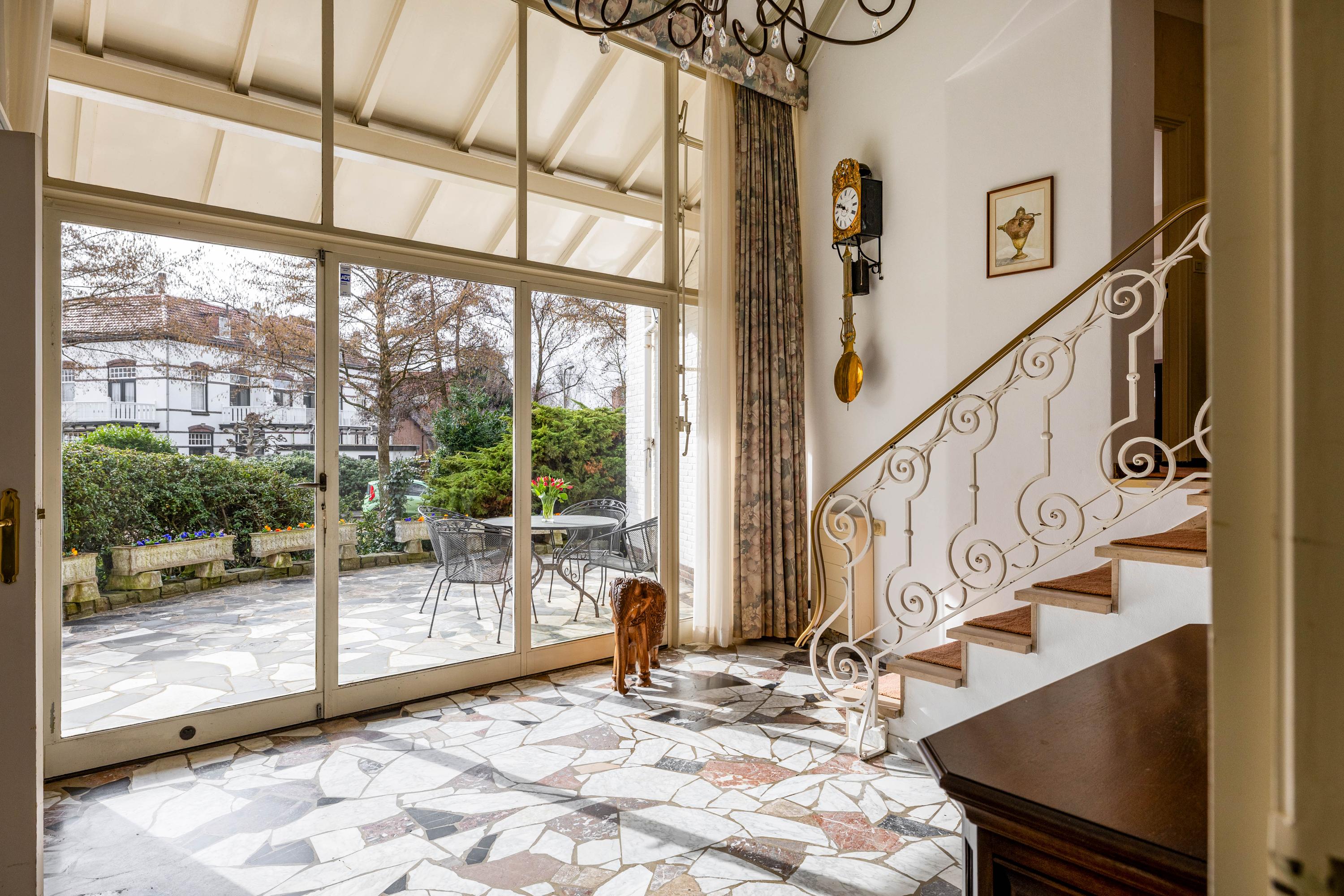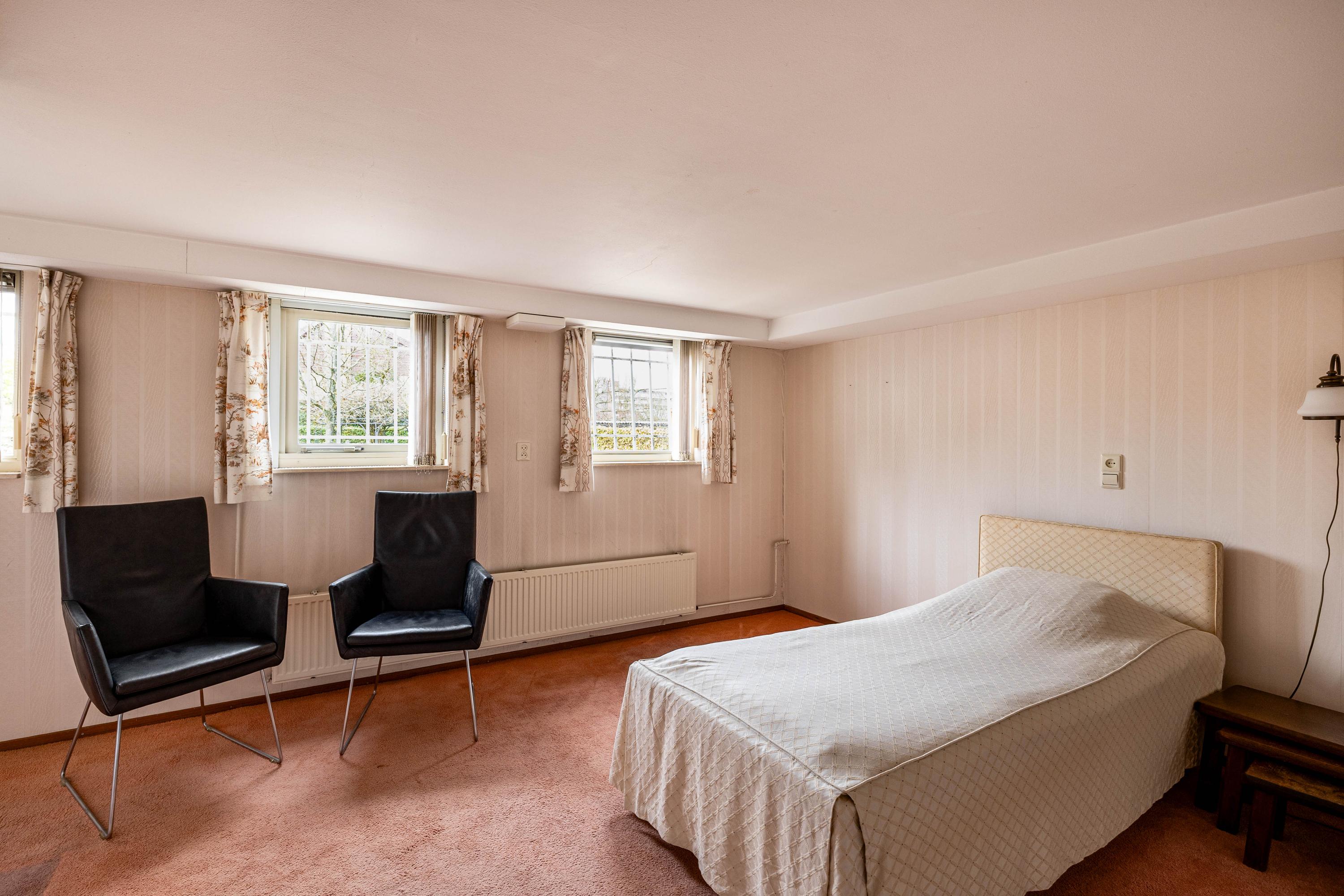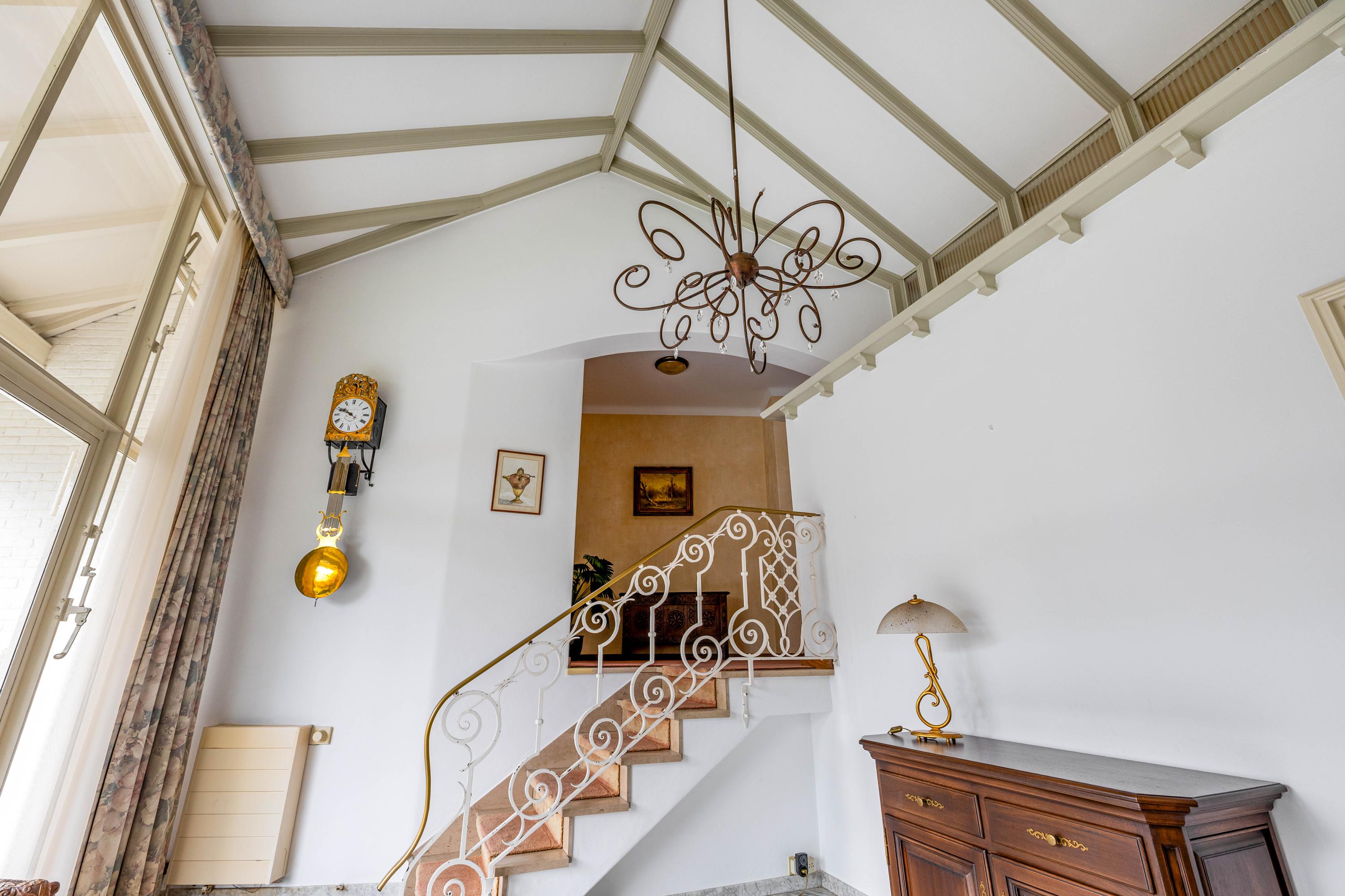 The living room is spacious and stately, featuring a fireplace and a bay window with a large pane of glass. Due to the elevated position of the house, you enjoy views over the park on two sides. Light floods in generously thanks to the large windows on the sunny side. Adjacent is the dining room, with a door to the terrace and to the kitchen. The enclosed kitchen is laid out in an L-shape and features built-in appliances and fixed cupboard space.