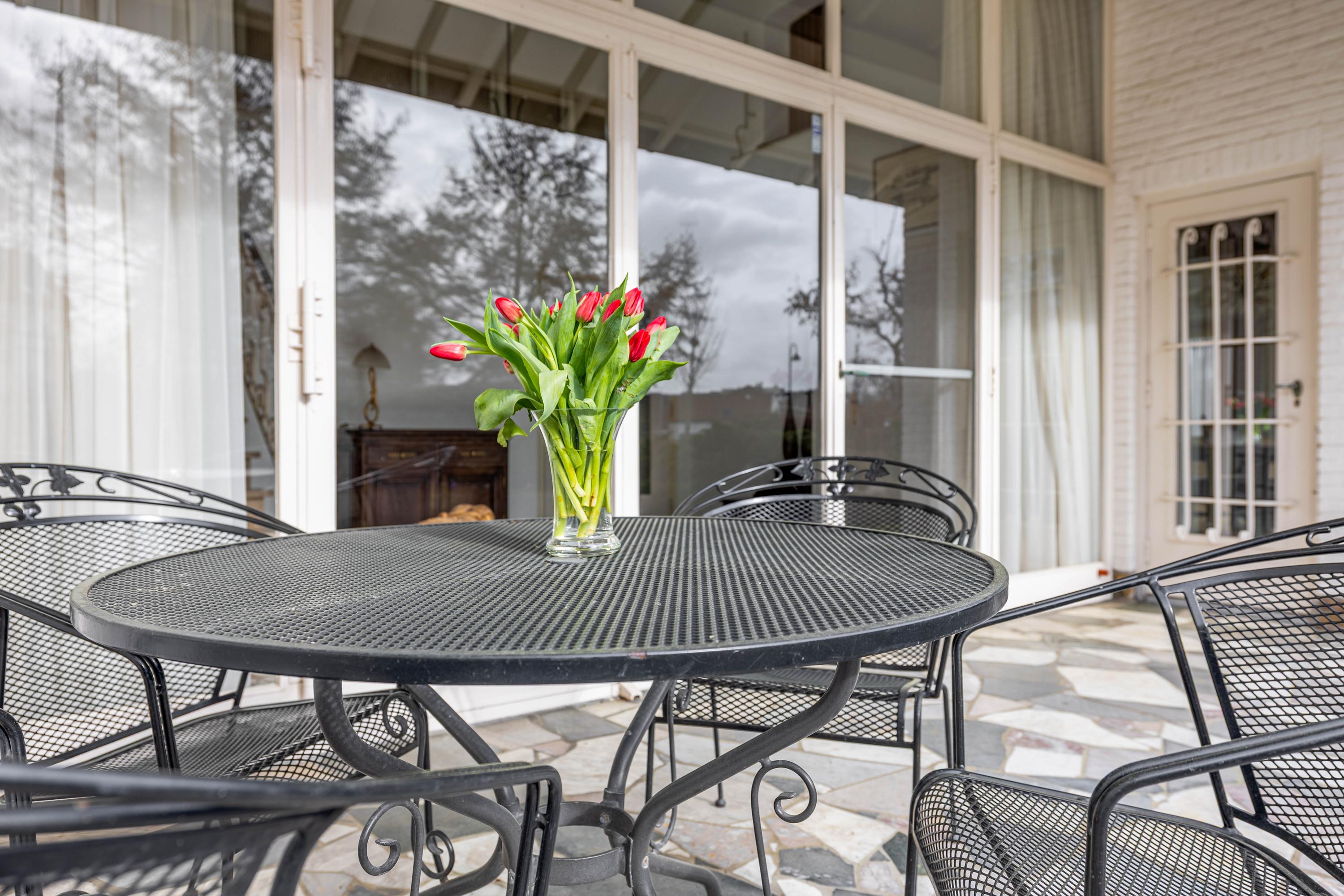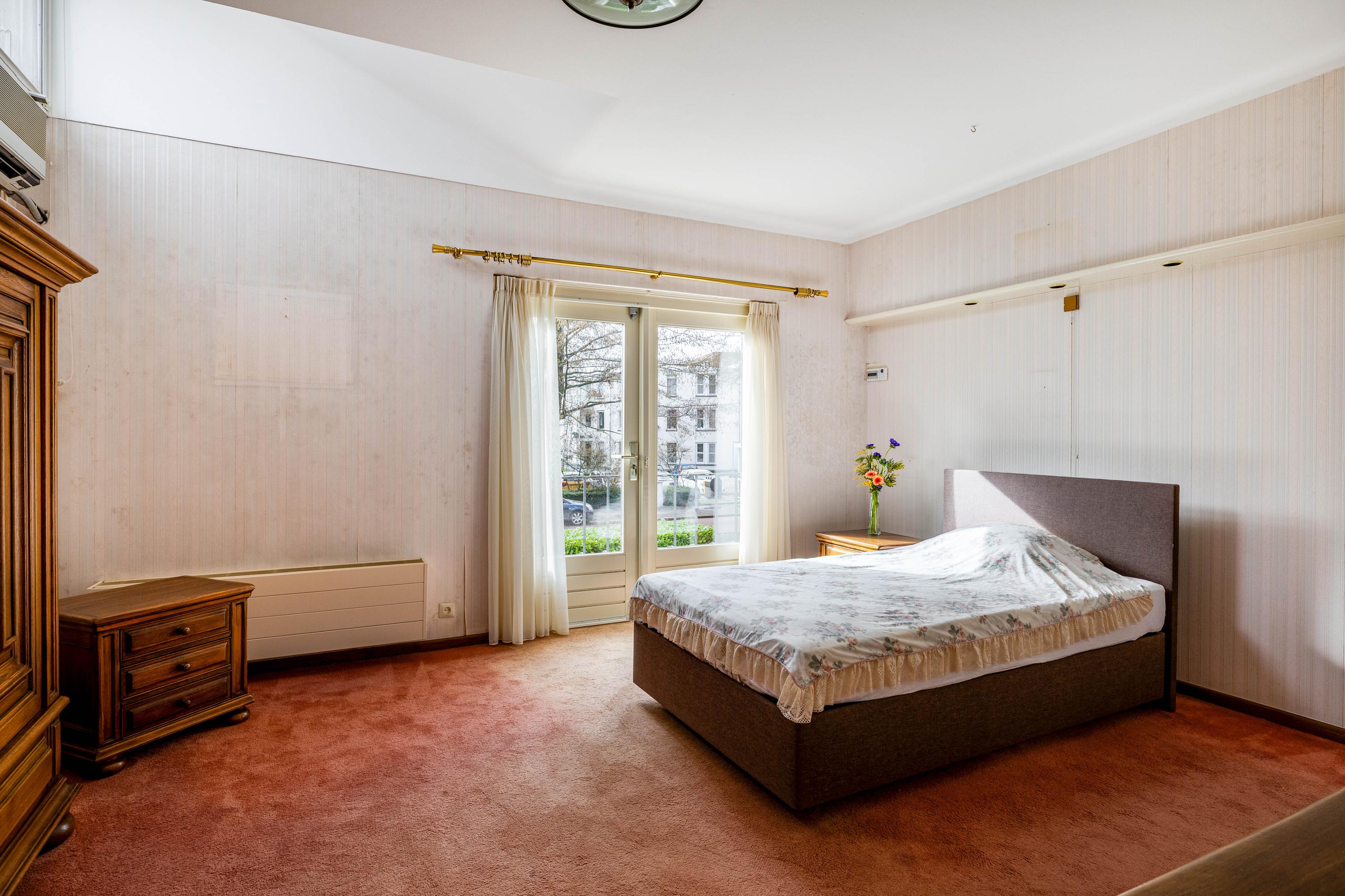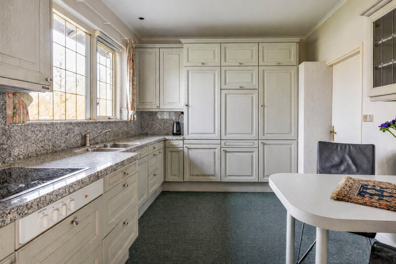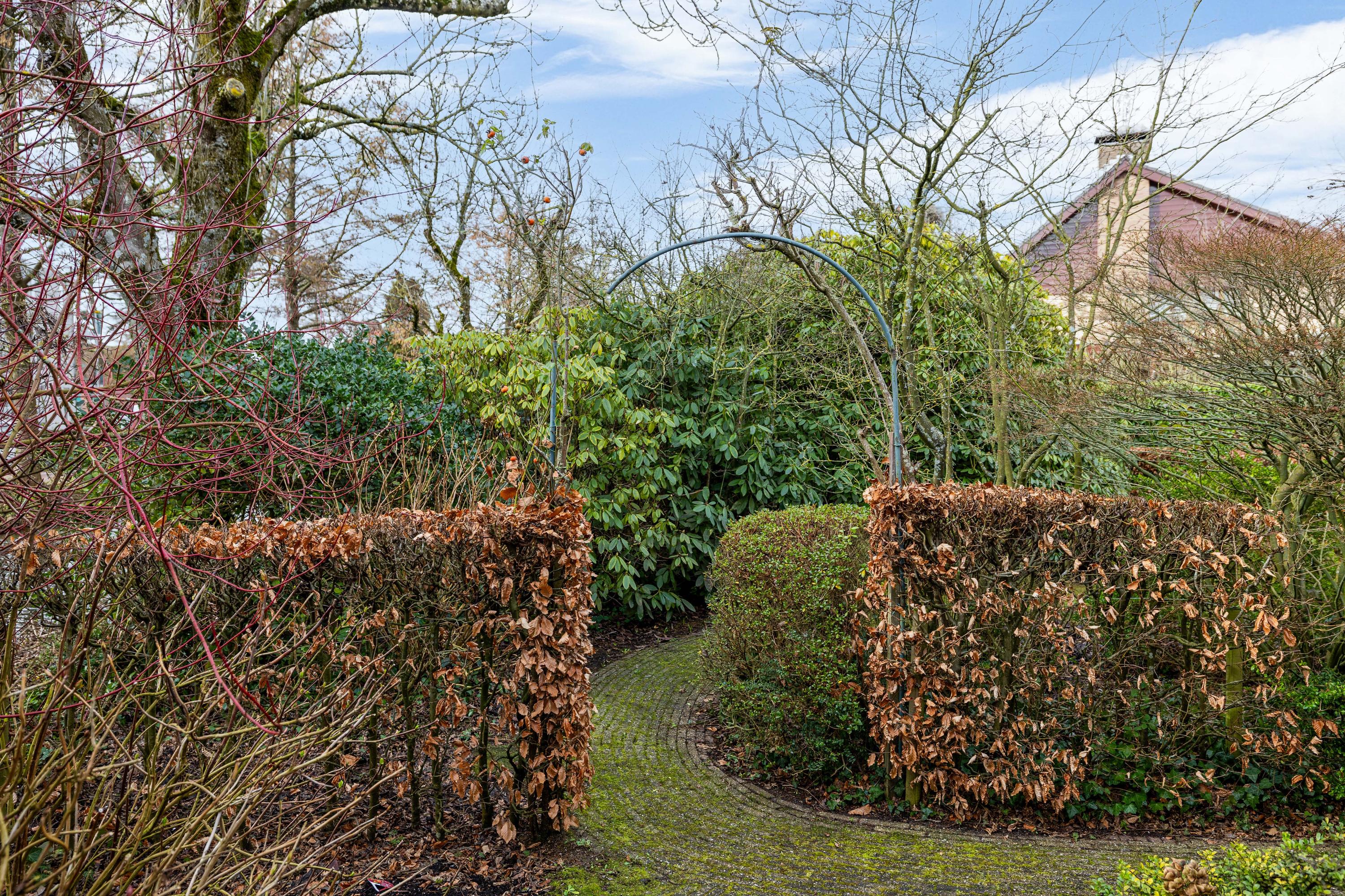 The living room is spacious and stately, featuring a fireplace and a bay window with a large pane of glass. Due to the elevated position of the house, you enjoy views over the park on two sides. Light floods in generously thanks to the large windows on the sunny side. Adjacent is the dining room, with a door to the terrace and to the kitchen. The enclosed kitchen is laid out in an L-shape and features built-in appliances and fixed cupboard space.