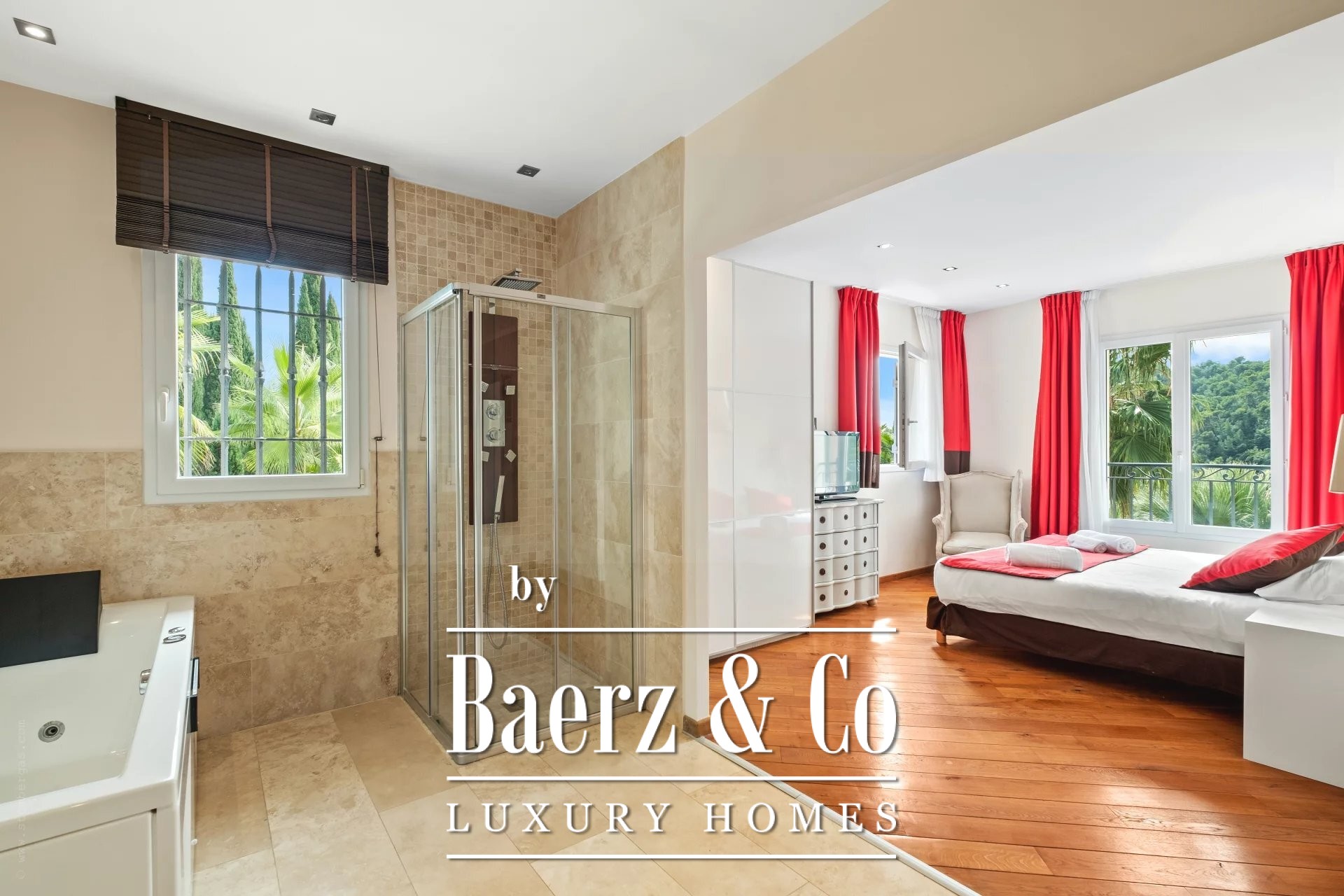 Outdoors, a heated swimming pool and pool house are sheltered within lush vegetation, accompanied by a broad terrace for private gatherings. Sea and mountain views add an exceptional sense of place, while a double garage, alarm system, videophone, and gated entry ensure both security and discretion. This luxury mansion for sale in Grasse is designed for those who appreciate light, space, and serenity at the heart of Provence.
