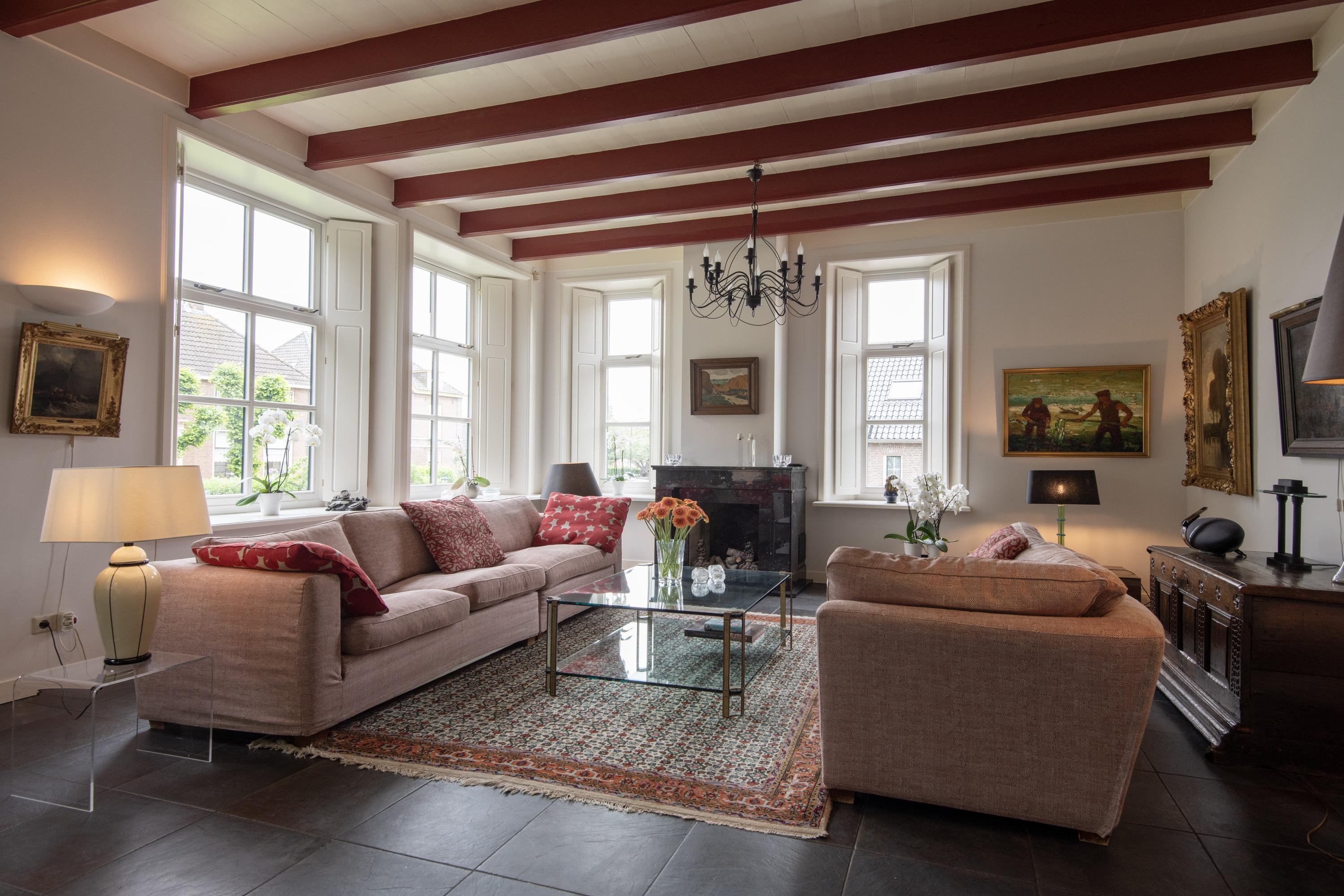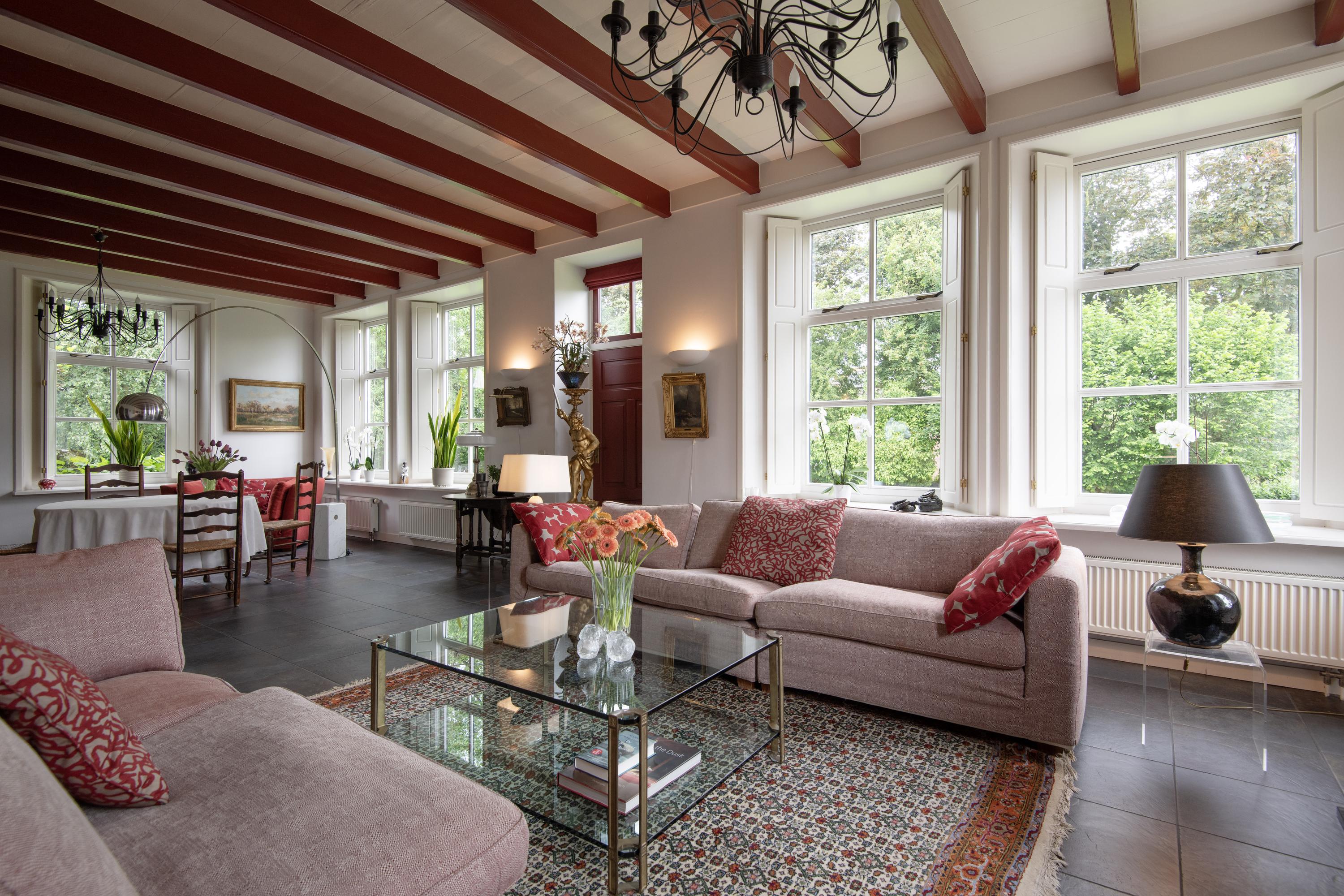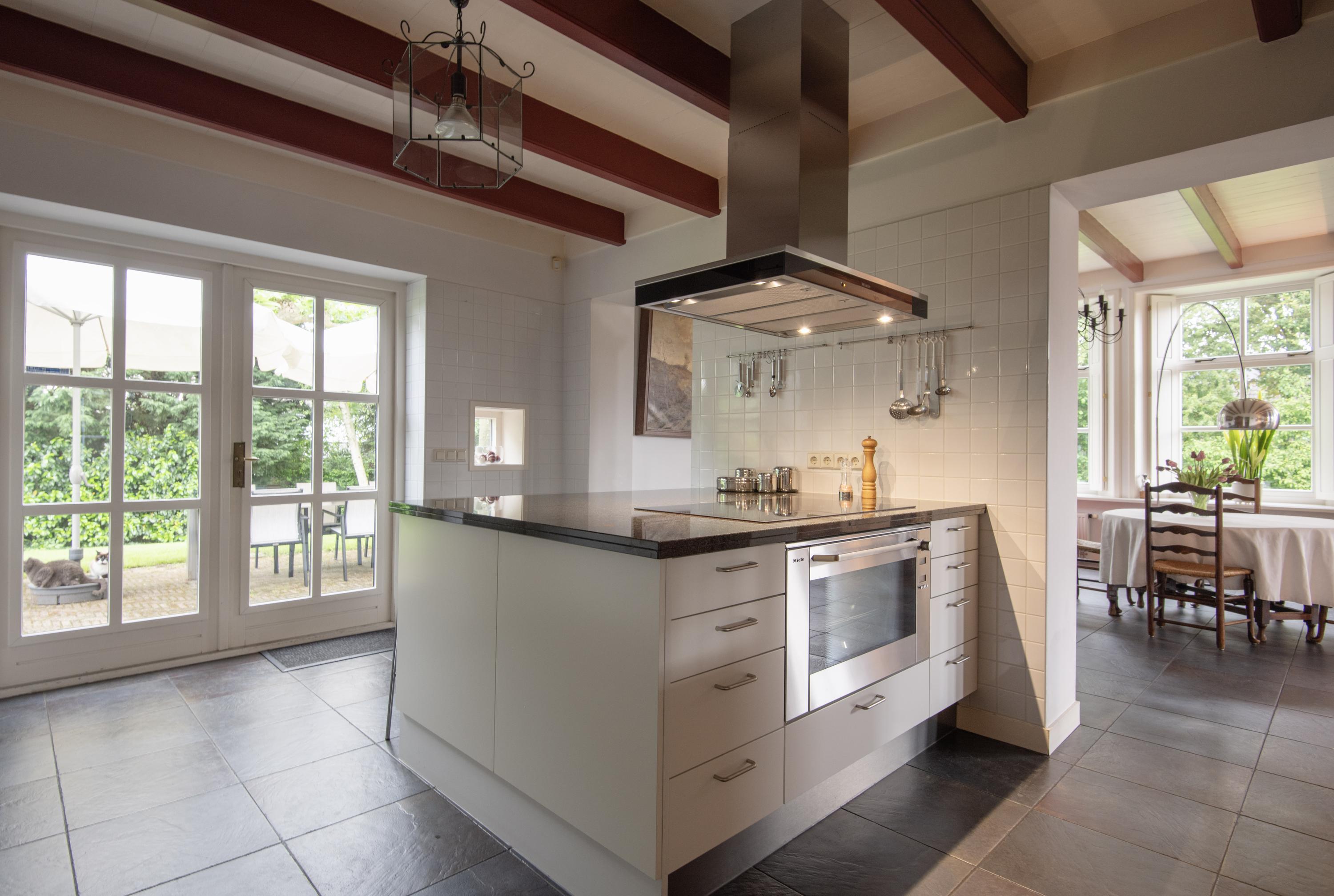 The original front door is located centrally in the front house but it is no longer used. The daily entrance is on the driveway side. The entrance is spacious and furnished with closets and a toilet. From the adjacent hallway is access to the living room. This sunny room with many skirted windows, flanked by interior shutters, breathes -with the almost three-meter high beamed ceiling- a pleasant atmosphere. In addition to the luxurious ceramic floor with underfloor heating, there is a natural stone fireplace with an open gas fire. In the living room are two passages that offer a view of the adjacent dining kitchen. This space offers access to the south-facing terrace through double French doors. Three mature Plane trees act as natural umbrellas there in the summer.