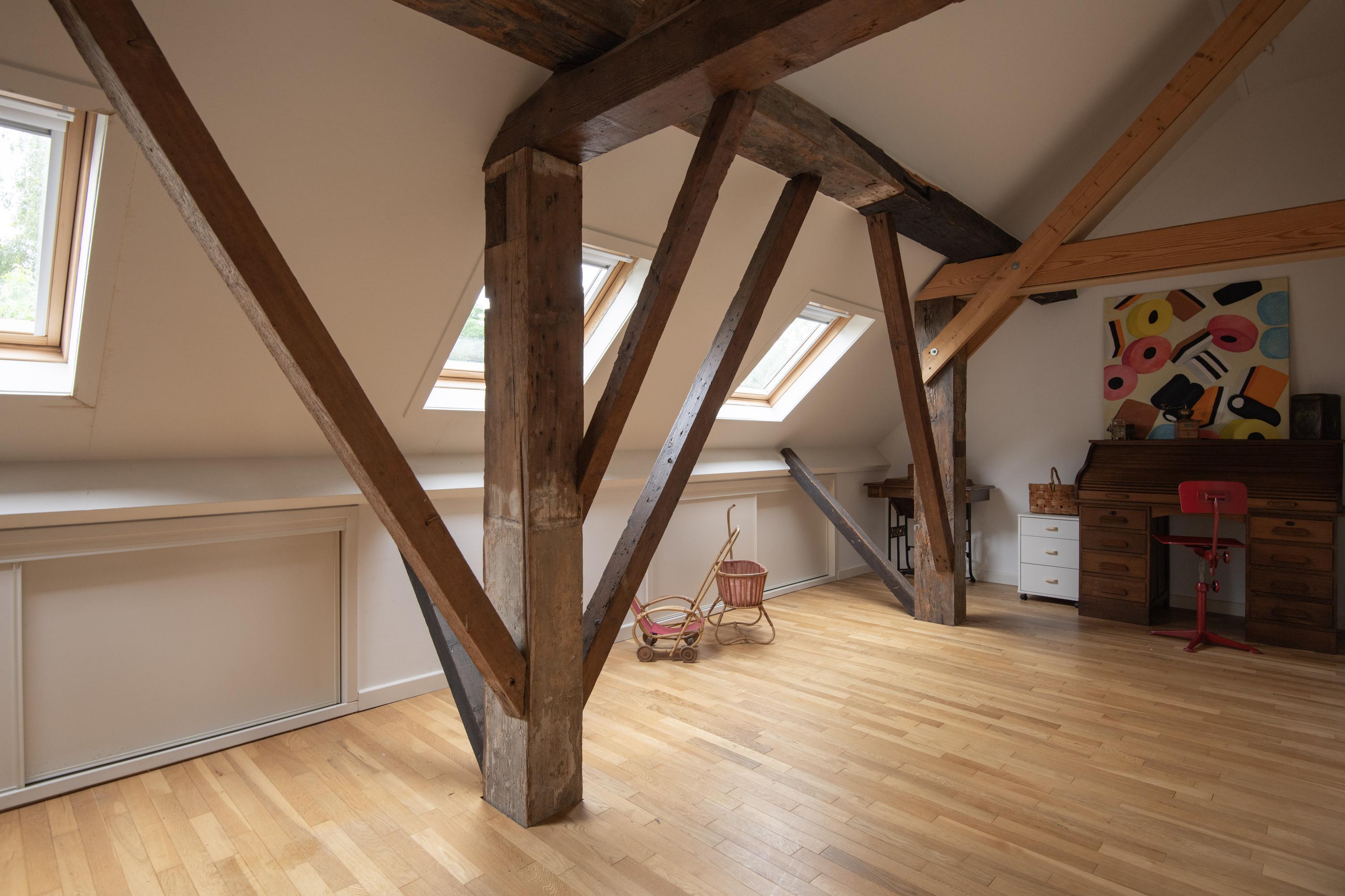 From the central corridor in the back house a staircase leads to the first floor. Under the insulated roof are two more beautiful bedrooms. Through three skylights there is a view of the garden and surroundings. Both rooms are wonderfully bright and have plenty of storage space.