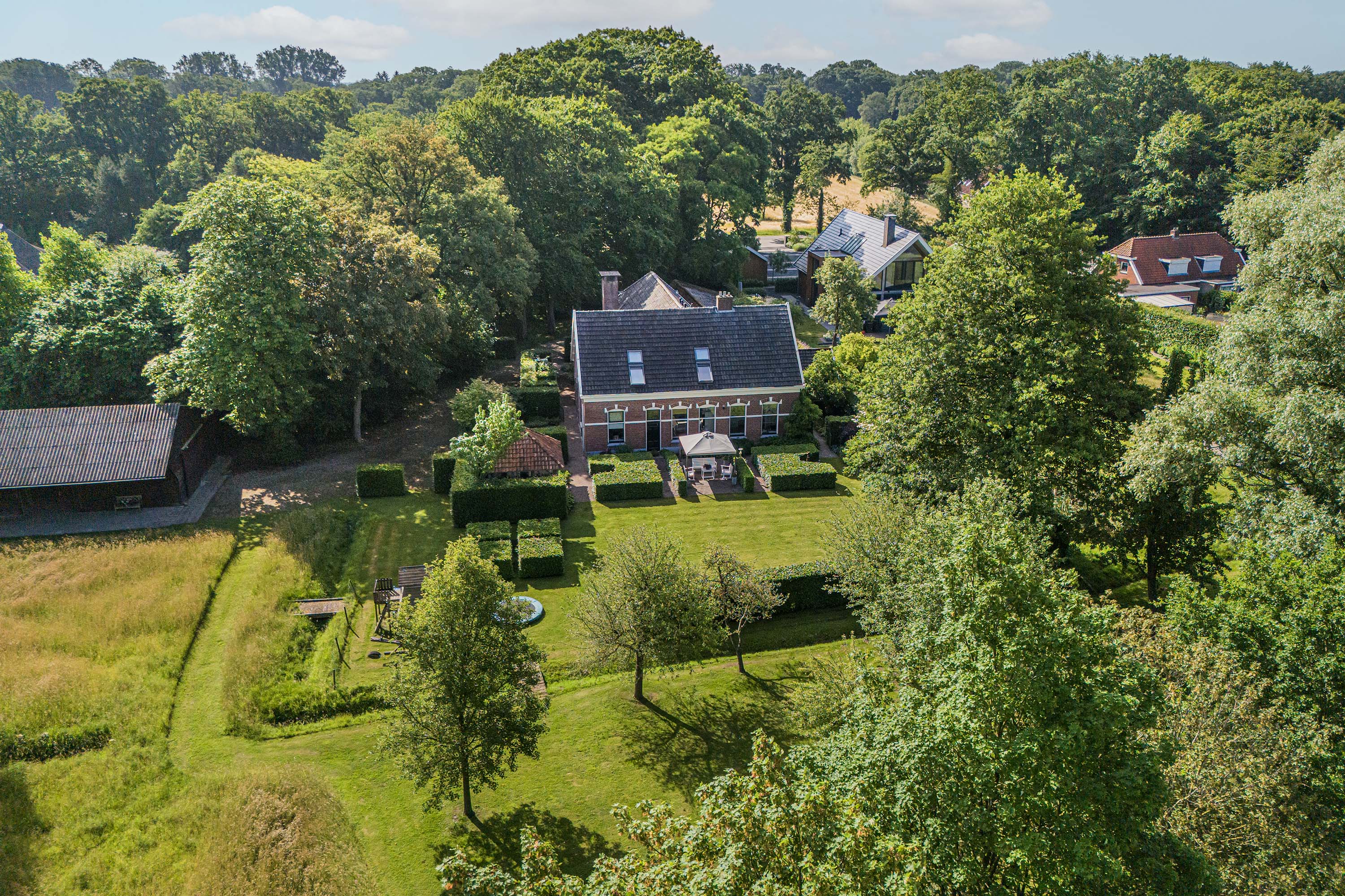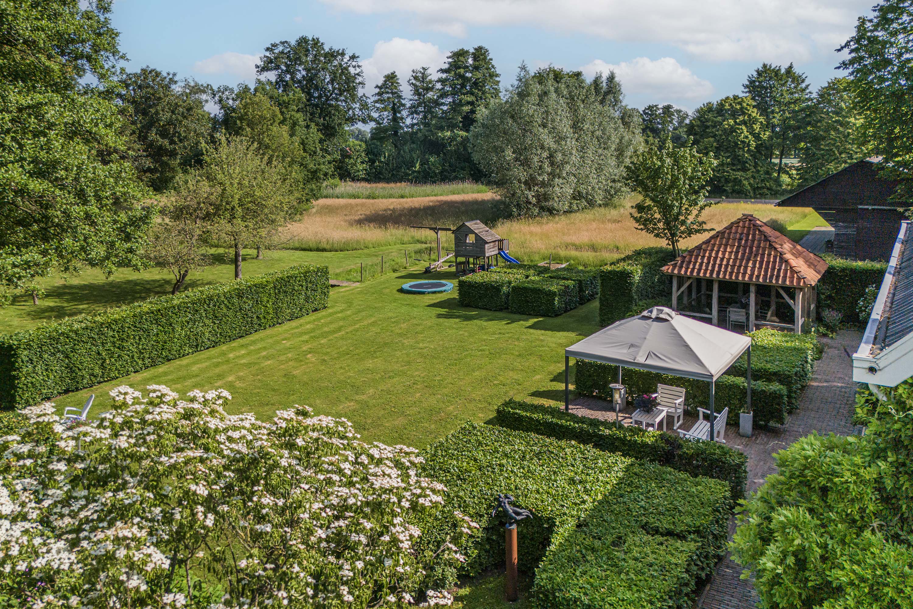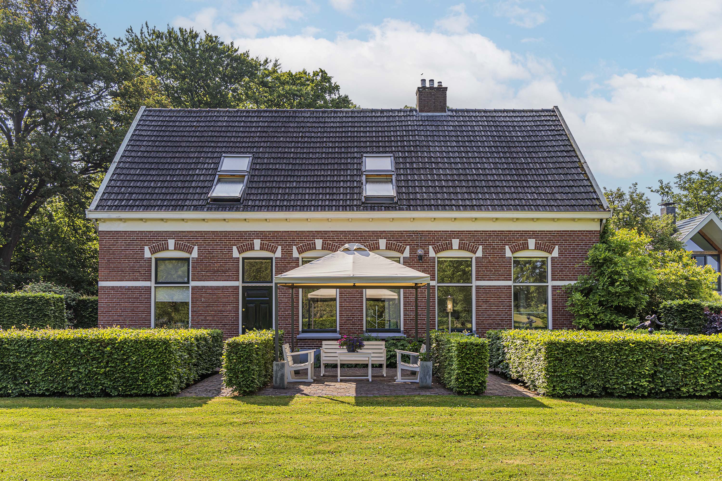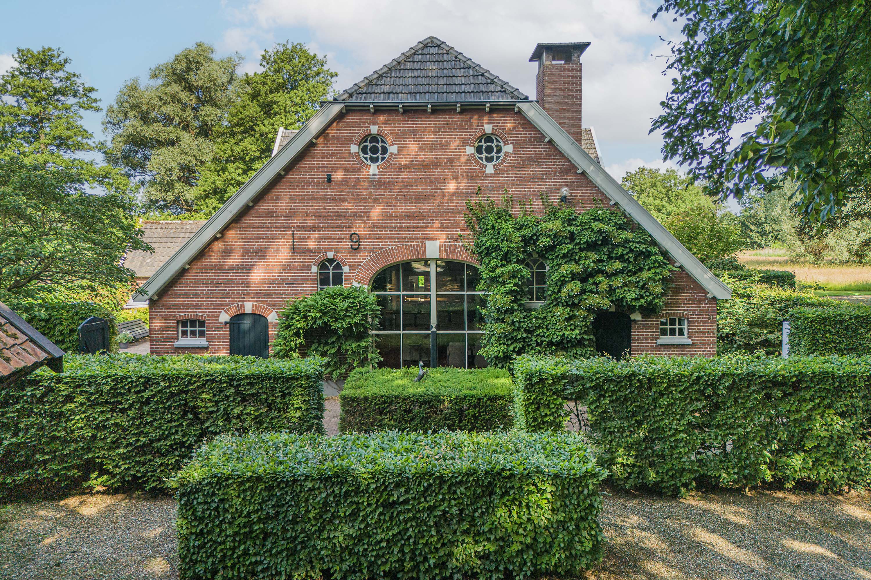 From the Hasseltweg, visitors are guided via the oak-lined driveway to this beautiful farmyard. There is ample space to park several cars. The house is surrounded by a green oasis of various hedges and partitions, all laid out based on a design by internationally renowned landscape architect Piet Oudolf. He transformed the wide, fan-shaped plot into a true paradise. There are multiple sitting areas, each separated with its own privacy and character. At any time of day, it is here for more than optimal enjoyment. The garden is intersected by a small ditch, creating a beautiful natural division: around the house is a landscaped area while the other side of the ditch is a nature meadow with various fruit trees (apple, pear, plum, and a lovely chestnut tree) and a pond where a family of deer raises their young in the tall grass every year. On a separate section of the property are 28 solar panels. The rear boundary is entirely natural with a few solitary trees or evergreen shrubs, allowing full enjoyment of the expansive views and a stunning sunset every evening.