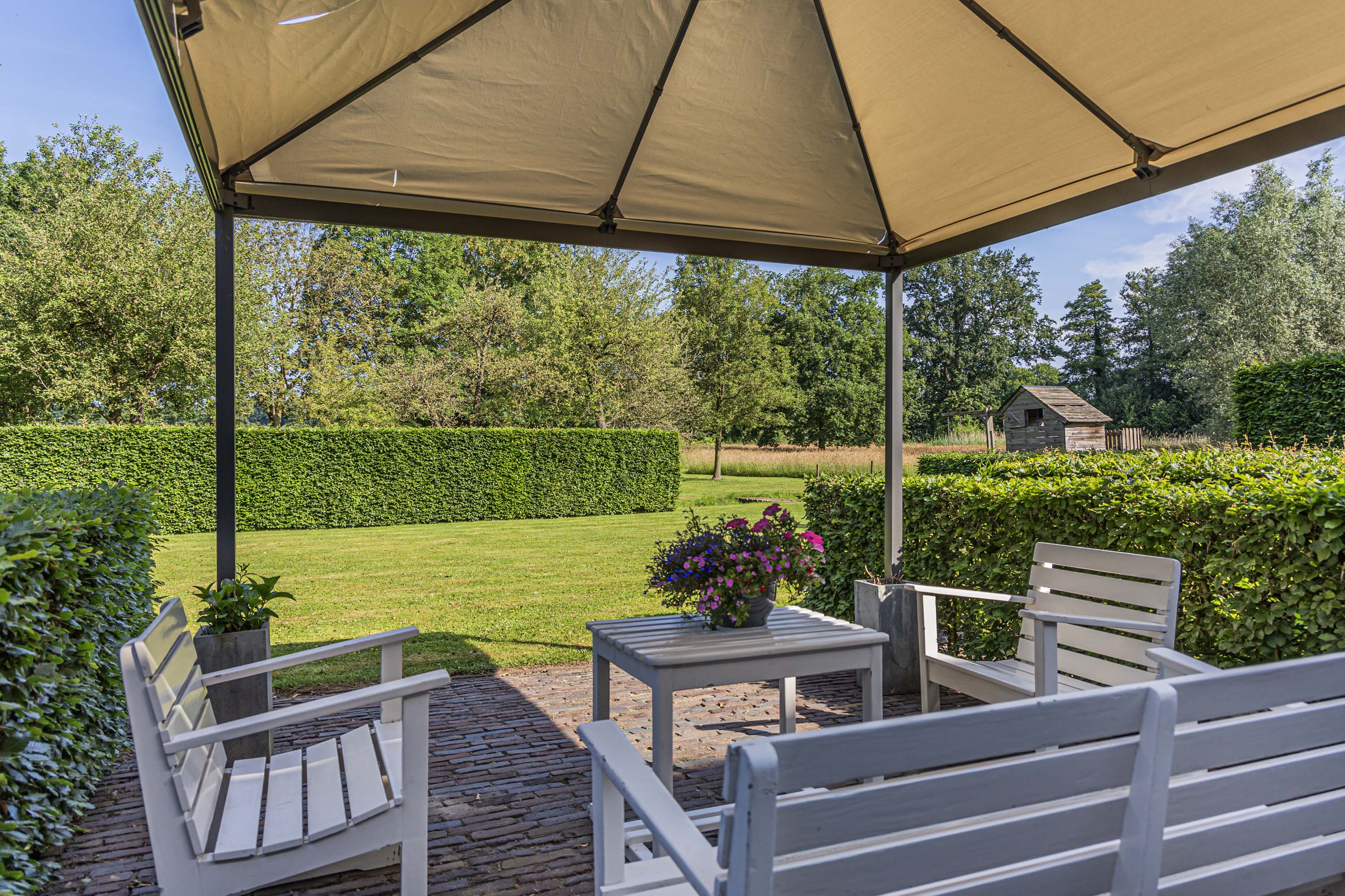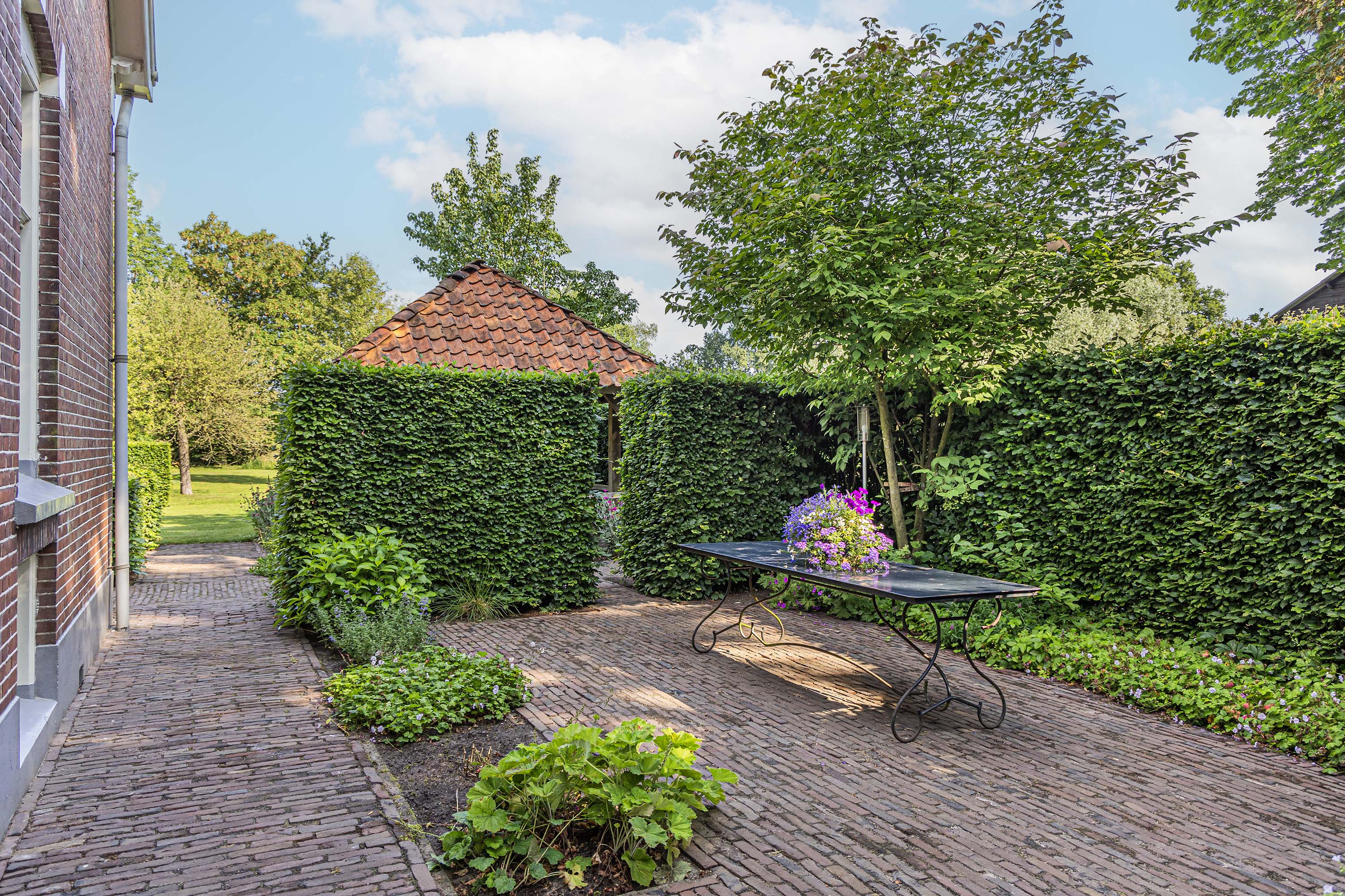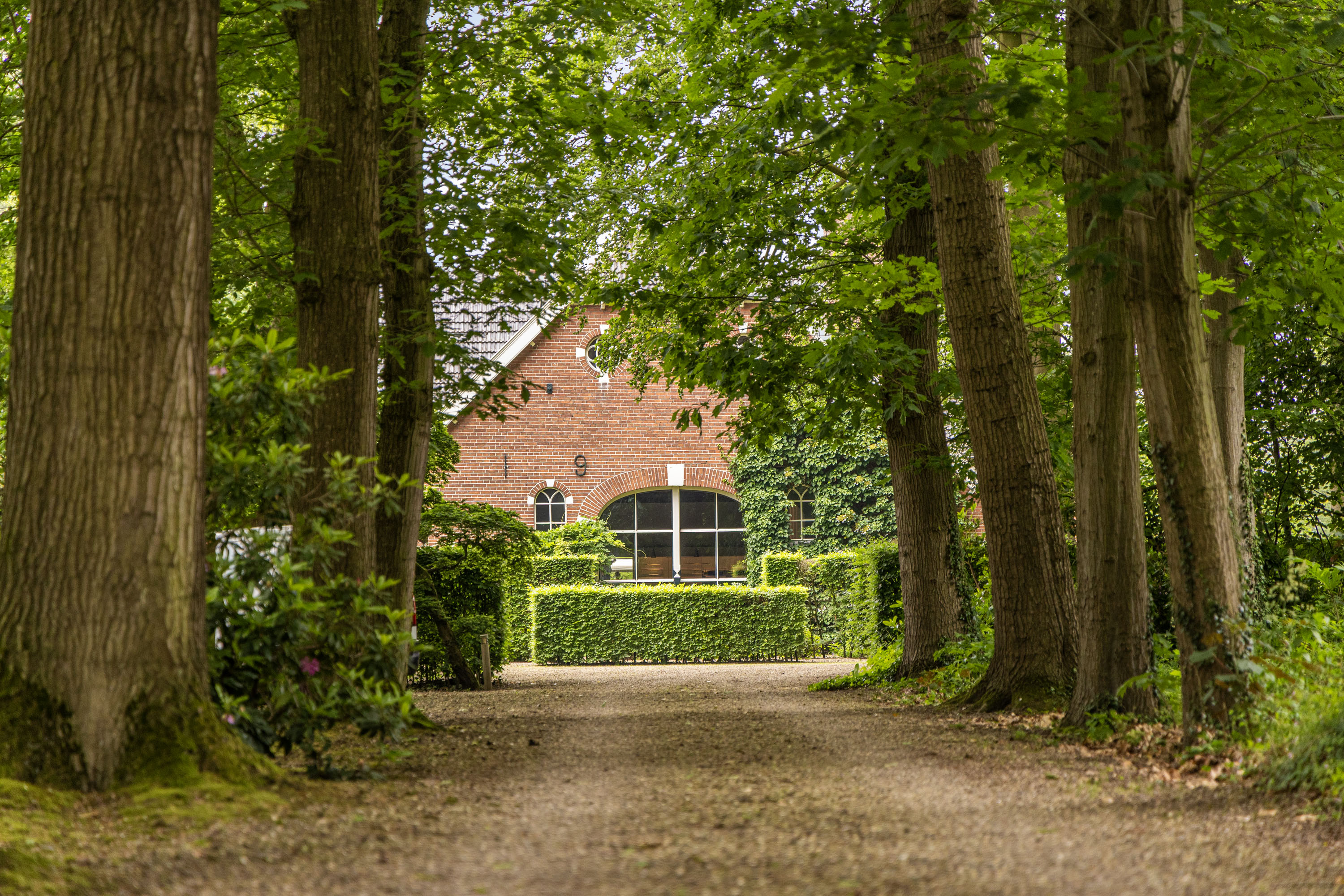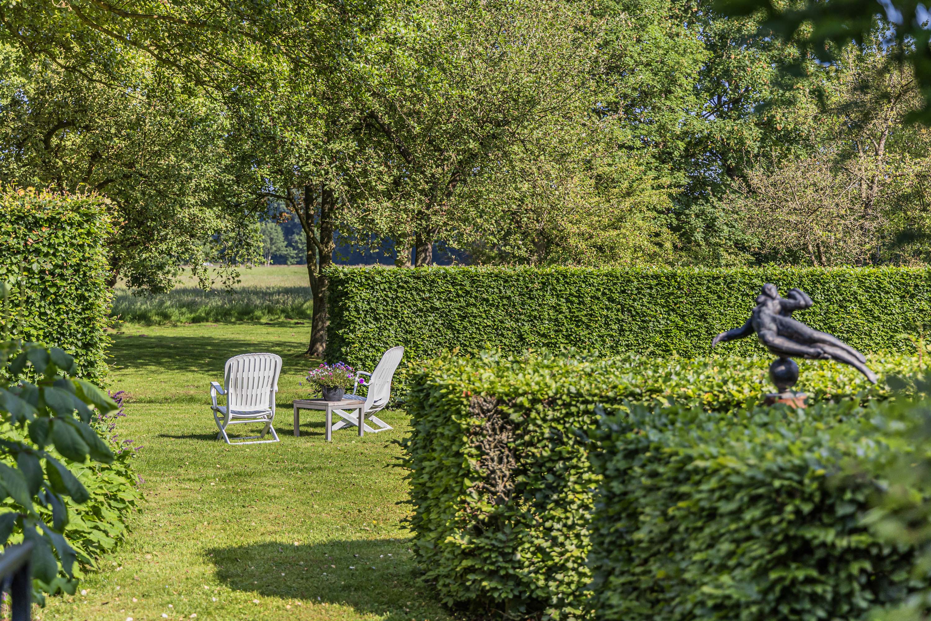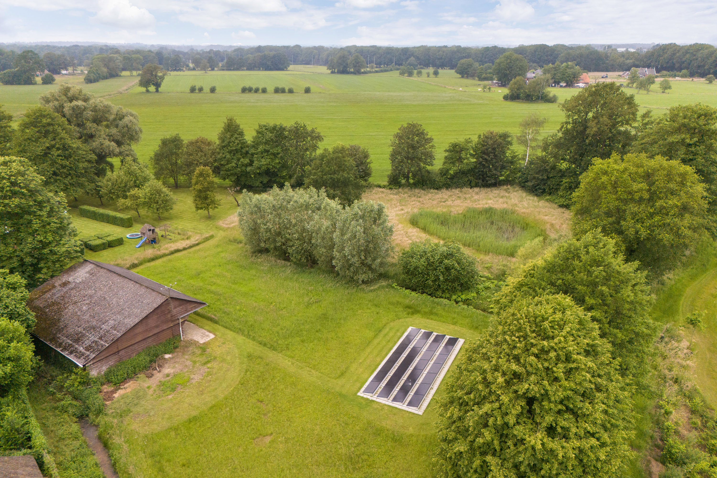 From the Hasseltweg, visitors are guided via the oak-lined driveway to this beautiful farmyard. There is ample space to park several cars. The house is surrounded by a green oasis of various hedges and partitions, all laid out based on a design by internationally renowned landscape architect Piet Oudolf. He transformed the wide, fan-shaped plot into a true paradise. There are multiple sitting areas, each separated with its own privacy and character. At any time of day, it is here for more than optimal enjoyment. The garden is intersected by a small ditch, creating a beautiful natural division: around the house is a landscaped area while the other side of the ditch is a nature meadow with various fruit trees (apple, pear, plum, and a lovely chestnut tree) and a pond where a family of deer raises their young in the tall grass every year. On a separate section of the property are 28 solar panels. The rear boundary is entirely natural with a few solitary trees or evergreen shrubs, allowing full enjoyment of the expansive views and a stunning sunset every evening.