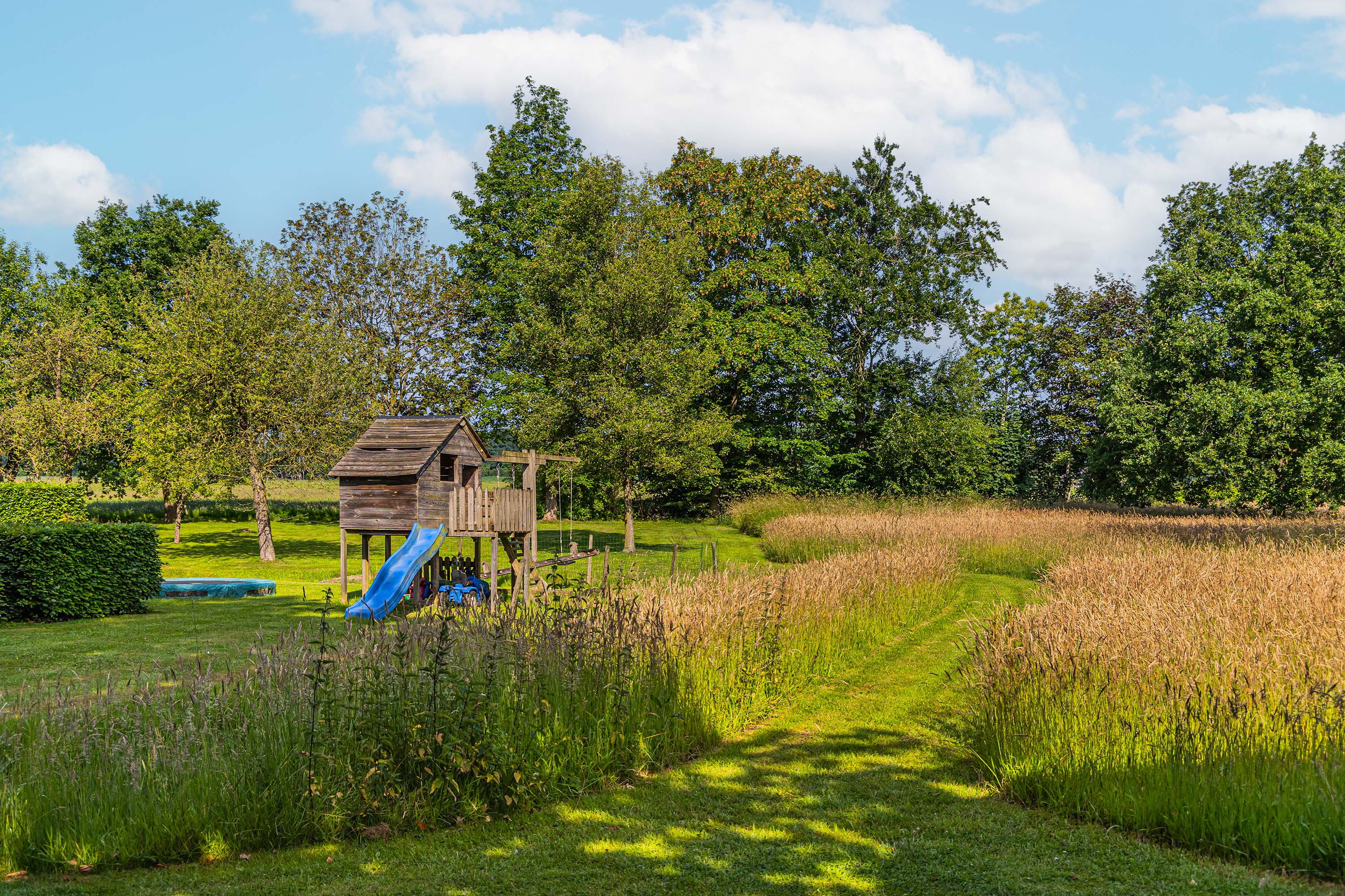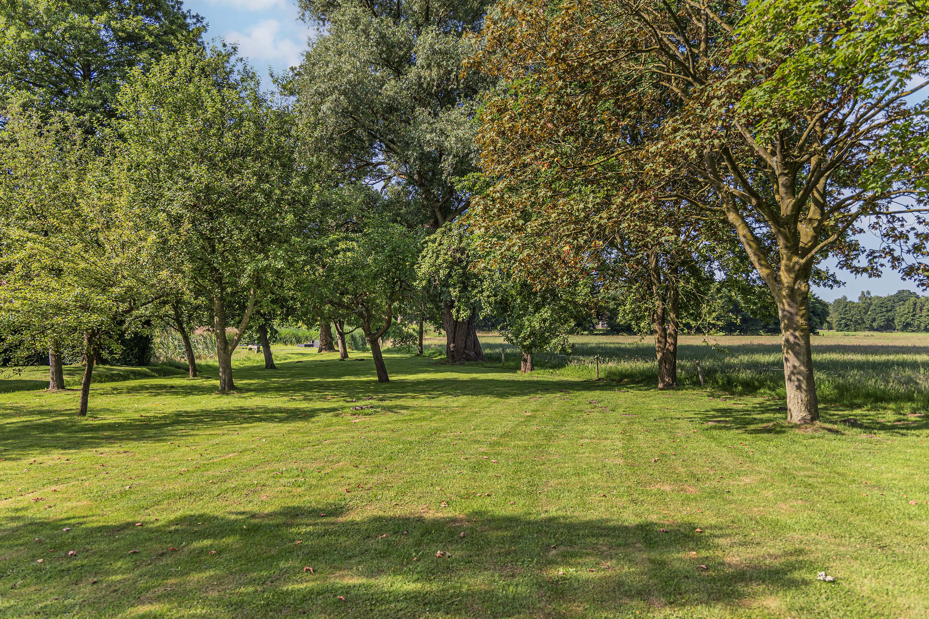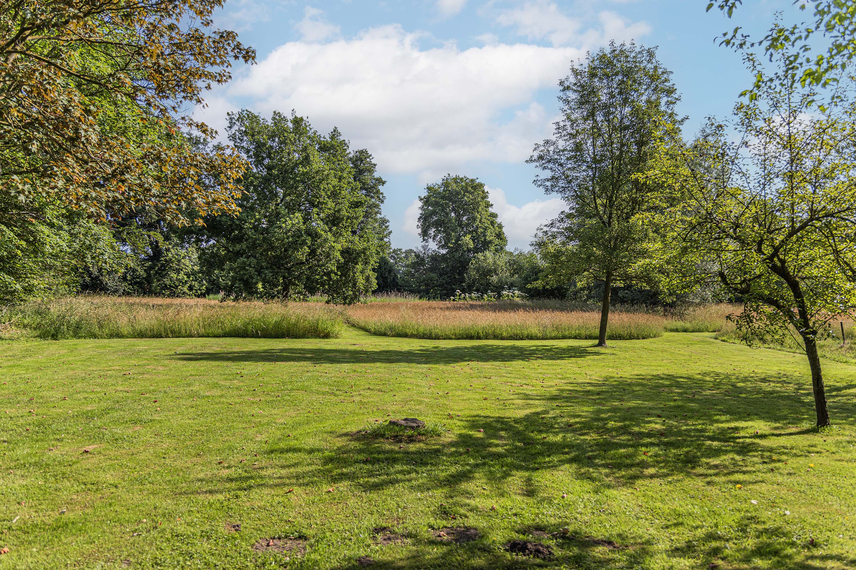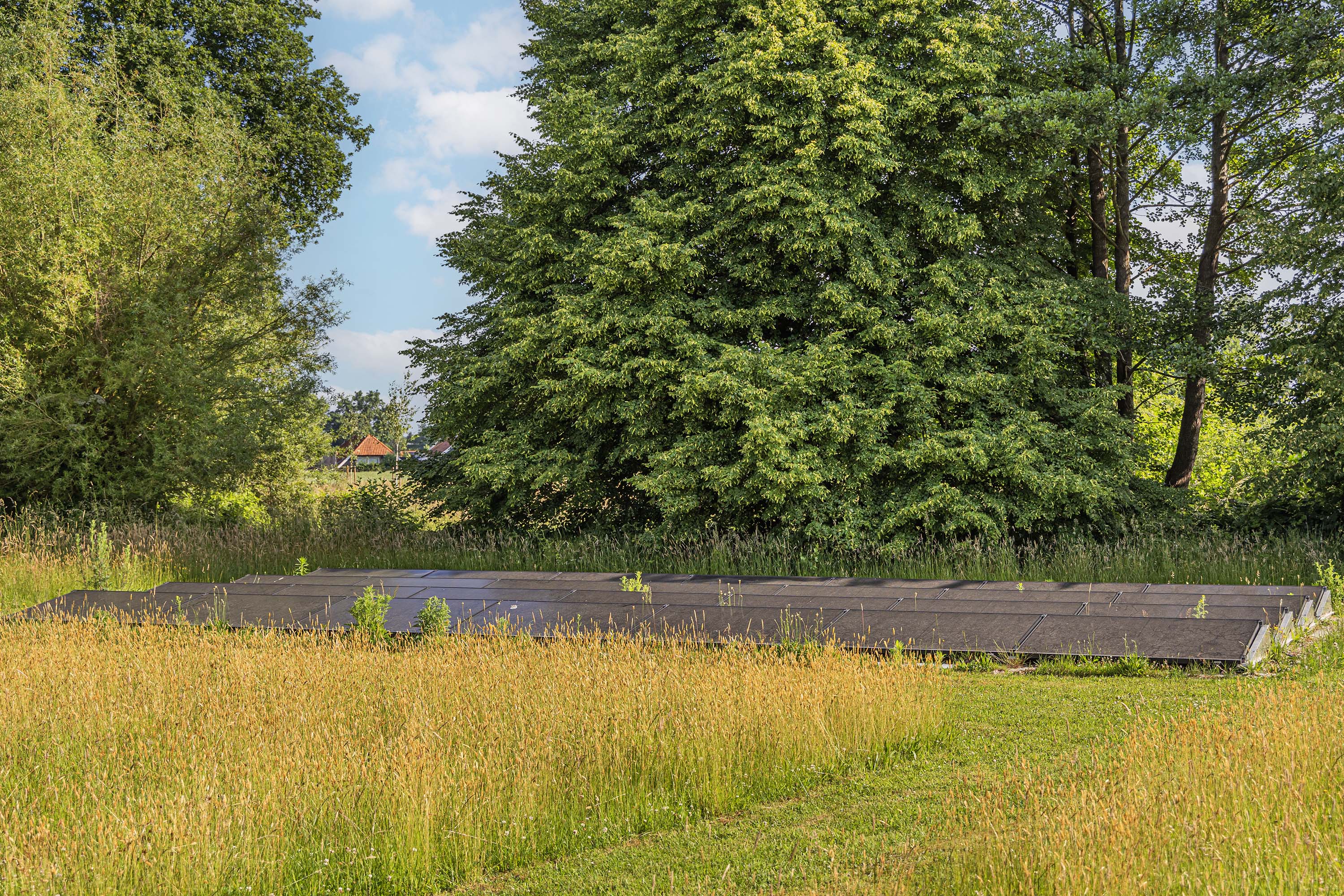 From the Hasseltweg, visitors are guided via the oak-lined driveway to this beautiful farmyard. There is ample space to park several cars. The house is surrounded by a green oasis of various hedges and partitions, all laid out based on a design by internationally renowned landscape architect Piet Oudolf. He transformed the wide, fan-shaped plot into a true paradise. There are multiple sitting areas, each separated with its own privacy and character. At any time of day, it is here for more than optimal enjoyment. The garden is intersected by a small ditch, creating a beautiful natural division: around the house is a landscaped area while the other side of the ditch is a nature meadow with various fruit trees (apple, pear, plum, and a lovely chestnut tree) and a pond where a family of deer raises their young in the tall grass every year. On a separate section of the property are 28 solar panels. The rear boundary is entirely natural with a few solitary trees or evergreen shrubs, allowing full enjoyment of the expansive views and a stunning sunset every evening.