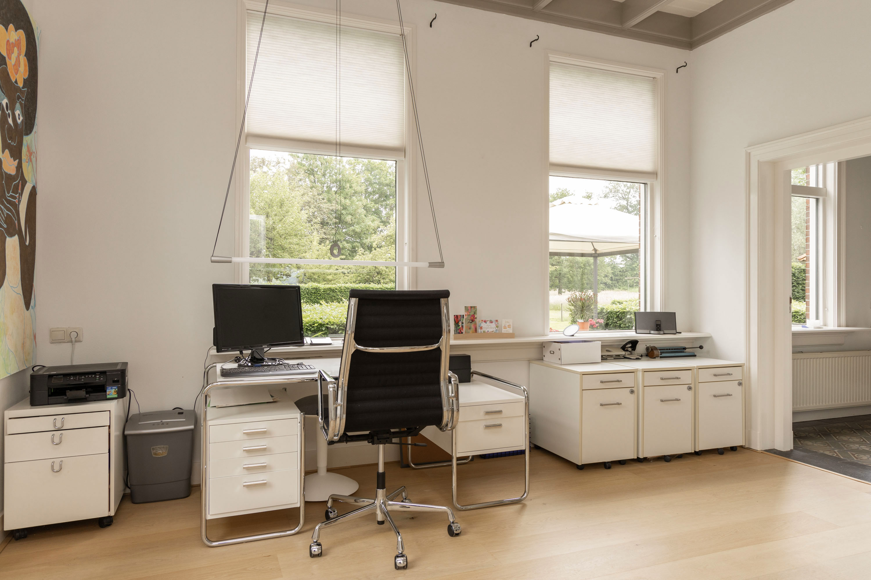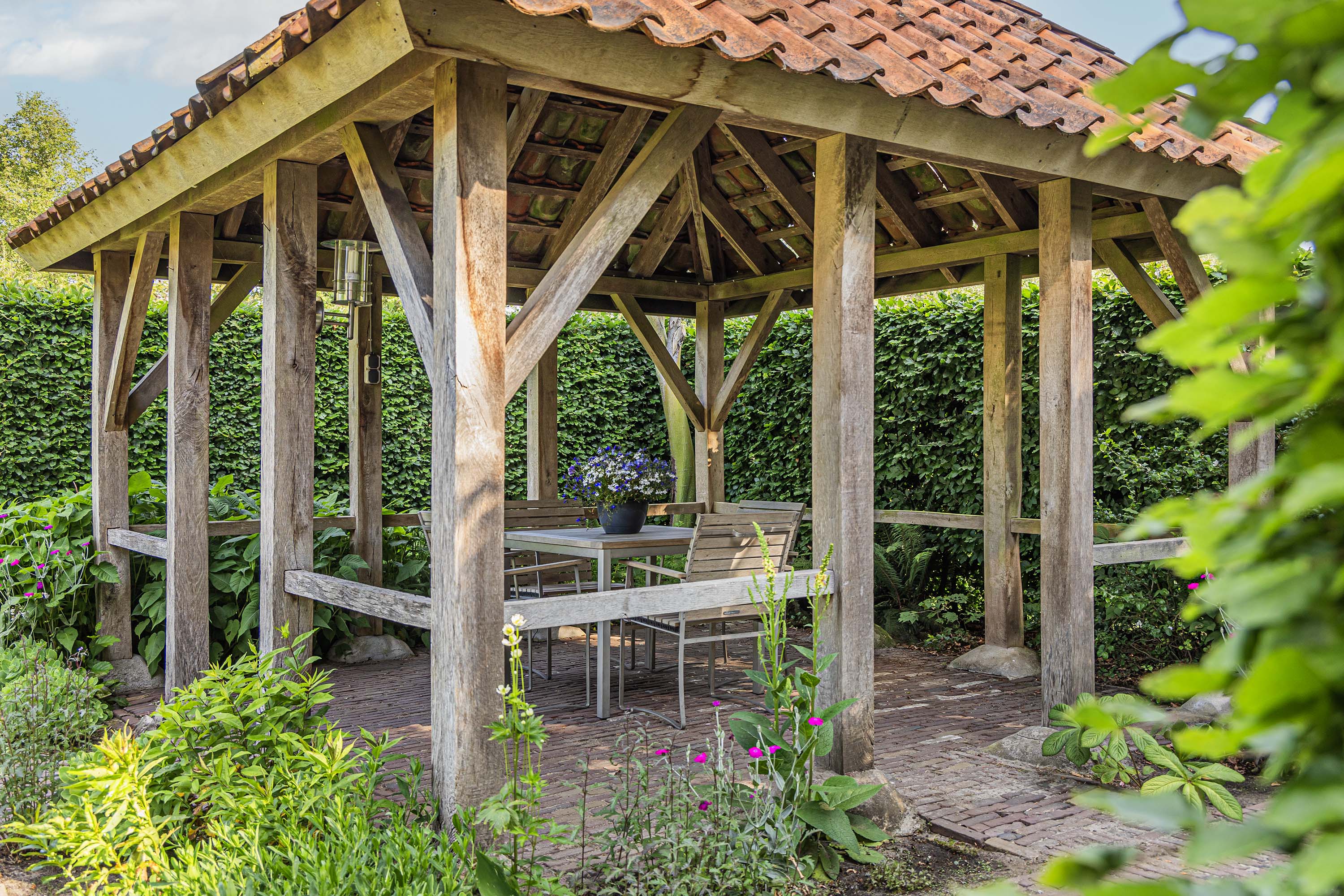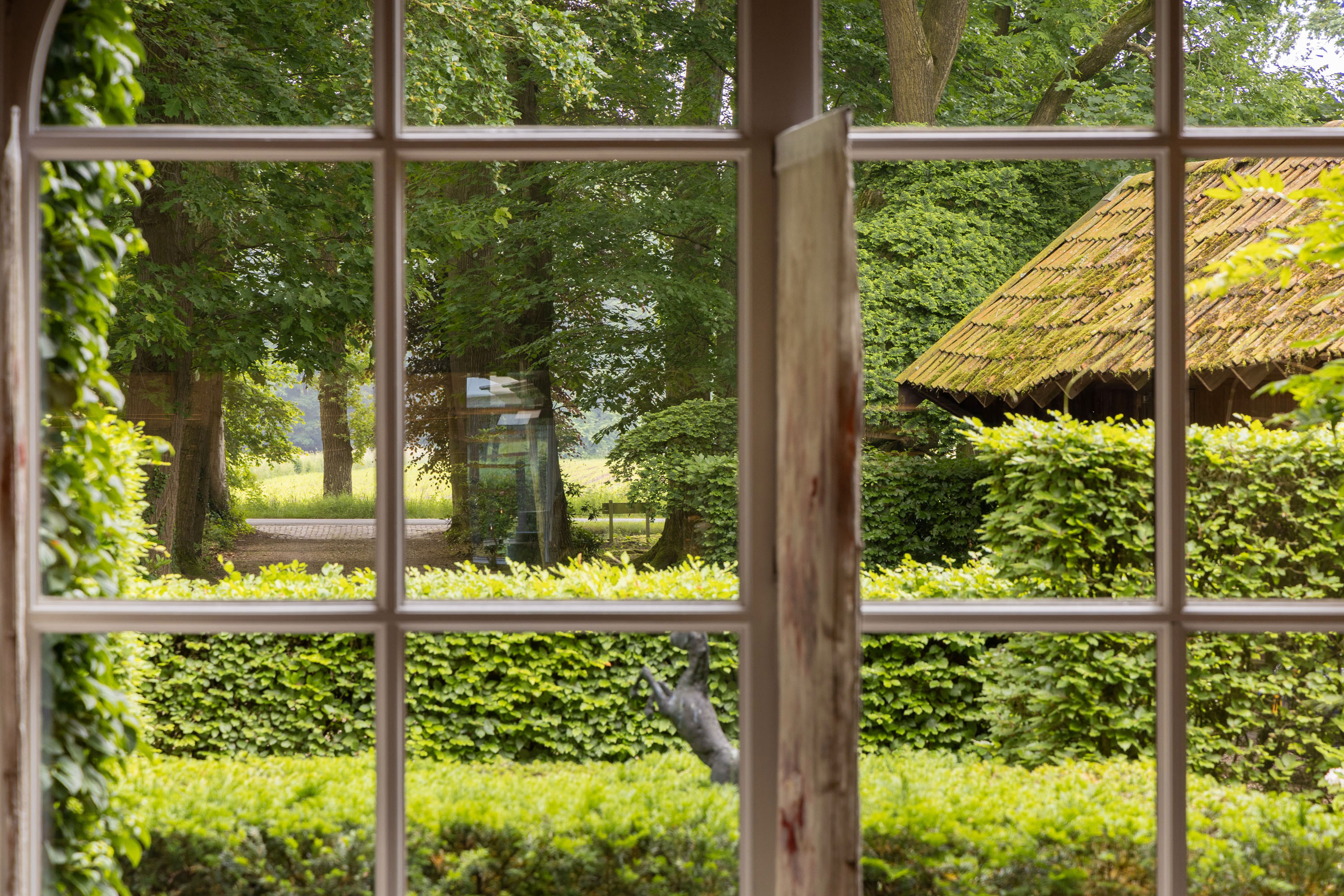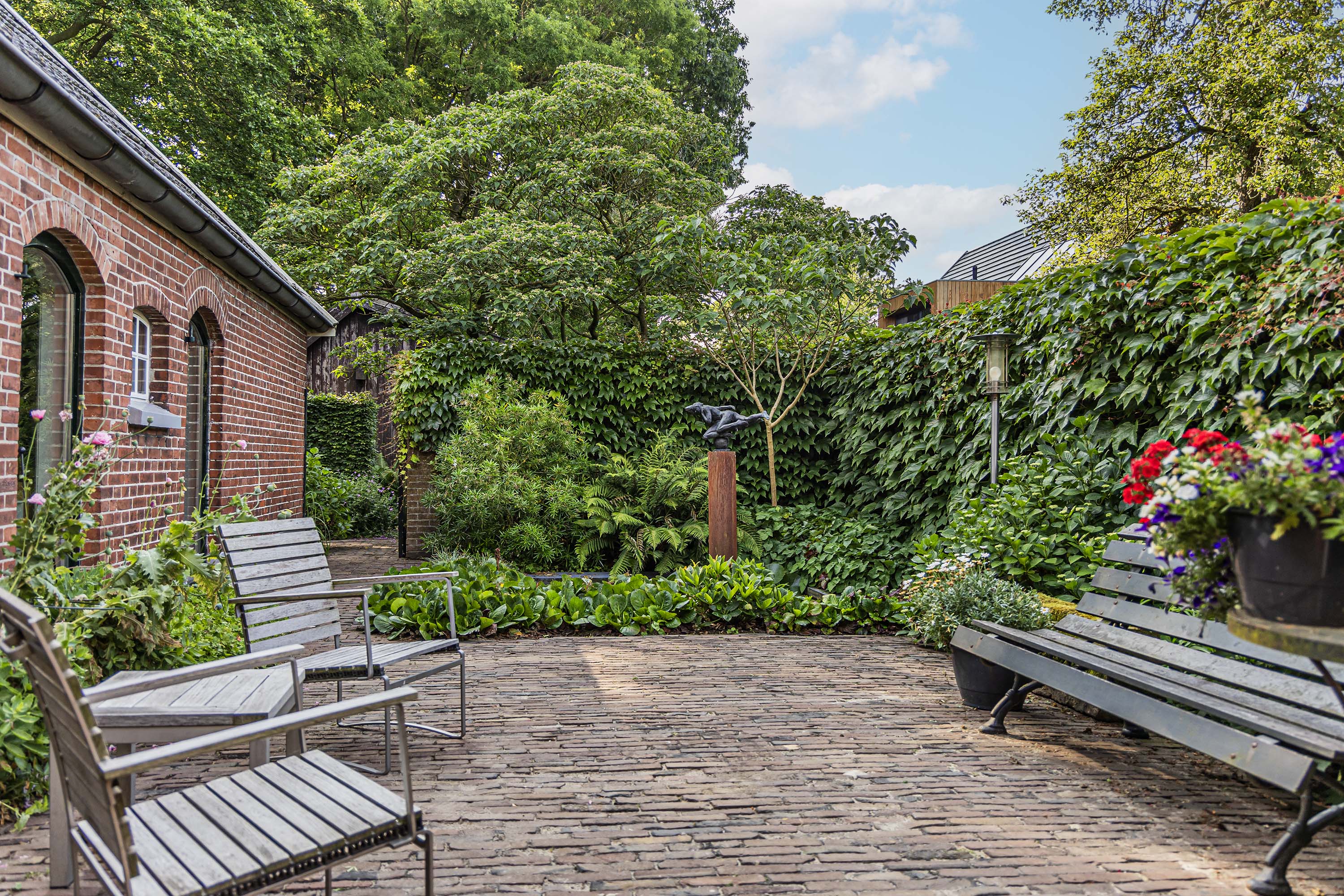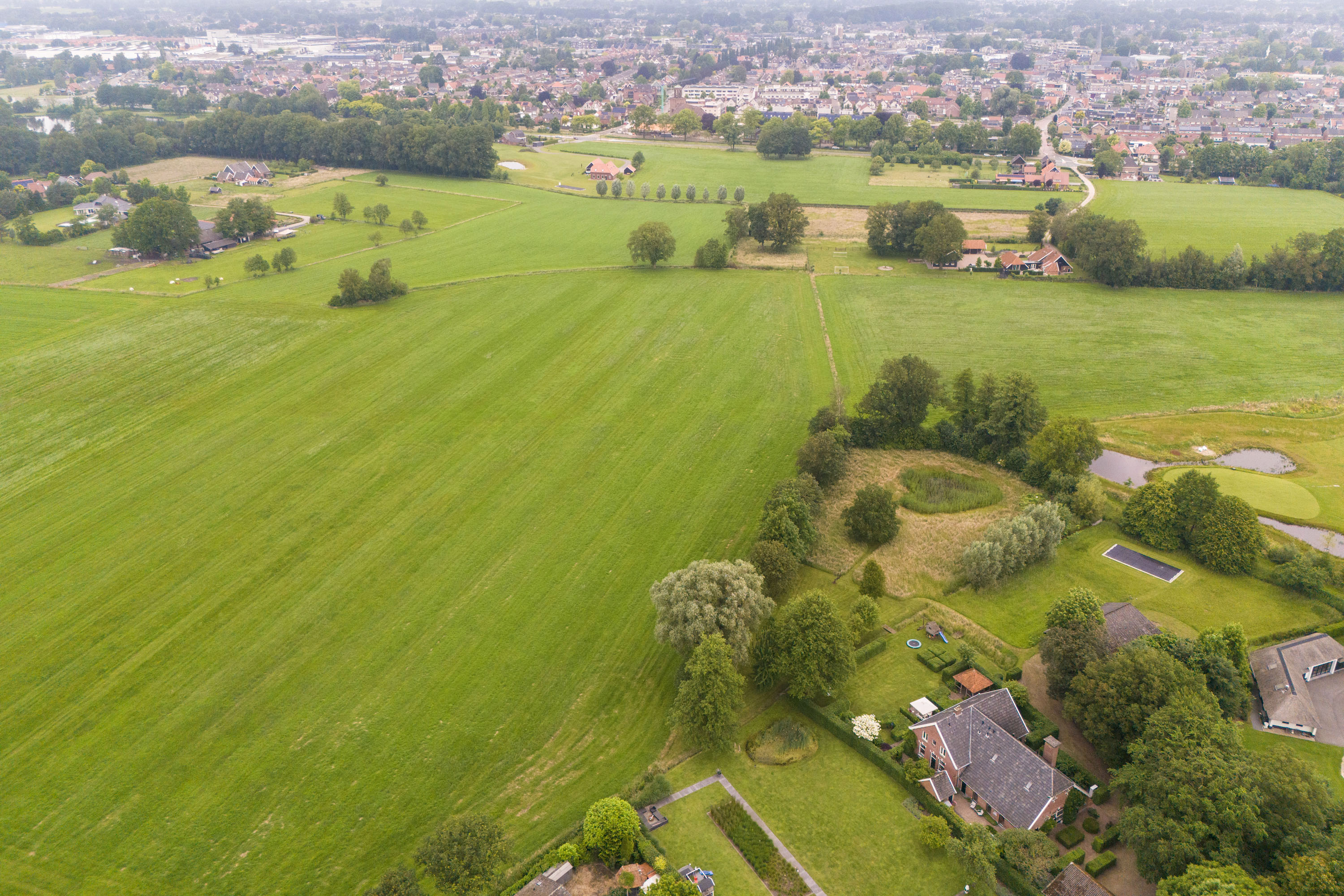 From the Hasseltweg, visitors are guided via the oak-lined driveway to this beautiful farmyard. There is ample space to park several cars. The house is surrounded by a green oasis of various hedges and partitions, all laid out based on a design by internationally renowned landscape architect Piet Oudolf. He transformed the wide, fan-shaped plot into a true paradise. There are multiple sitting areas, each separated with its own privacy and character. At any time of day, it is here for more than optimal enjoyment. The garden is intersected by a small ditch, creating a beautiful natural division: around the house is a landscaped area while the other side of the ditch is a nature meadow with various fruit trees (apple, pear, plum, and a lovely chestnut tree) and a pond where a family of deer raises their young in the tall grass every year. On a separate section of the property are 28 solar panels. The rear boundary is entirely natural with a few solitary trees or evergreen shrubs, allowing full enjoyment of the expansive views and a stunning sunset every evening.