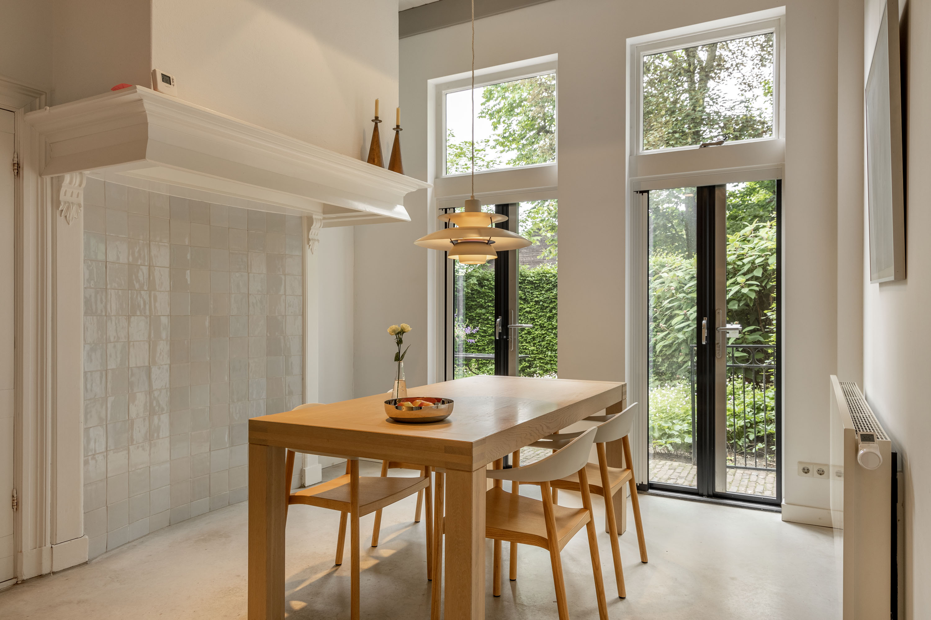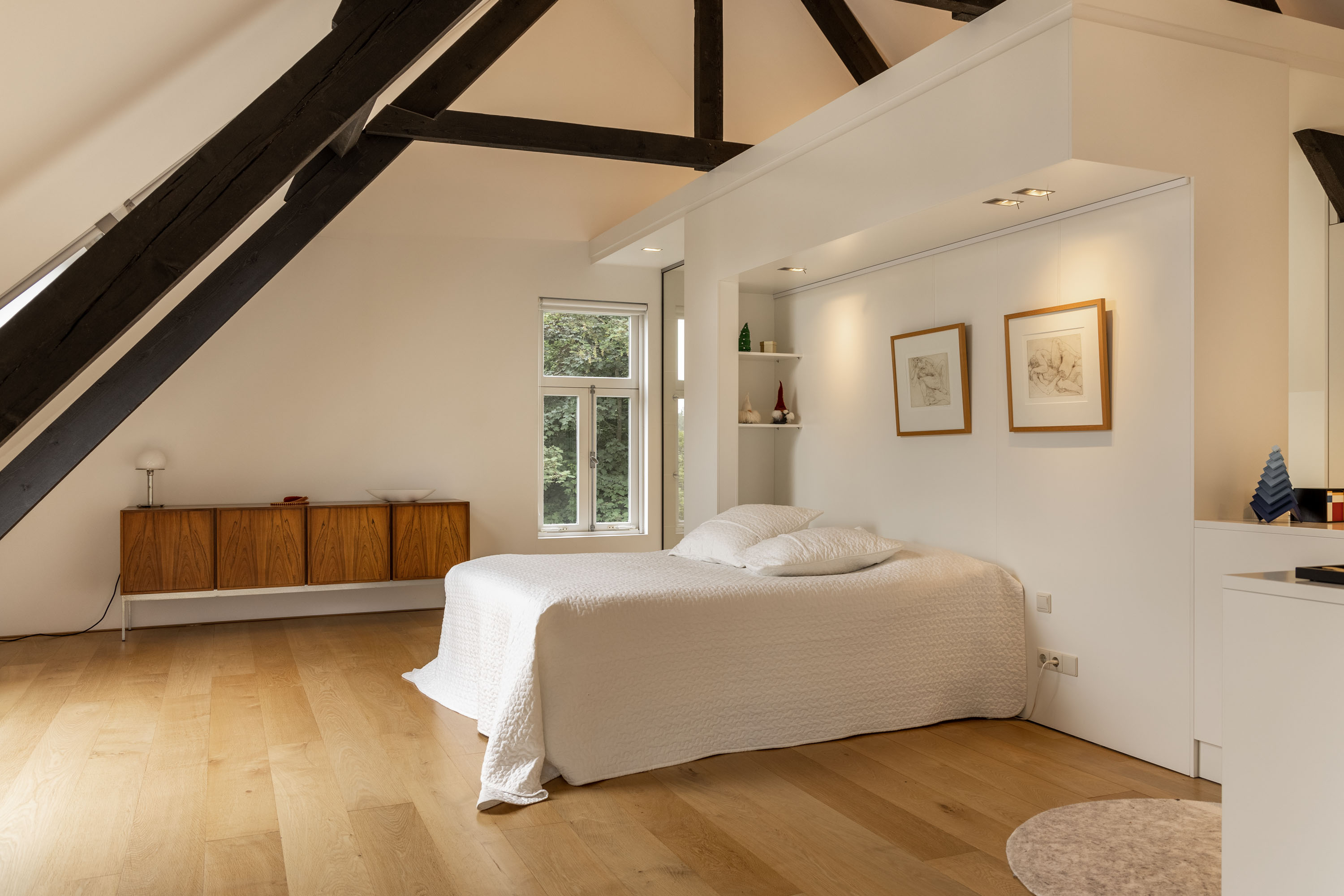 The original barn area has been transformed into a breathtaking living space with an adjoining open kitchen. The area is "more than generous," yet, thanks to the well-thought-out layout, it feels cozy and inviting. In the living room you can find the original floor and the interior doors with glass allow for phenomenal views from inside. The old beams have been wonderfully incorporated into the modern interior and the contemporary gas fireplace is a stunning centerpiece, providing warmth and ambiance during the winter months. The space offers various options for relaxing or dining. The centrally placed, built-in kitchen with a modern white high-gloss finish anchors the dining area, where there is ample space for an XL dining table. This area has a concrete cast floor with underfloor heating.