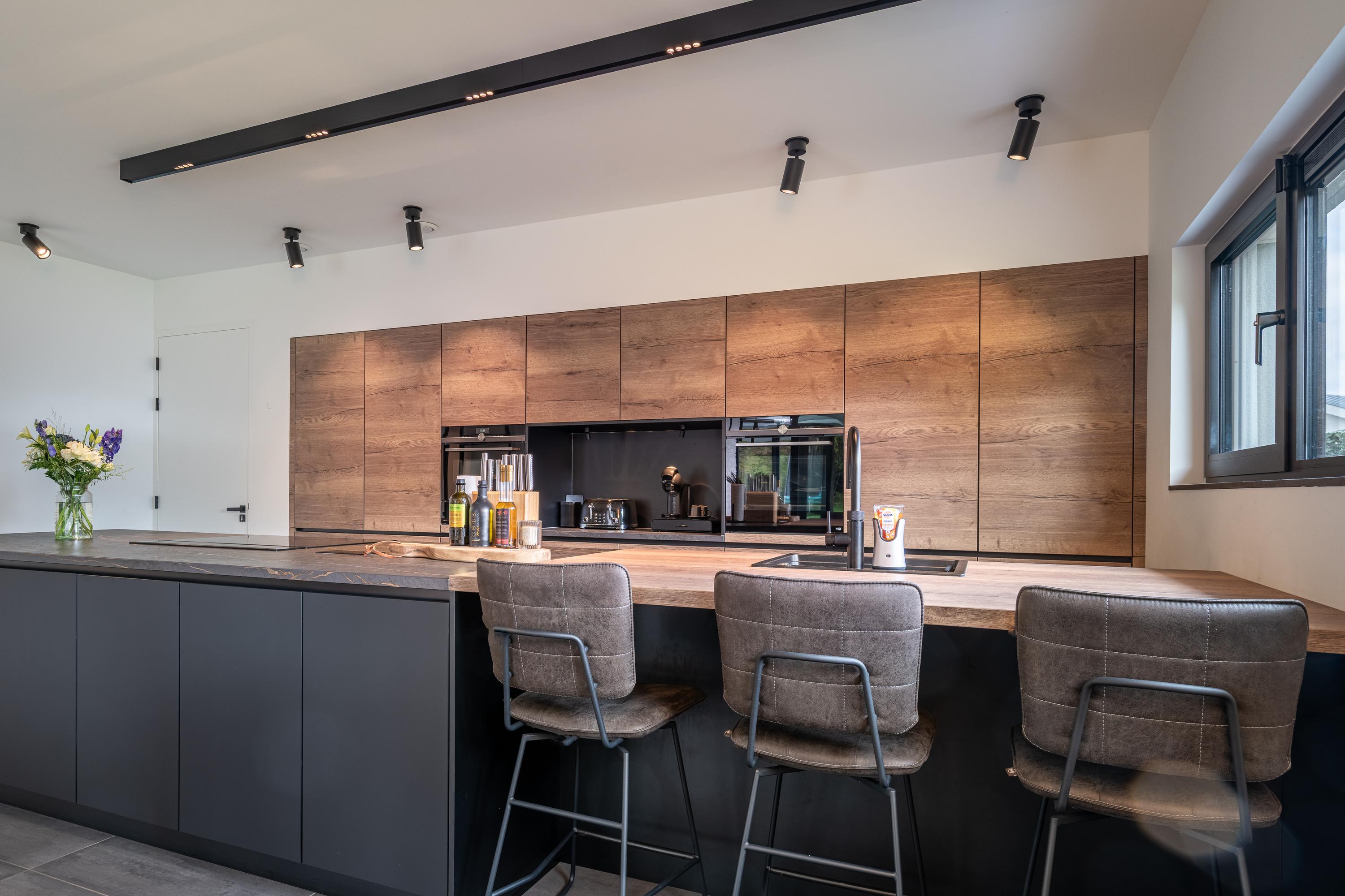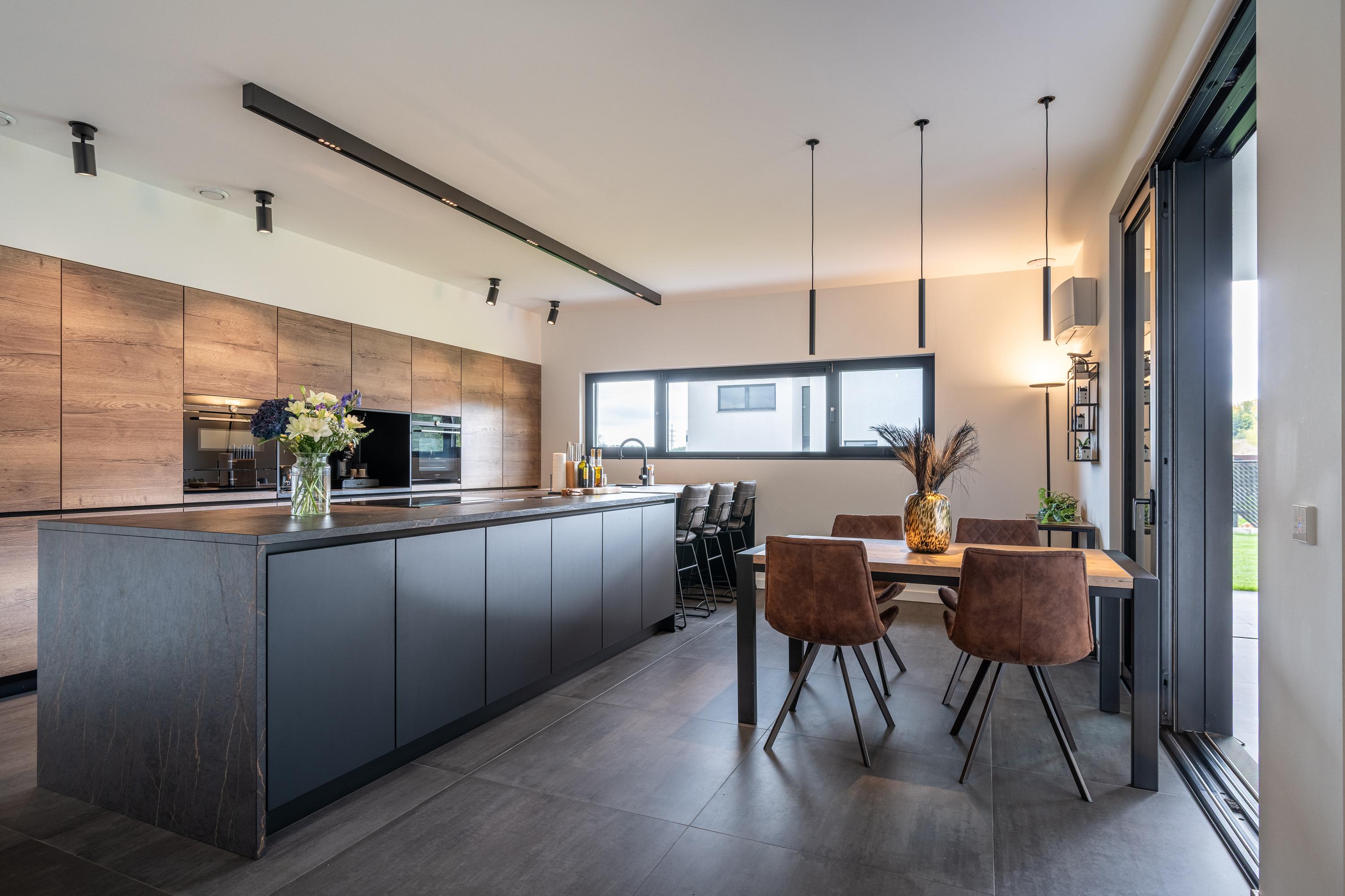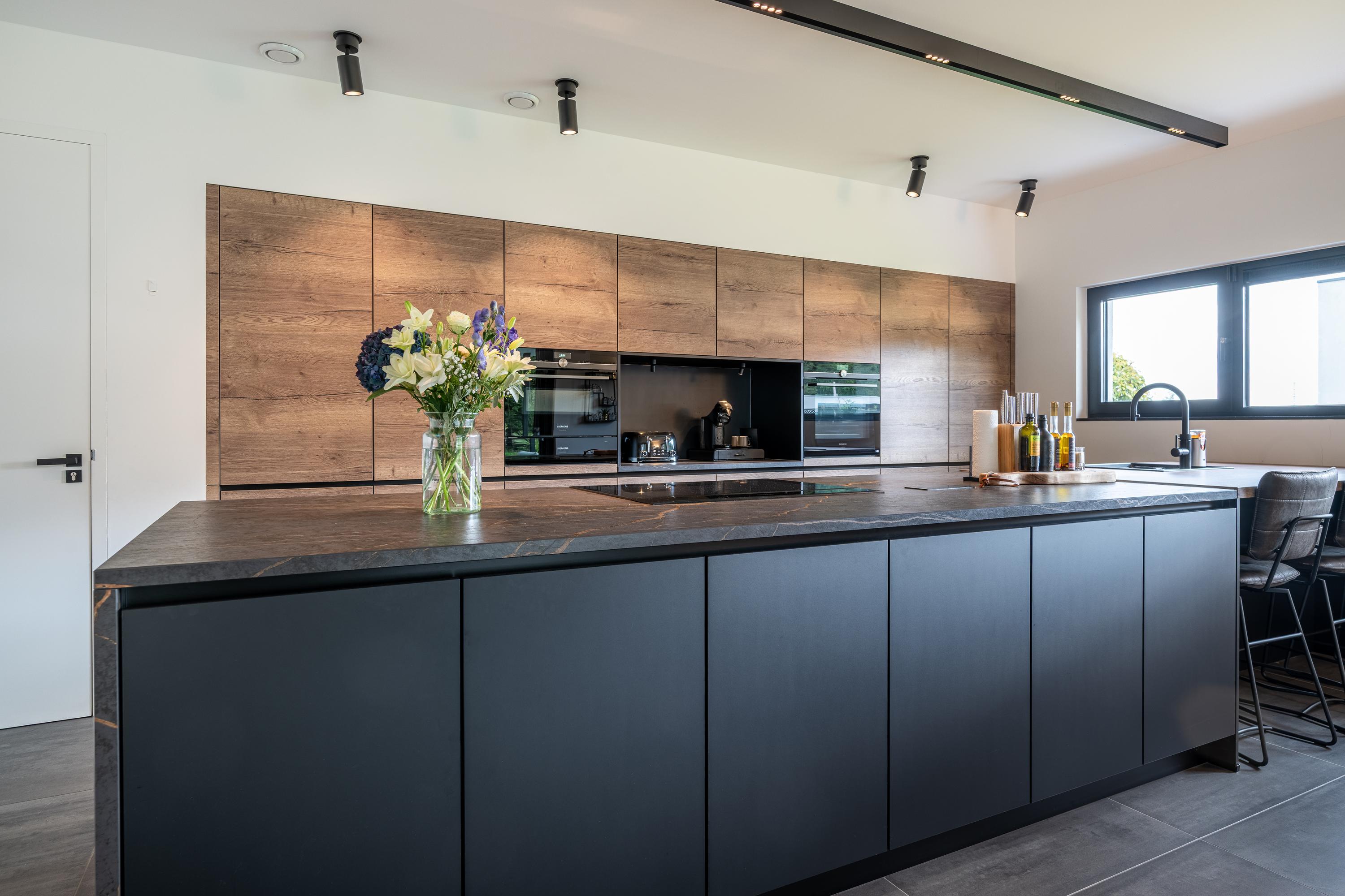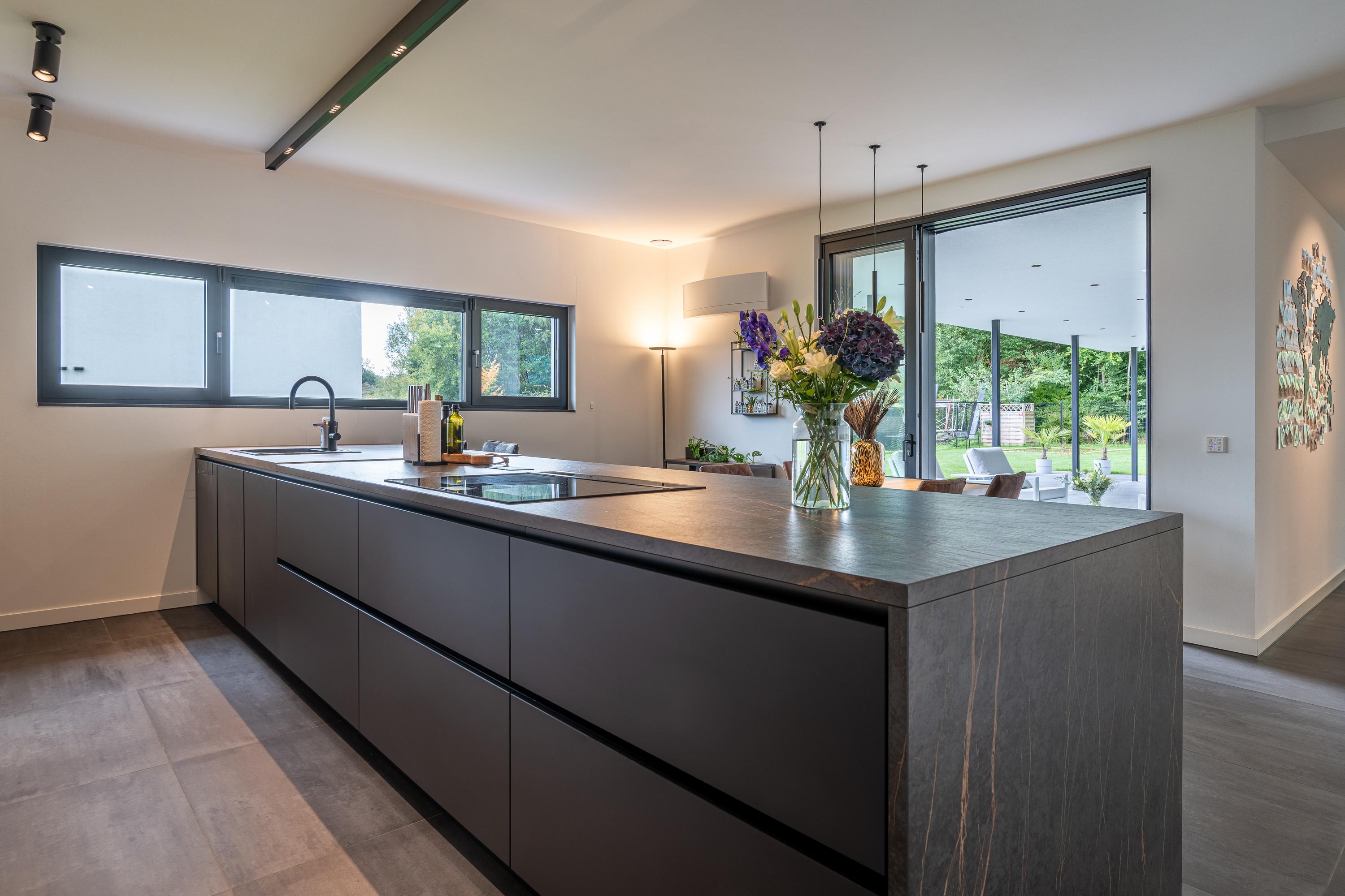 The kitchen is the heart of this villa and is an absolute eye-catcher. Centrally located is the matte black cooking island, sleekly designed and finished to a high standard. The combination of the sturdy black island and the sleek cabinetry creates a modern, luxurious atmosphere with a timeless look. Behind the handle-less fronts is plenty of storage space and high-quality built-in appliances from Siemens, including: Quooker 5-in-1, sink with integrated food waste disposer, combi steam oven, convection oven, coffee bar, induction hob with integrated extractor system, refrigerator, dishwasher, and warming drawers.