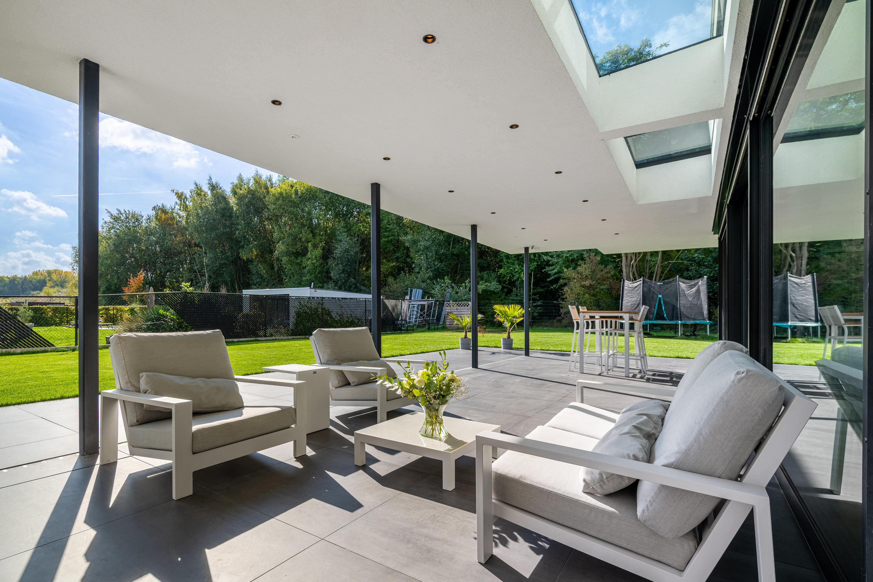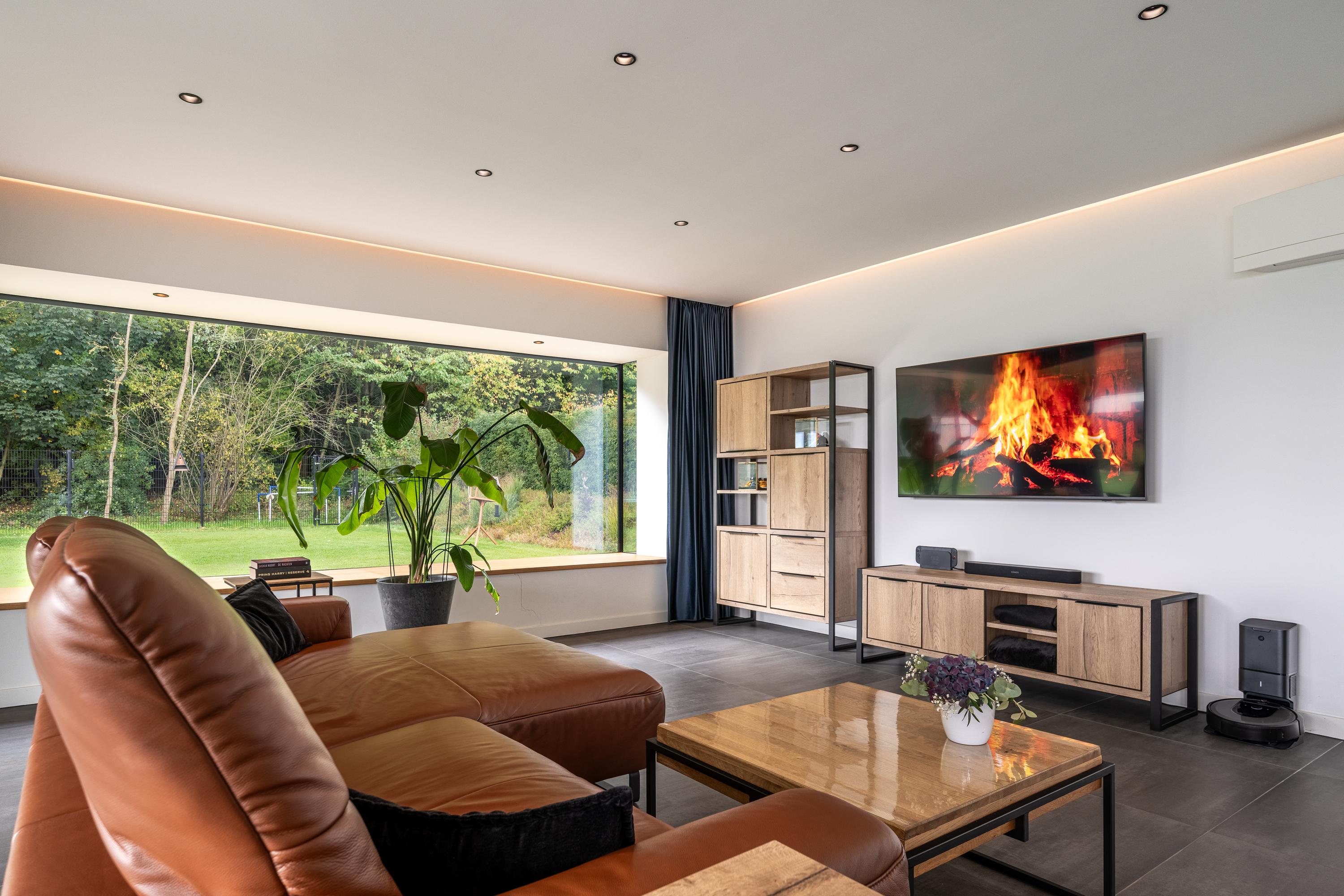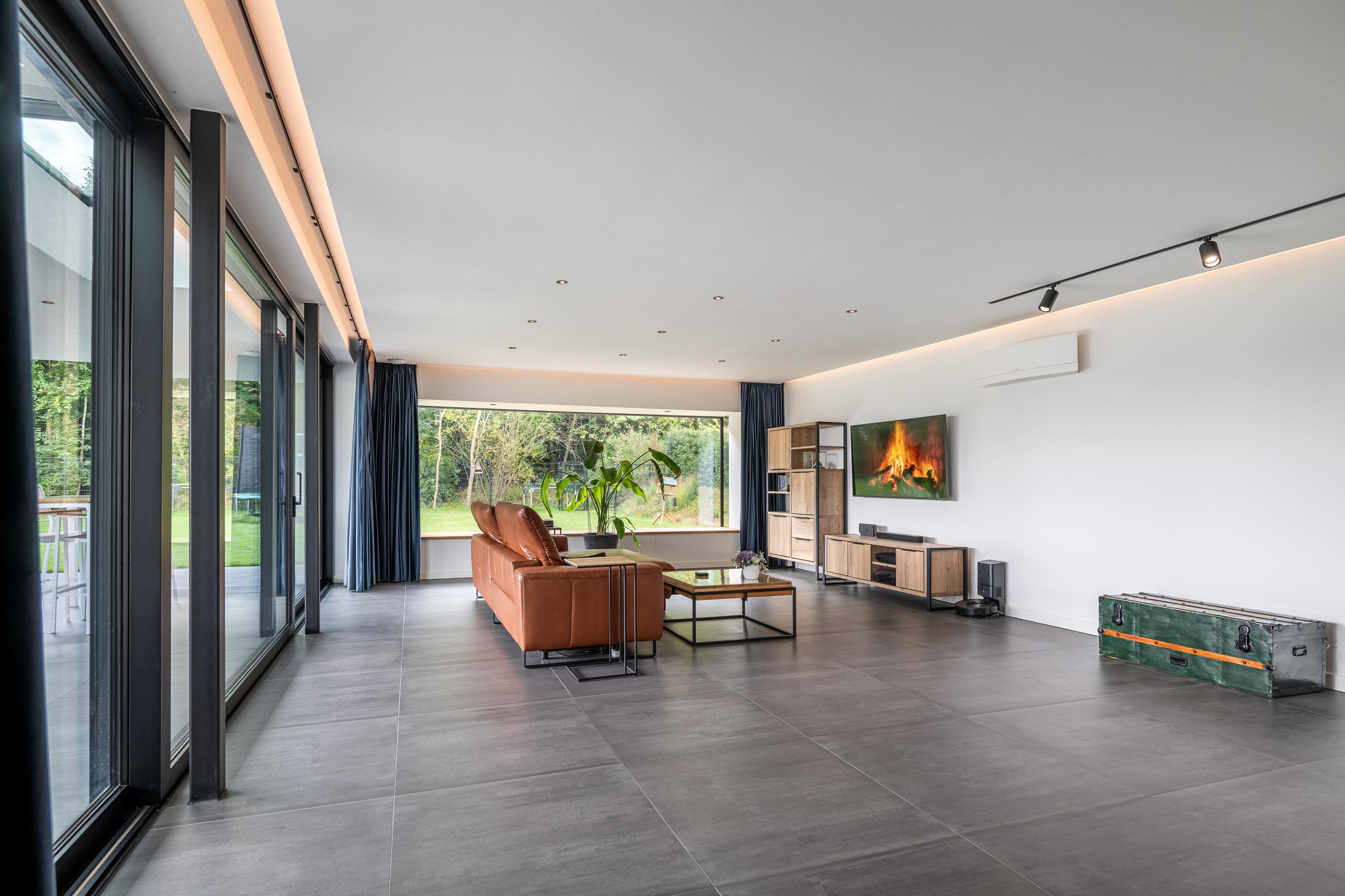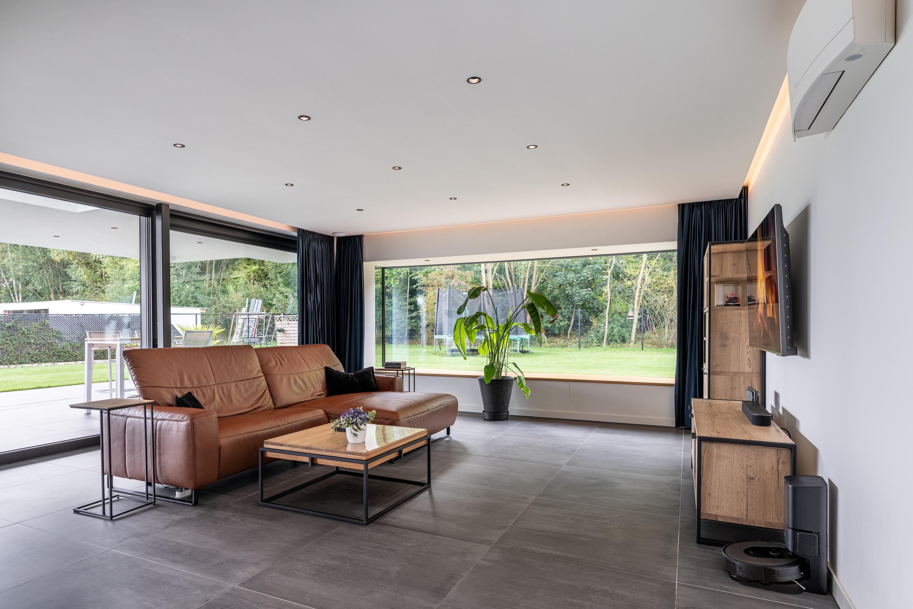 The living room is spacious and enjoys plenty of natural light thanks to the large windows all around. The abundance of glass not only provides beautiful natural light, but also an optimal view of the garden.