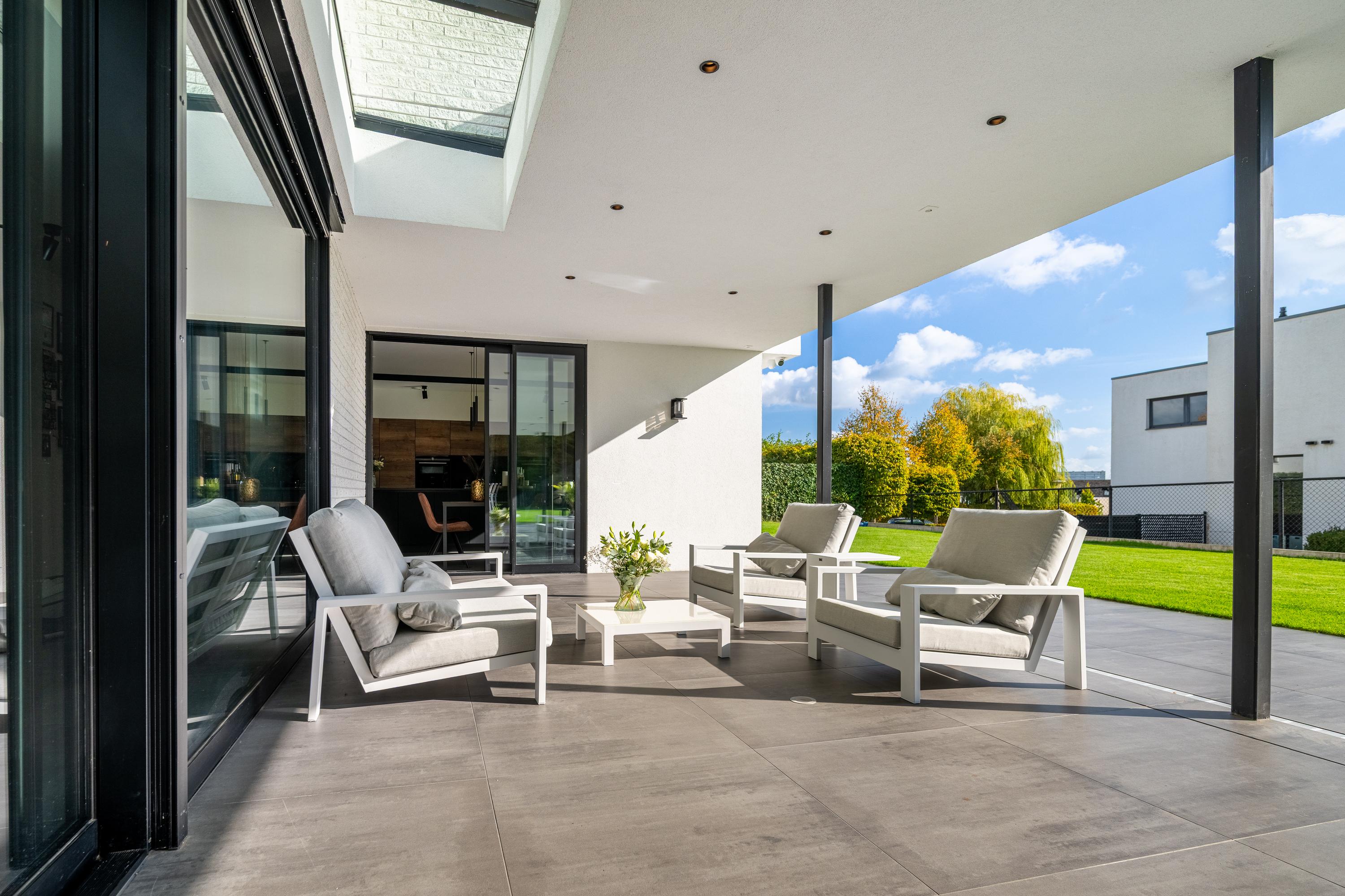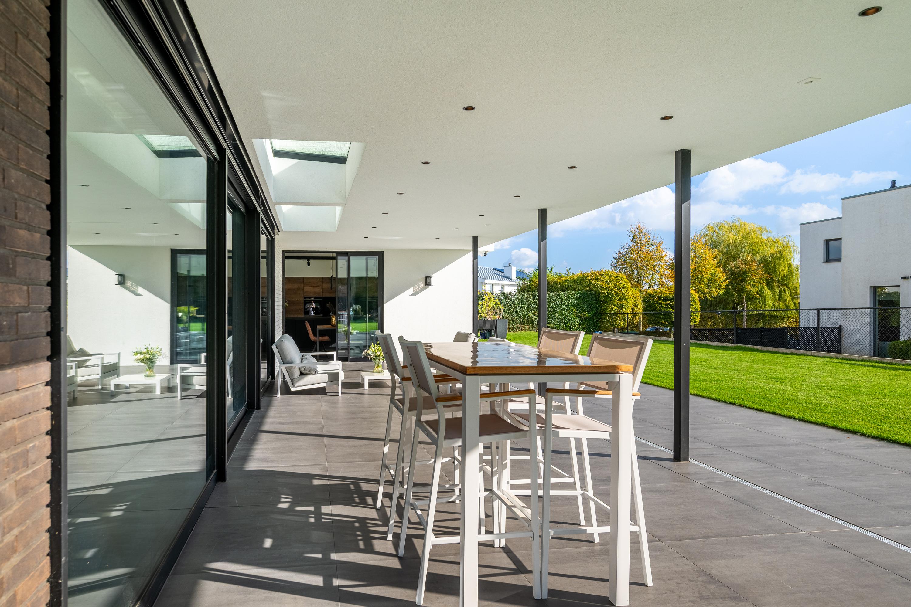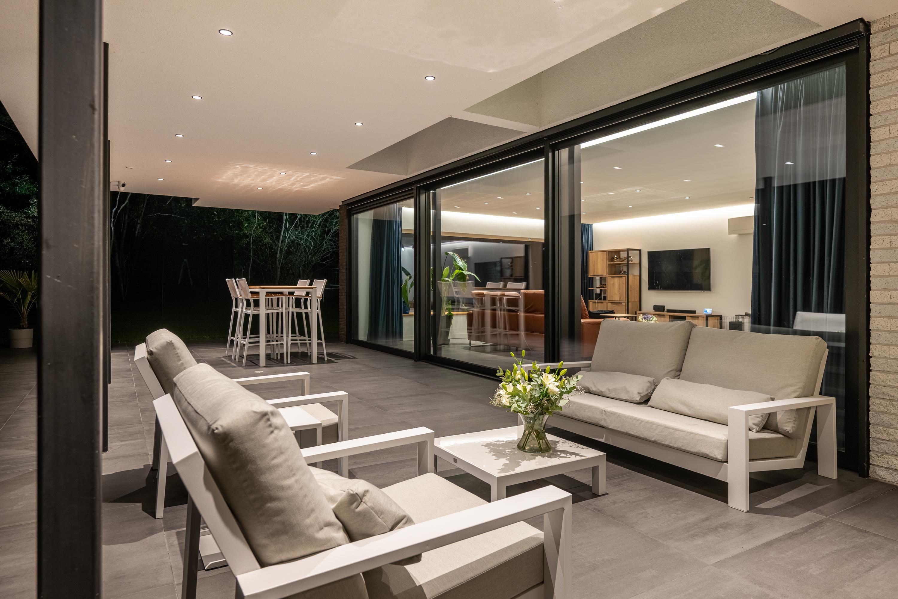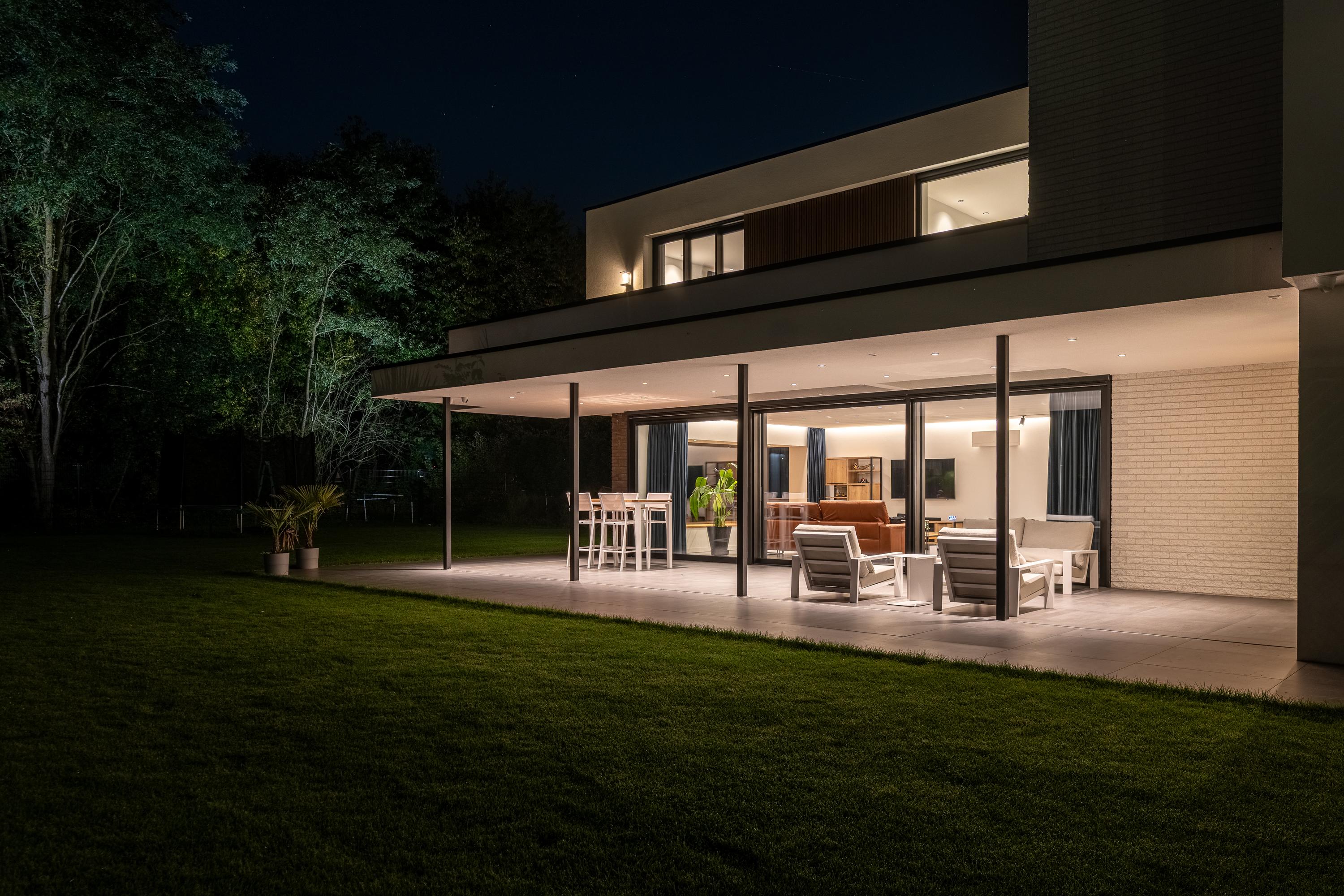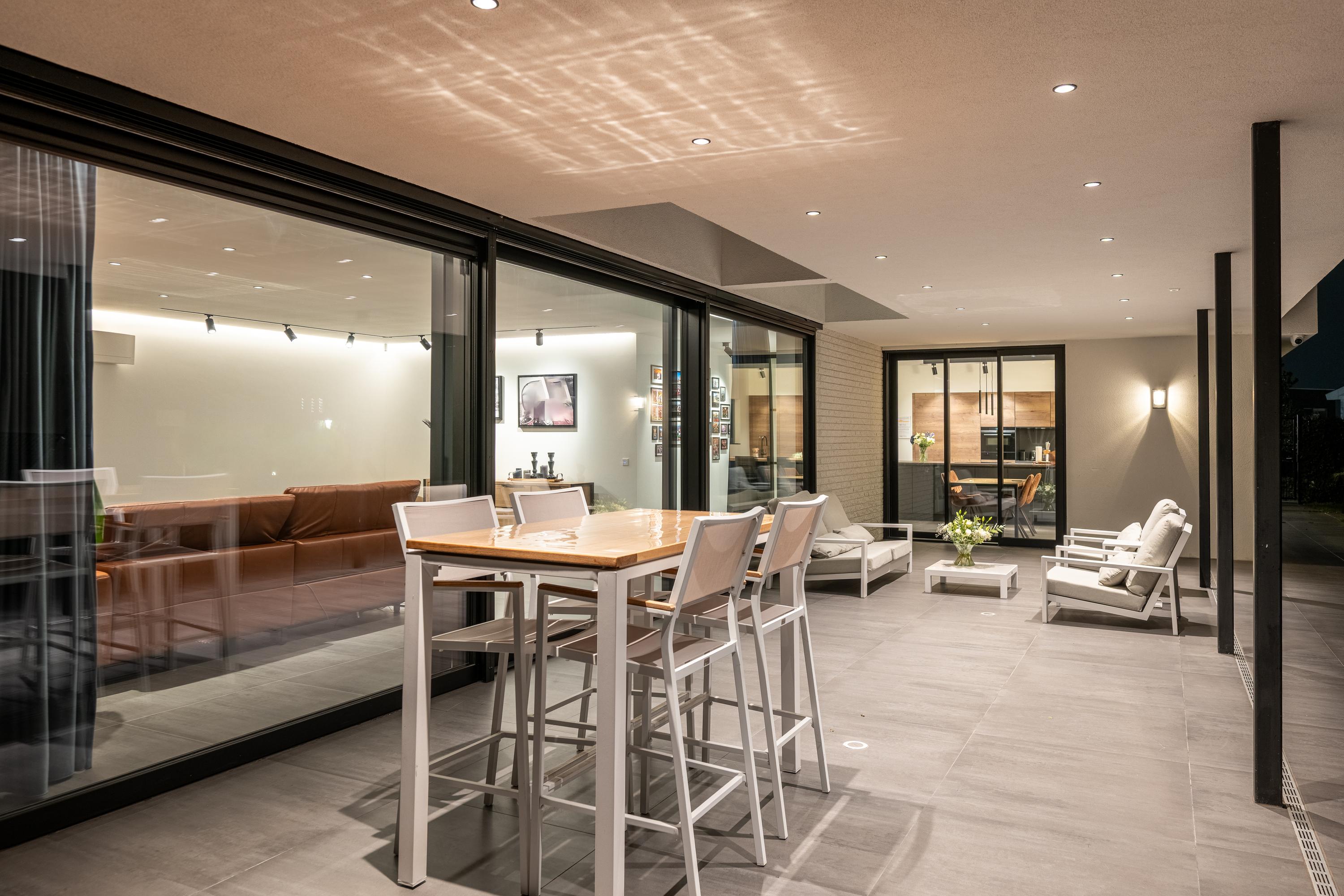Thanks to the spacious canopy, you can enjoy shade on sunny days and comfortable shelter in inclement weather. The recessed spotlights in the ceiling create a warm, inviting atmosphere in the evening.