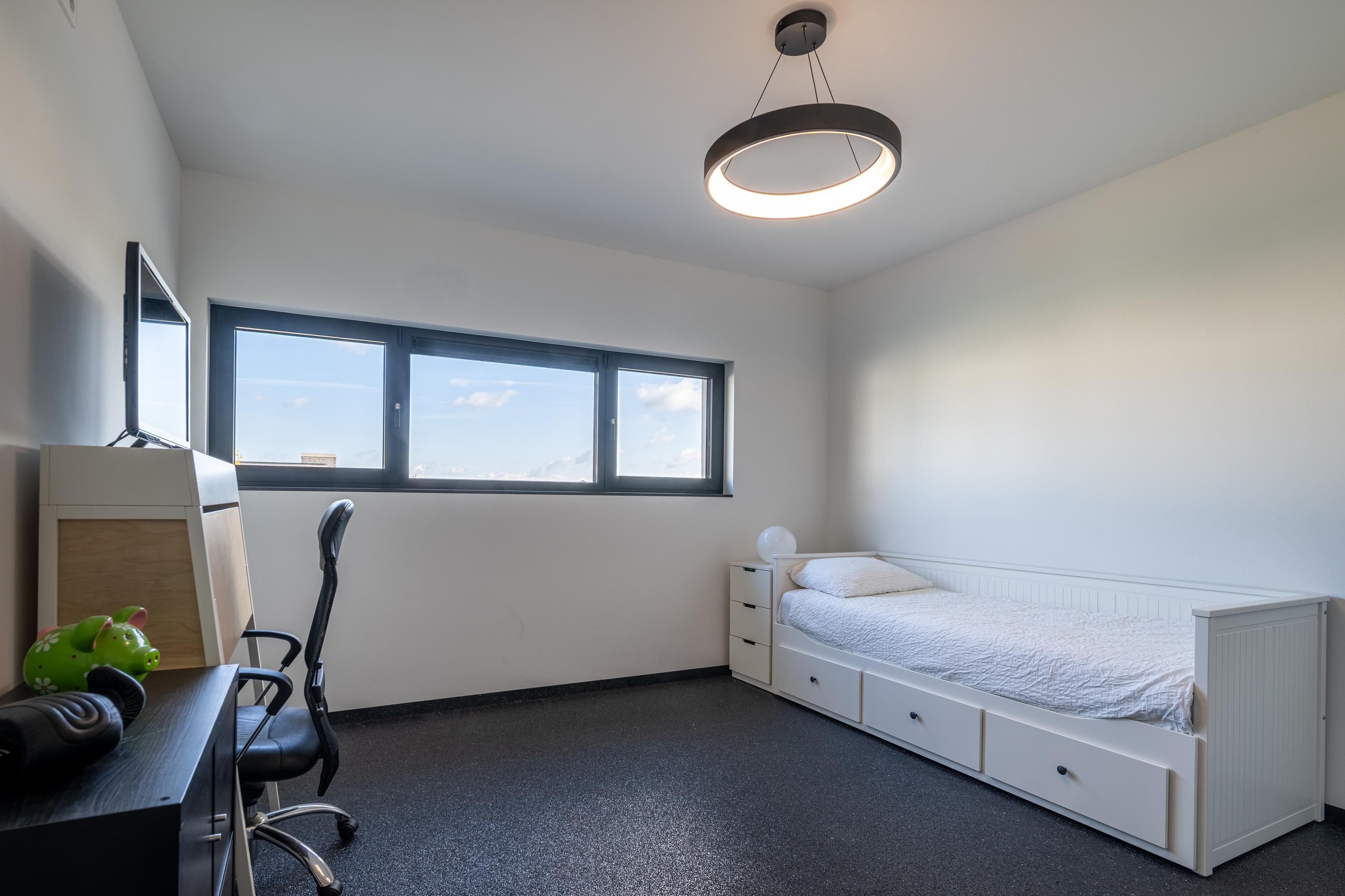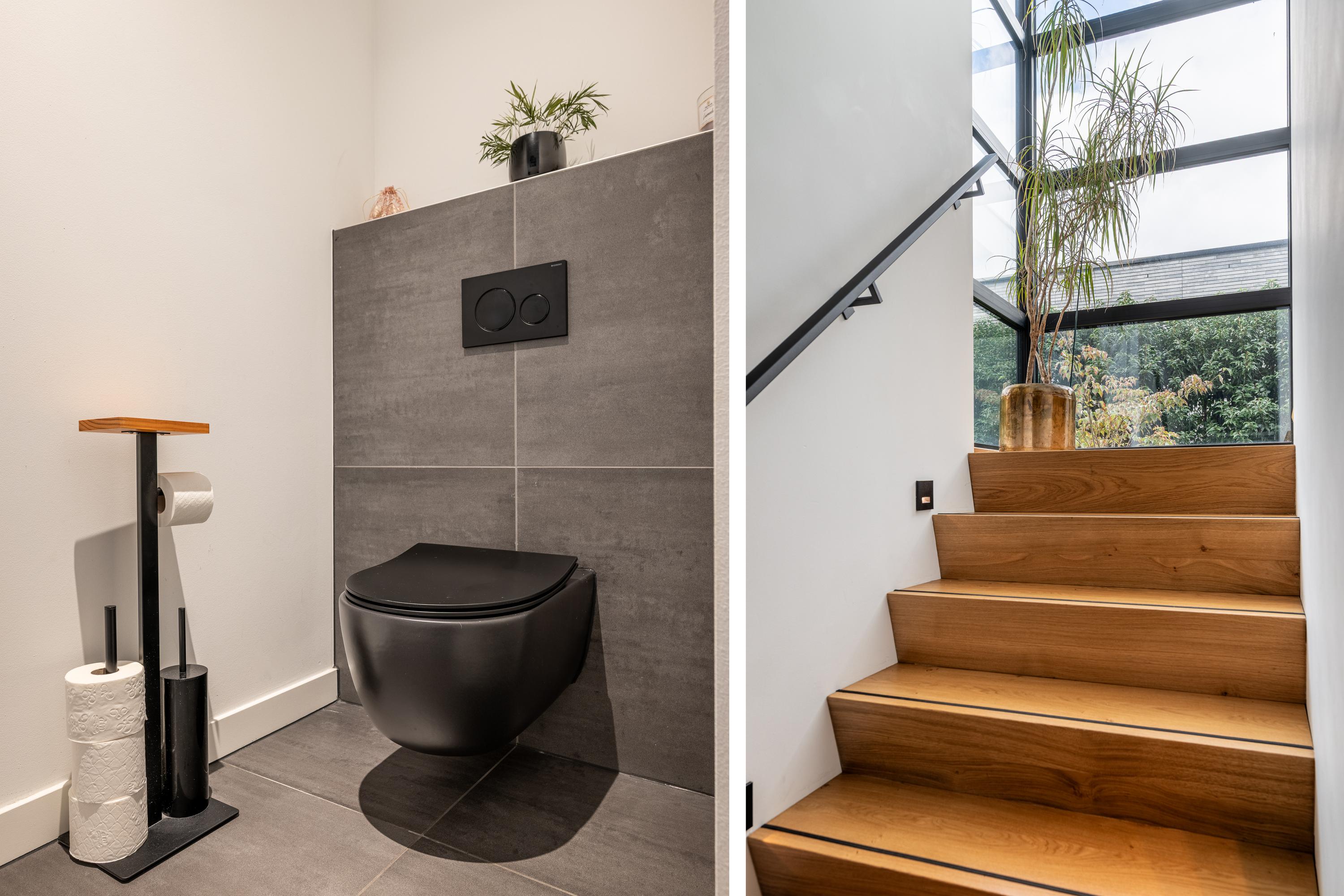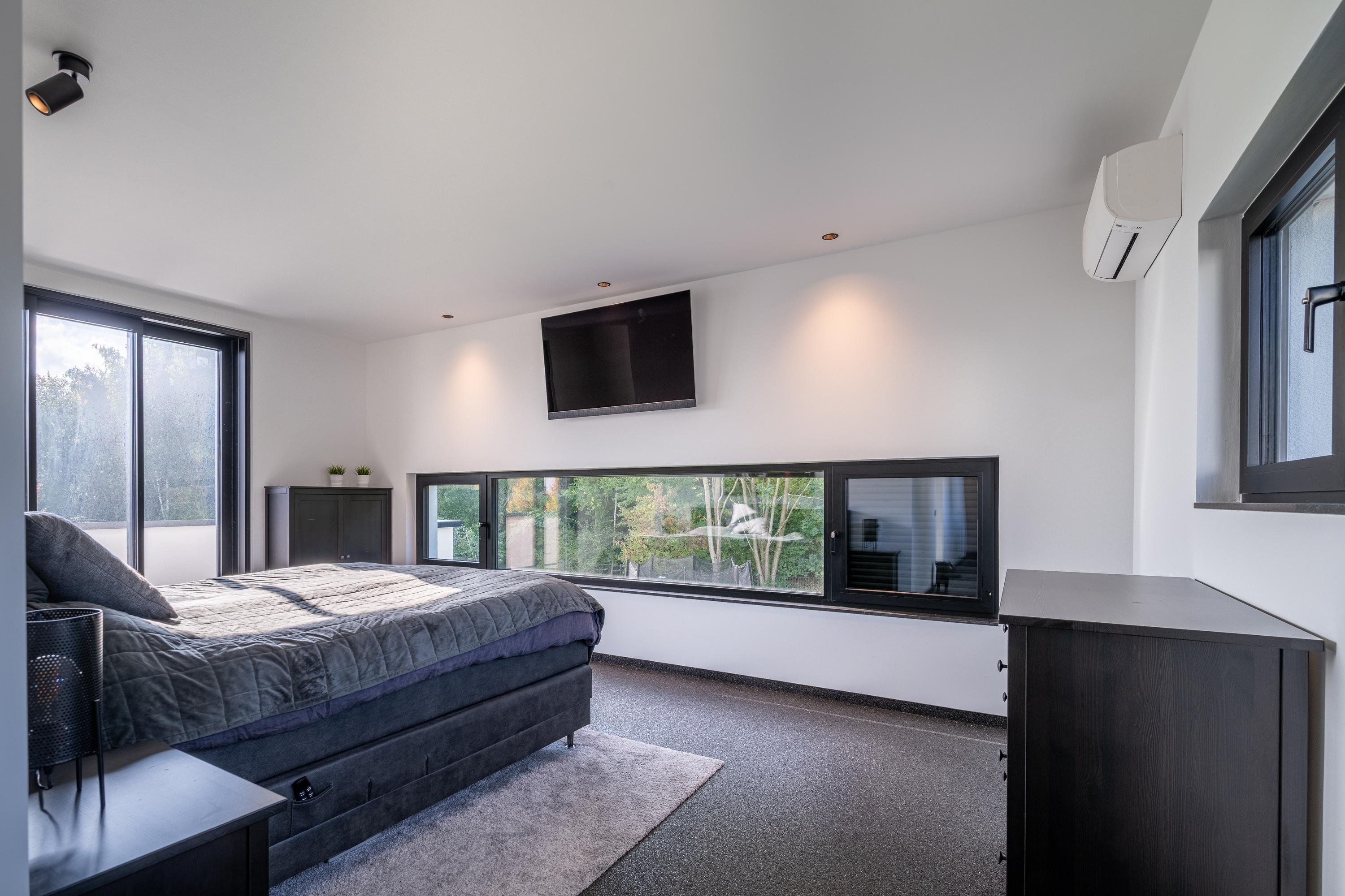A special detail is the large flower window, which provides a playful view of the garden and the edge of the forest. In combination with the large sliding doors to the covered terrace, this creates a spacious and open whole, in which inside and outside flow harmoniously into each other. The living room and kitchen are both equipped with an air conditioning unit.