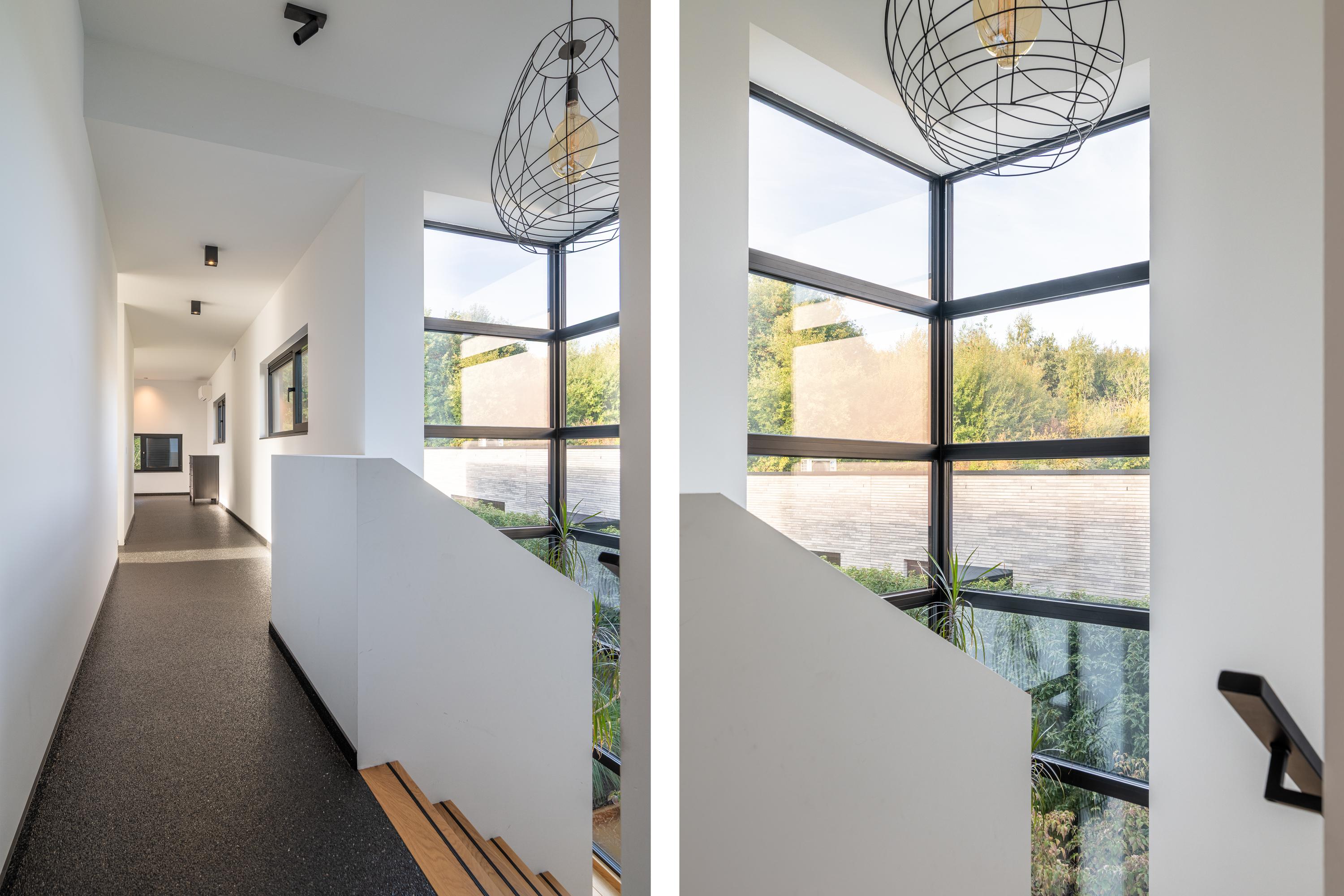 A stylish concrete staircase covered with wooden steps, surrounded by generous windows and a beautiful view of the forest edge, leads you to the first floor.