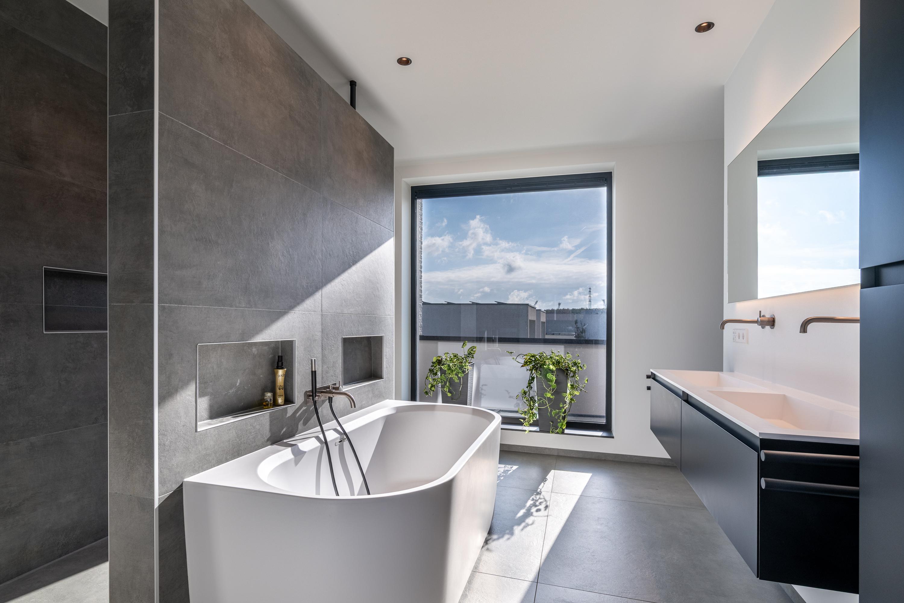 The dressing area connects to the fantastically equipped ensuite bathroom, which features a bathtub, a spacious walk-in shower with rain shower function, and a stylish double sink with vanity. A luxurious space to start the day relaxed or end it in peace and quiet.