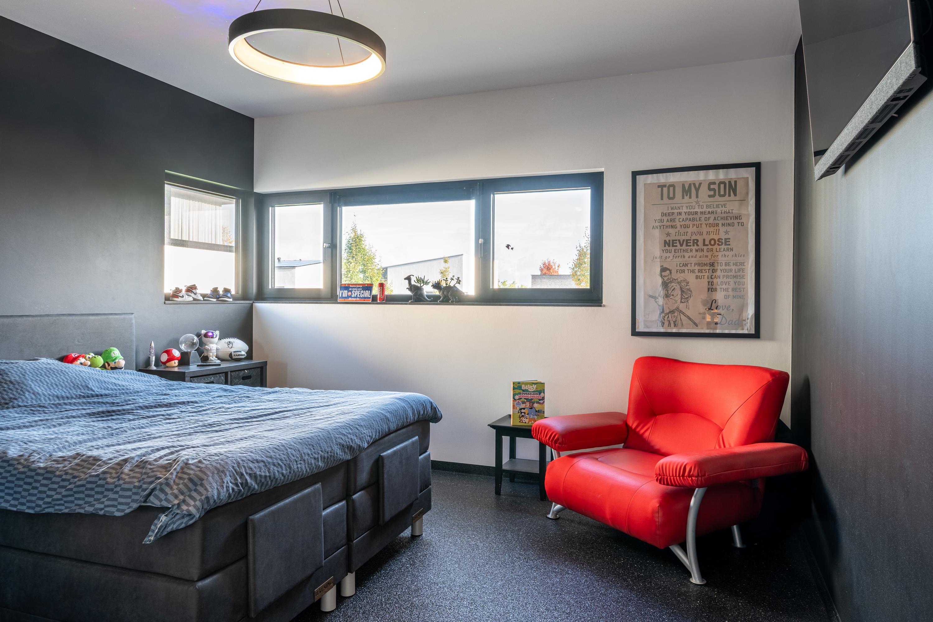 The sleeping wing is located at the front of the house and has no fewer than three full bedrooms, each of which is spacious and wonderfully light thanks to the large windows. The sleek finish with a gravel floor in all rooms creates a calm, uniform look and is also easy to maintain and durable.