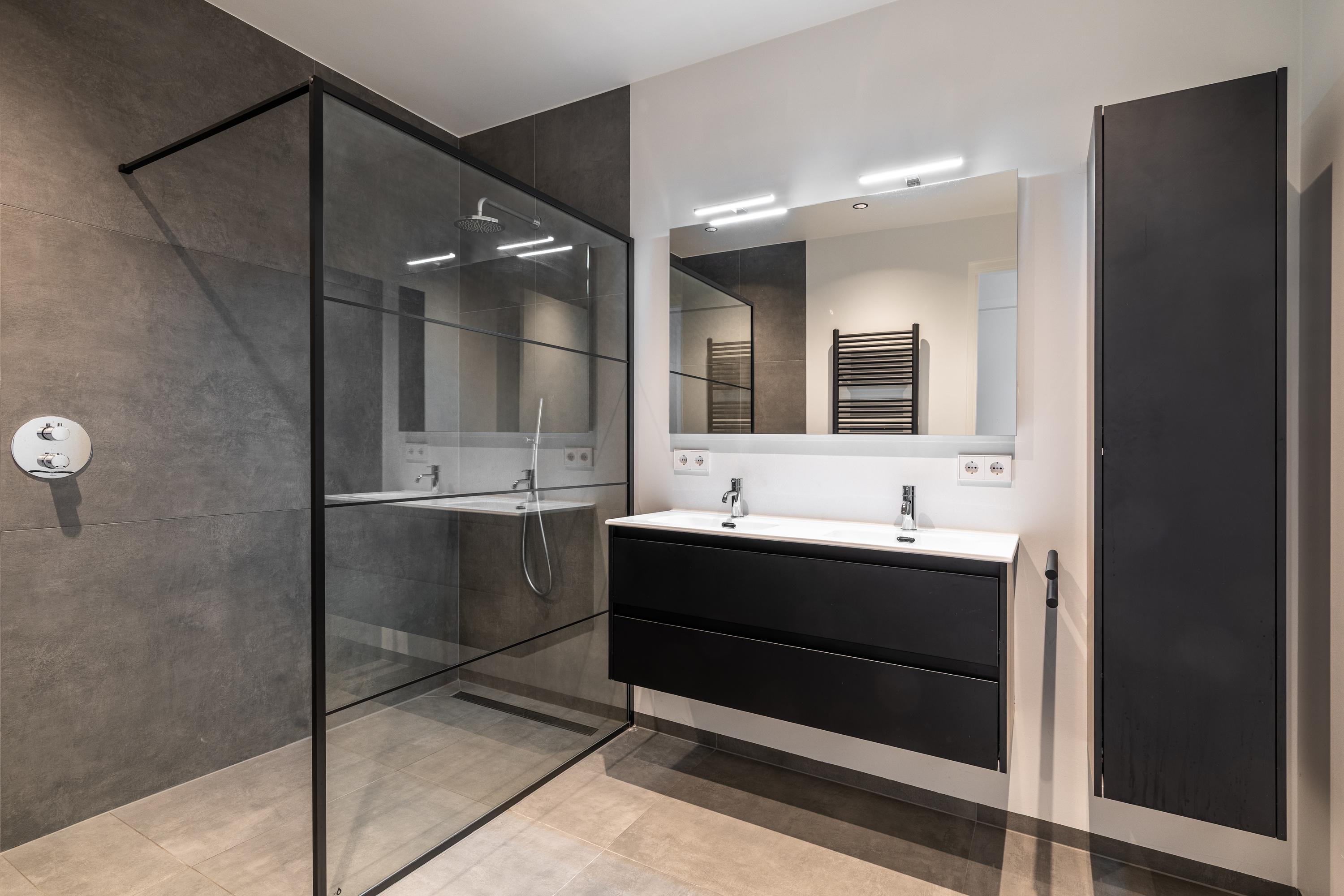 The second bathroom, accessible from the landing, has a large walk-in shower with glass wall and double sink with cabinet and mirror. There is also a separate toilet room with toilet.