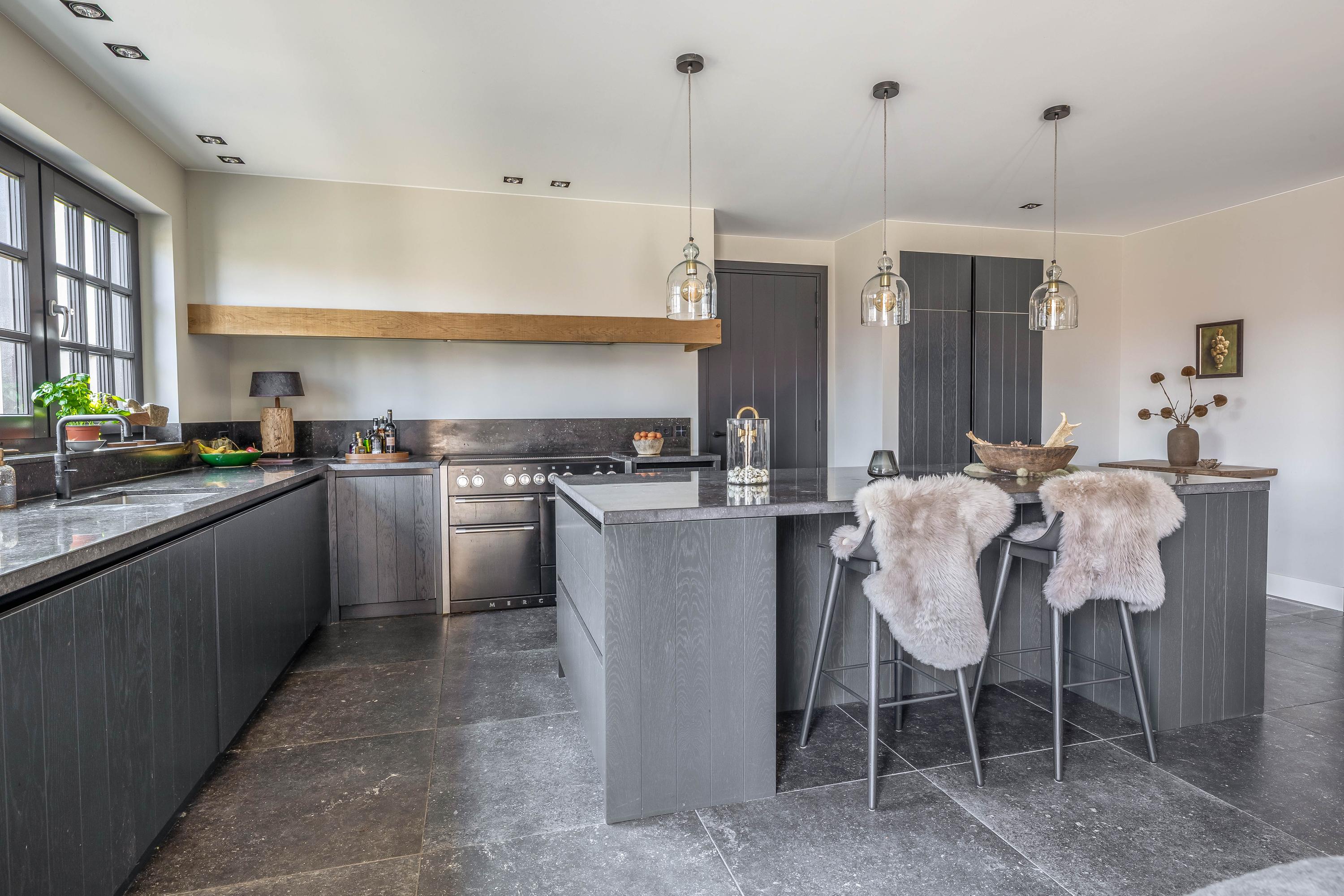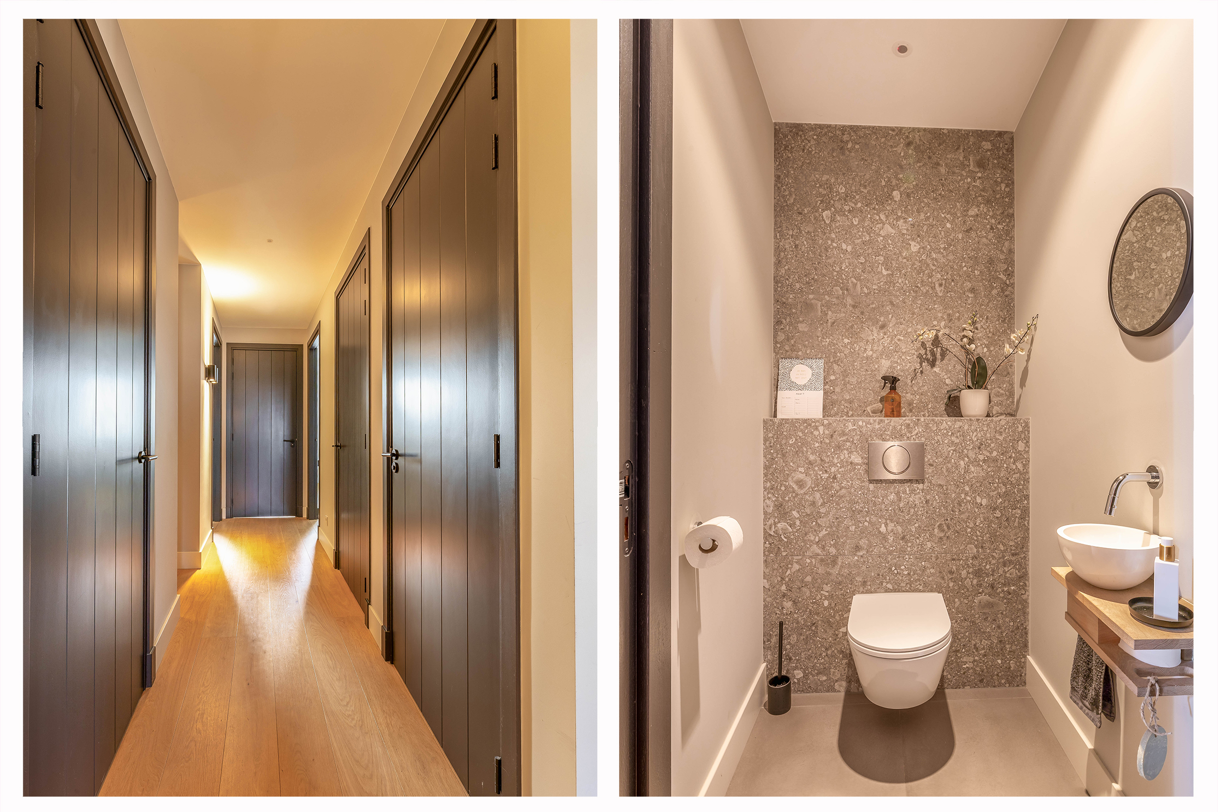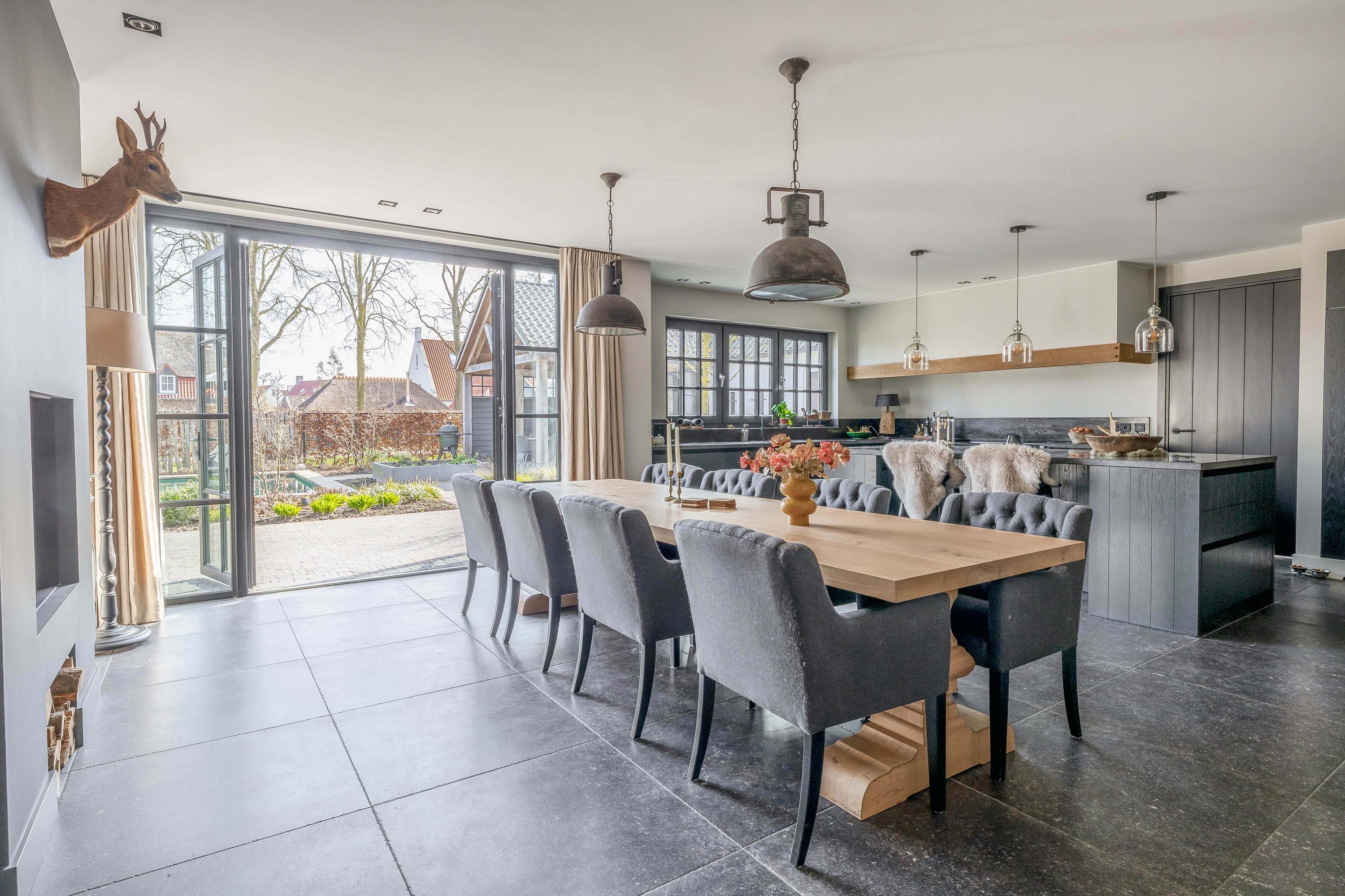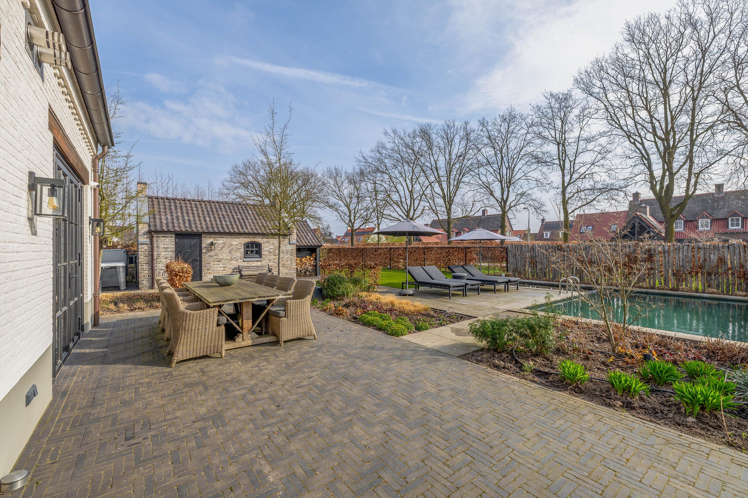 This farmhouse offers you a rare opportunity to live in an oasis of luxury, comfort, and privacy. With attention to detail, high-quality materials, and a thoughtful layout, every floor showcases a cohesive design where ceramic tiles, an oak herringbone floor, and meticulously applied stucco unite to form a warm and elegant whole. The seamlessly coordinated materials and finishes give every space a refined, consistent look.