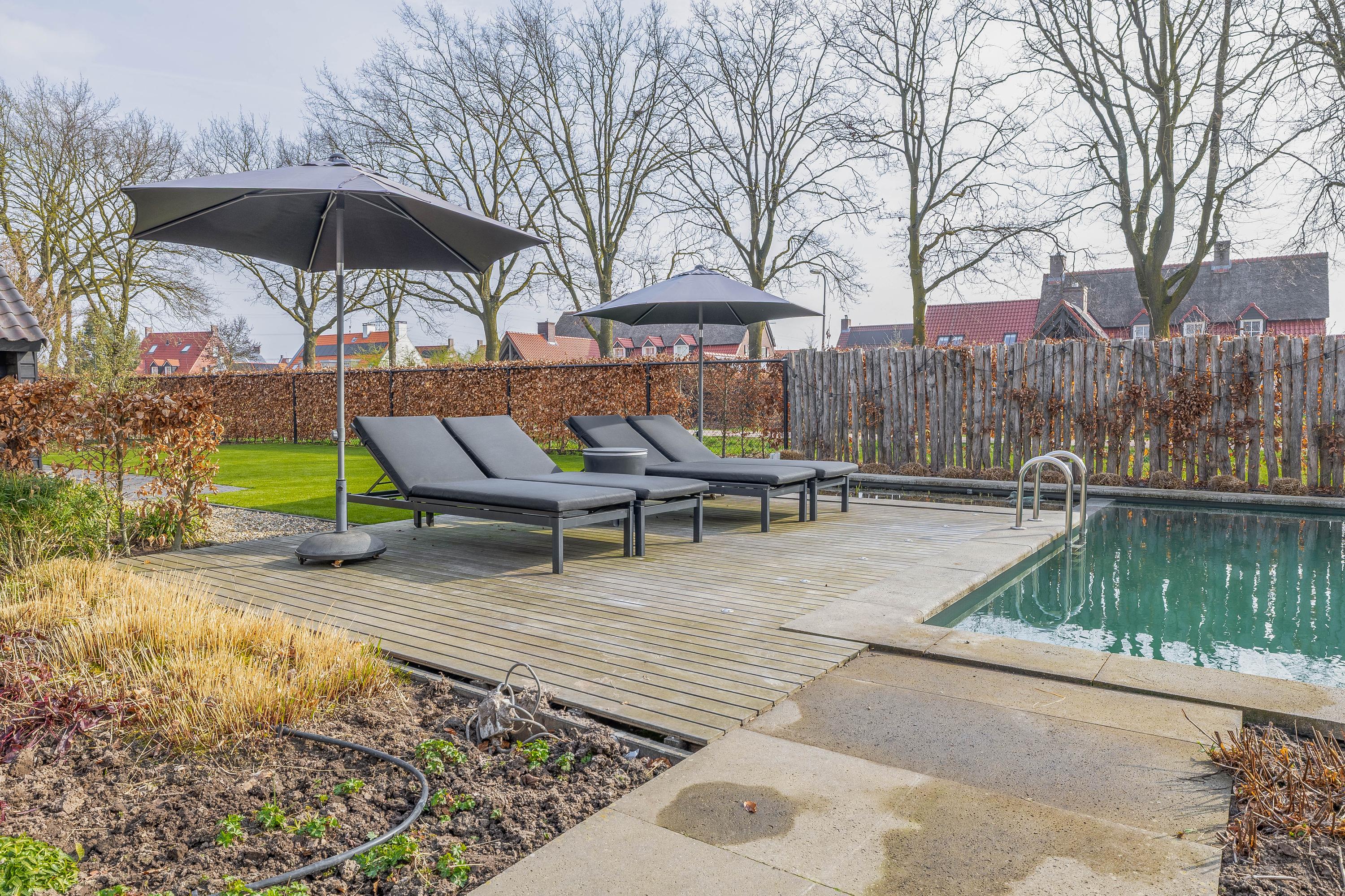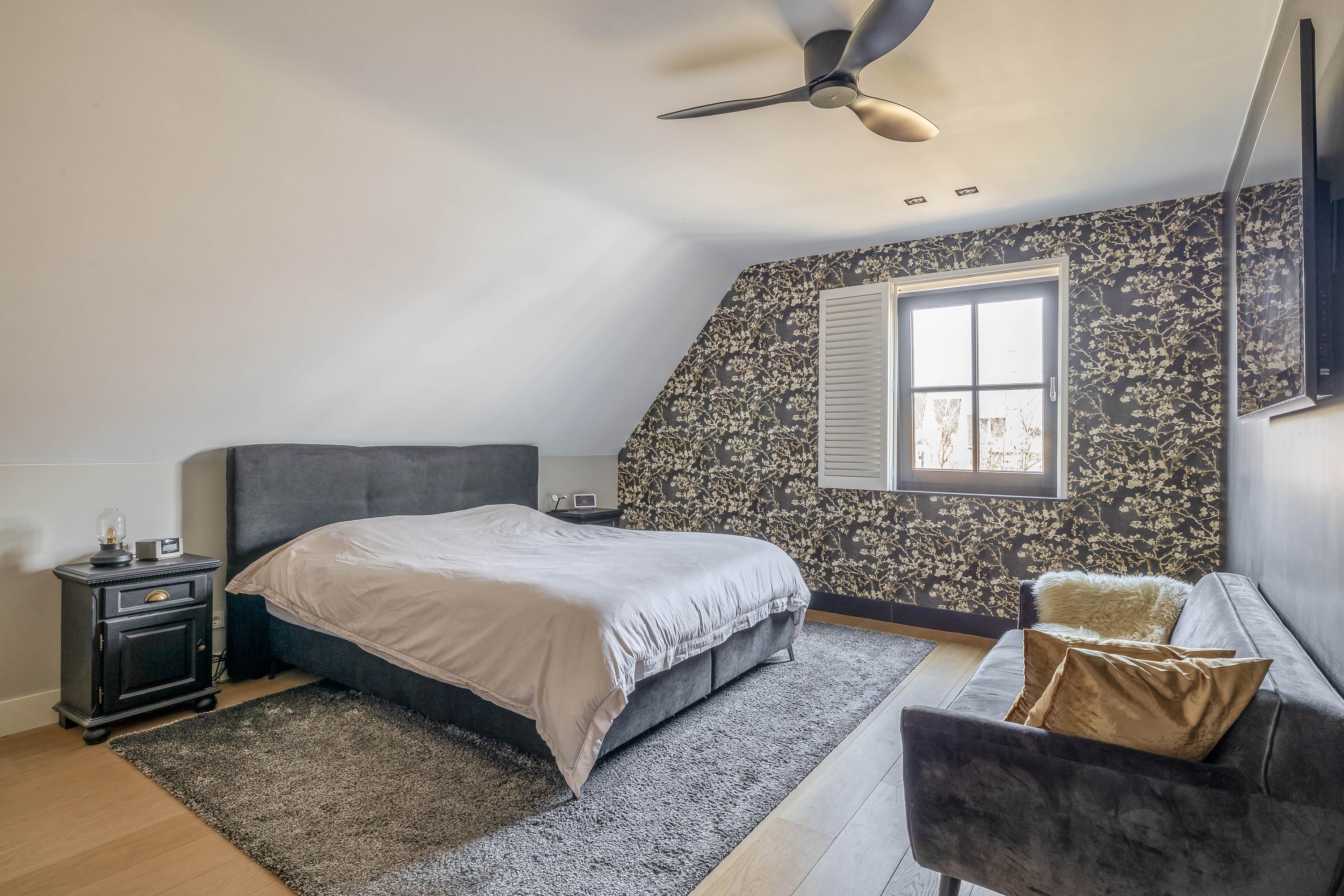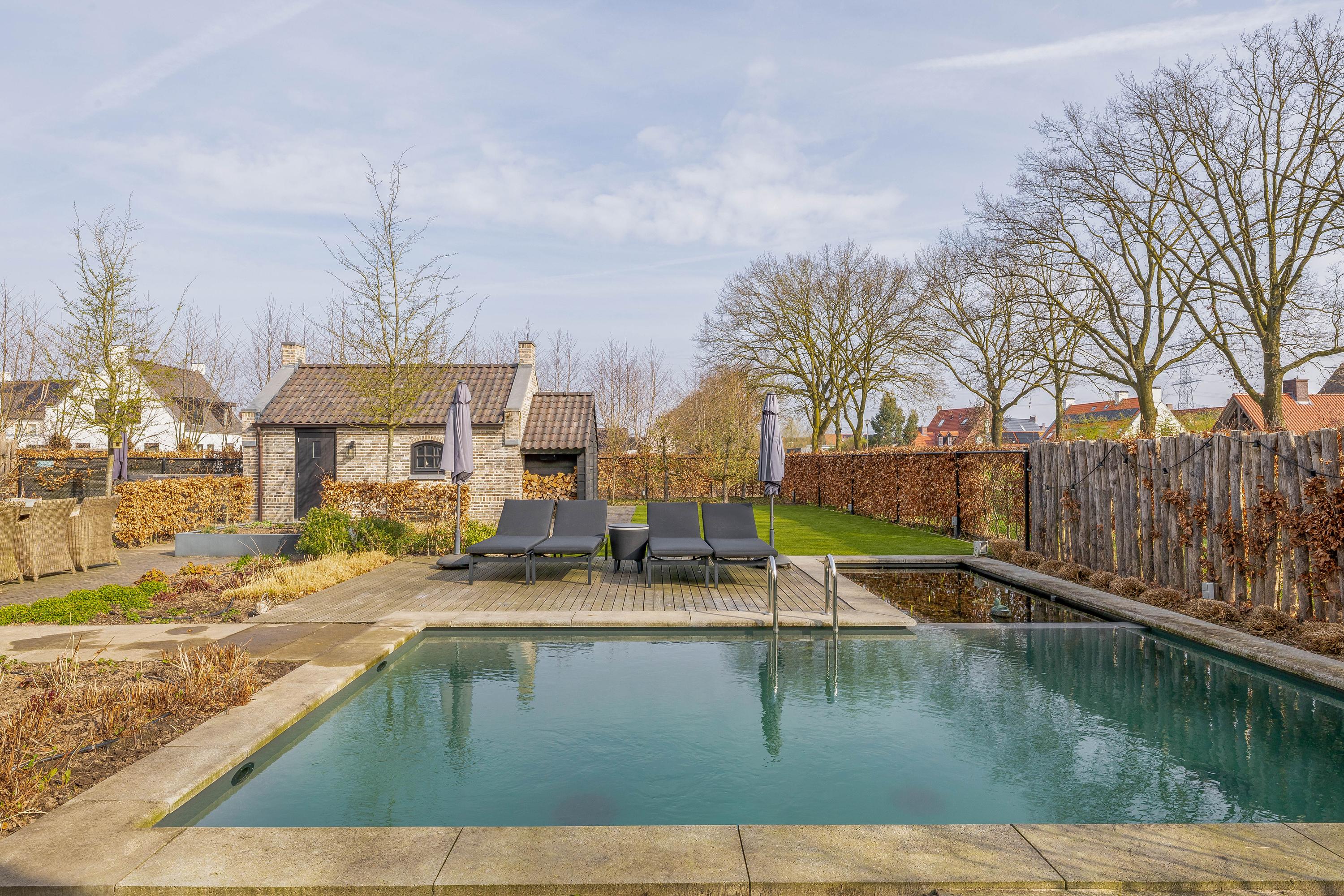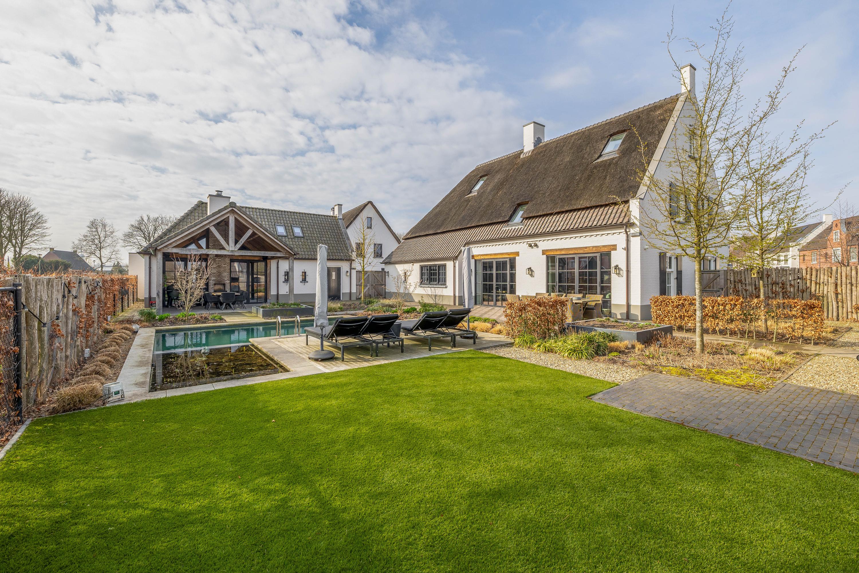 The adjacent (fully insulated) garden shed, with a high continuous ceiling, is perfect for use as a chill-out space, studio, or extra office. The garden shed is styled in harmony with the house. The garden, landscaped by an architect, is a true work of art with rich borders, elegant hedges, atmospheric pathways, and lush lawns. The carefully chosen boundary walls and playful materials create a dynamic and inviting outdoor experience. Not to mention the water paradise, which flows into a rustic pond area, creating a perfect balance between luxury and nature.