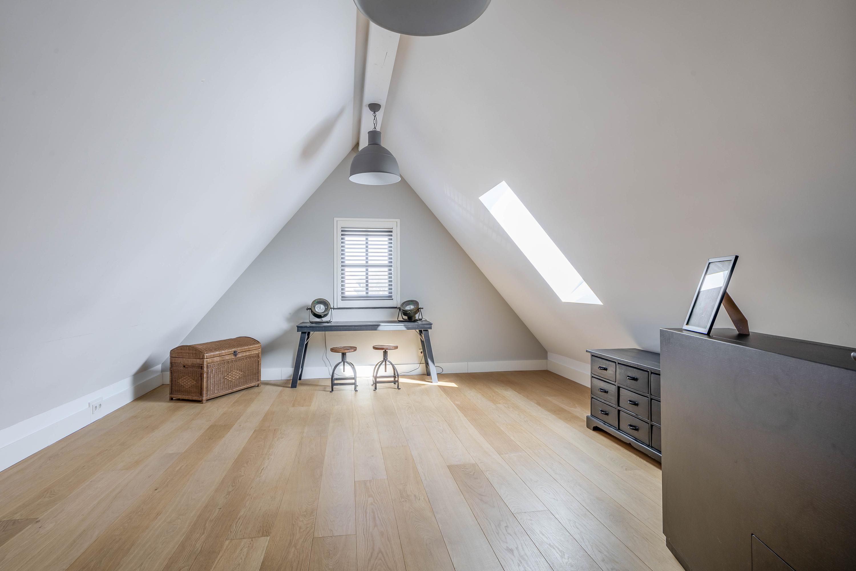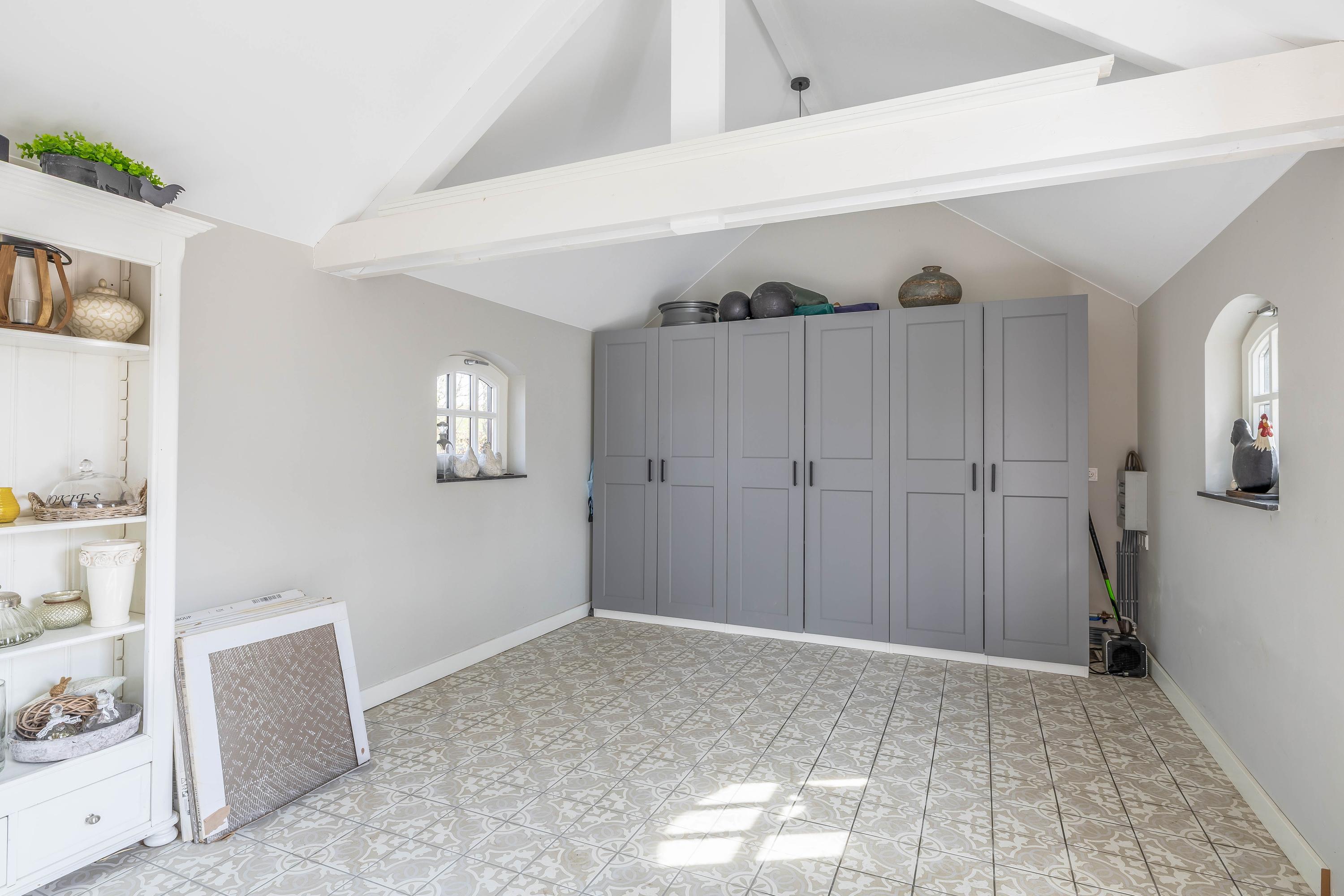 Via a fixed staircase, you reach the second floor, where the landing provides access to various multifunctional spaces. A practical laundry room with appliance setups, an additional workroom or bedroom, and extra storage space make this floor especially adaptable to your needs.