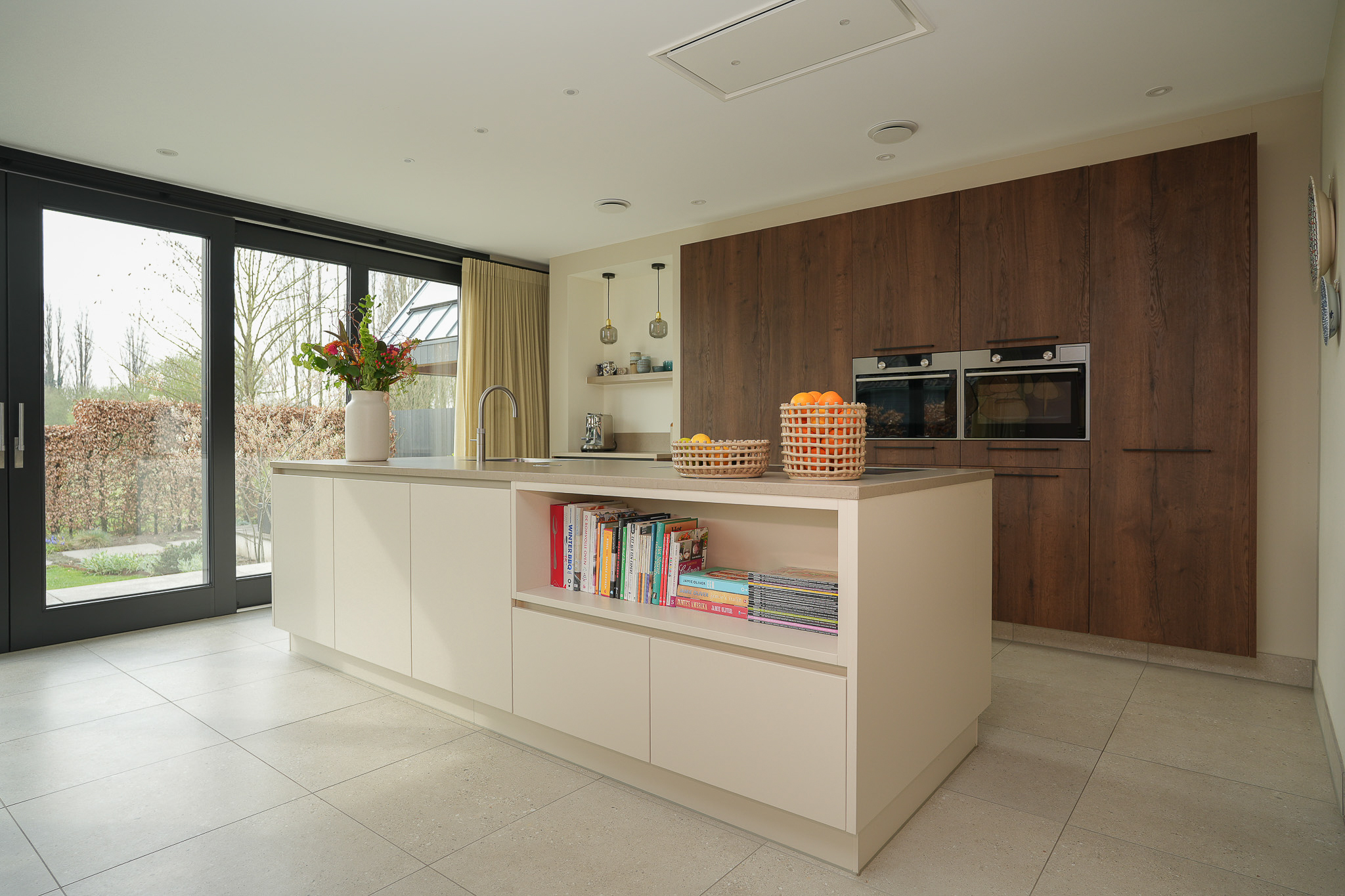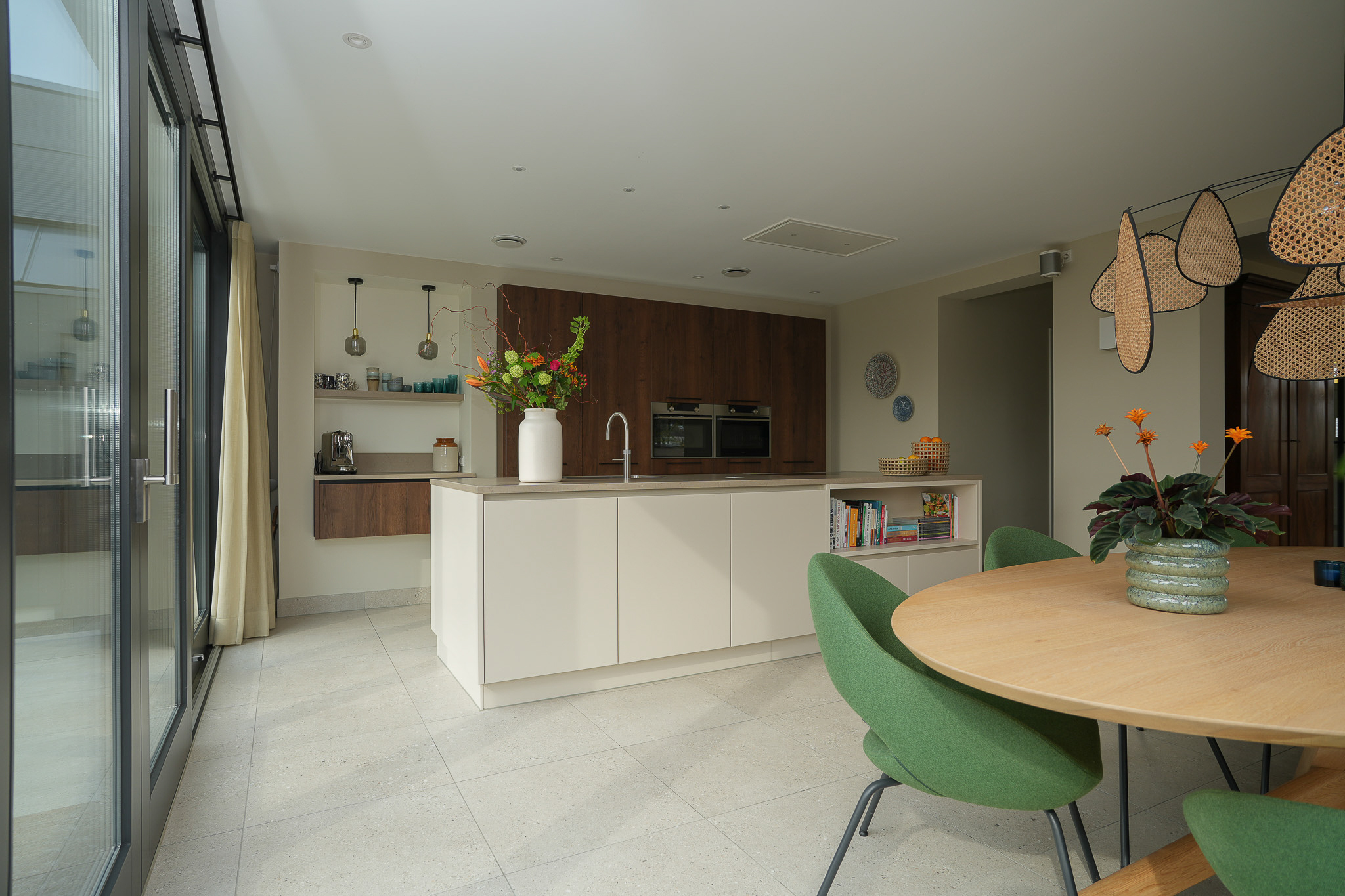The cabinetry is partly integrated into the wall and fitted with high-quality built-in appliances, creating a calm and cohesive look. The coffee corner is a thoughtful and practical feature. There is ample workspace and storage, as well as plenty of room for a generous dining table.