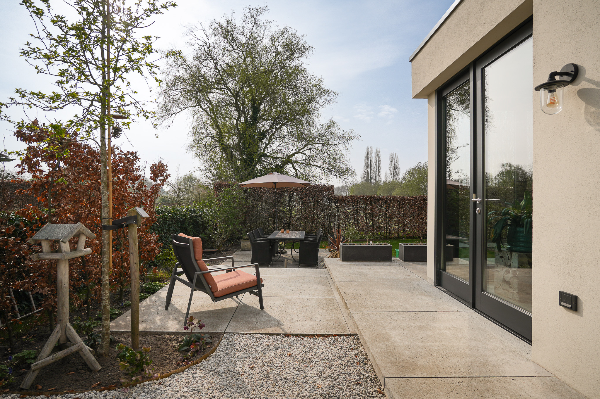 The architect-designed garden is west-facing, enjoying sunlight from early morning until late evening. It has been thoughtfully laid out with multiple terraces, planted borders and a pleasant balance between openness and privacy. Directly adjacent to the house is a sunny terrace, while further into the garden several areas have been created to enjoy sun or shade at any time of day.