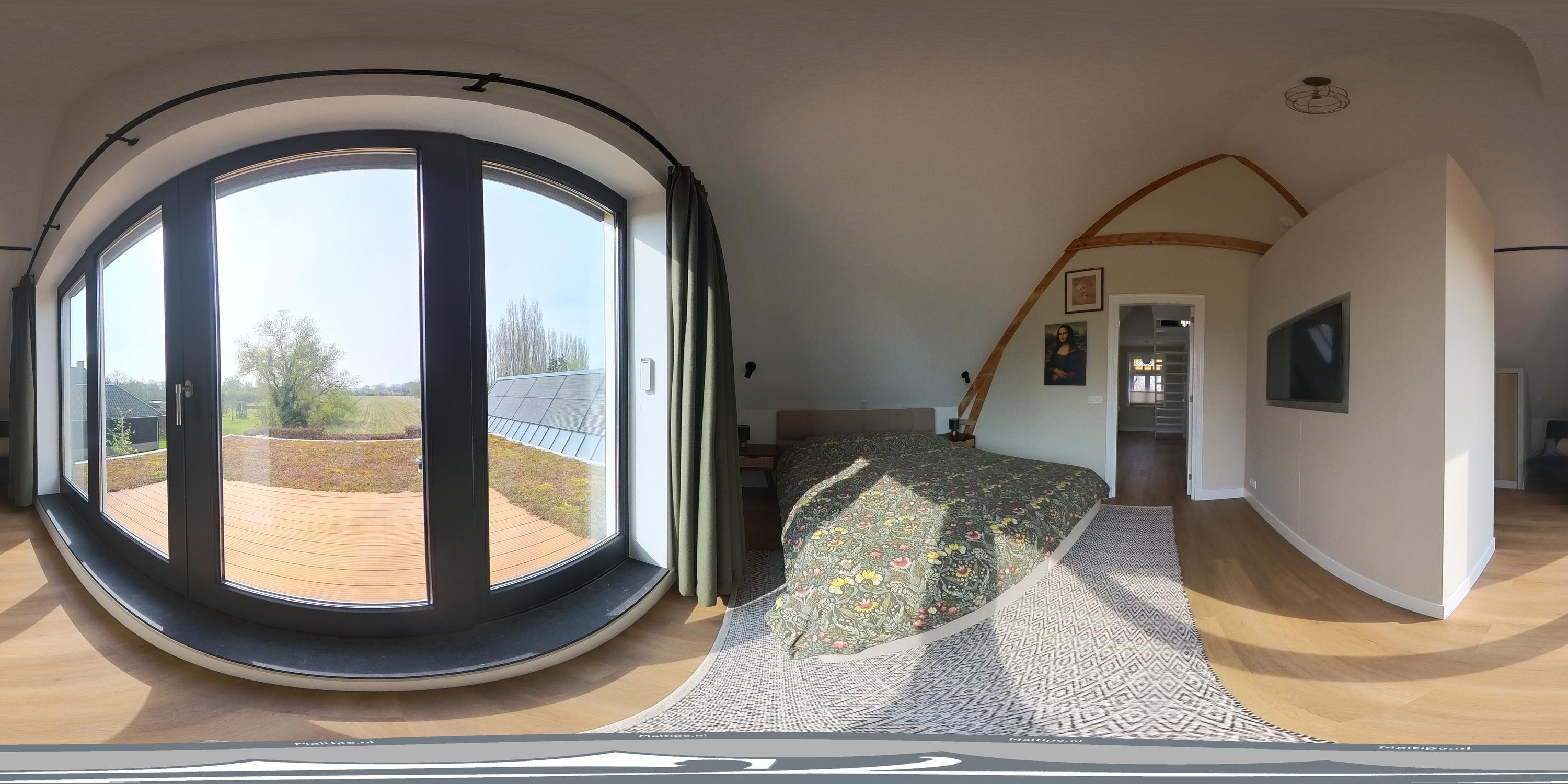 At the rear is the main bedroom, a calm and light-filled space with unobstructed views over the surrounding fields and the dike. Adjacent is the walk-in closet, fitted with custom cabinetry. From here, a black steel door leads into the bathroom. In addition, the bedroom provides access to the sedum-covered flat roof of the kitchen extension, where a terrace has been created — a sheltered spot with open views over the greenery.