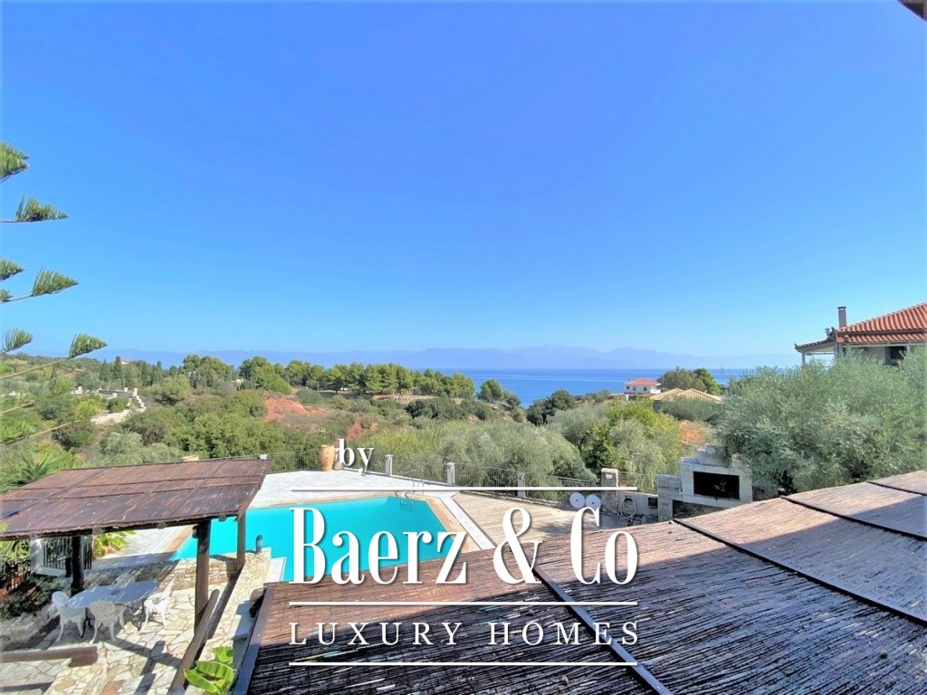 access to the terrace of the building from which one can enjoy the sea view. Continuing we find the two bedrooms, along with a bathroom and a small WC. On the lower elevation one finds two different apartments. Each has an open plan living and kitchen area, bathroom as well as bedroom areas. The surrounding area offers all amenities as it has been landscaped with a BBQ, a covered seating area by the pool and stone decorative details. This is a property of excellent construction and beauty that can combine both permanent home ownership and holiday home use.