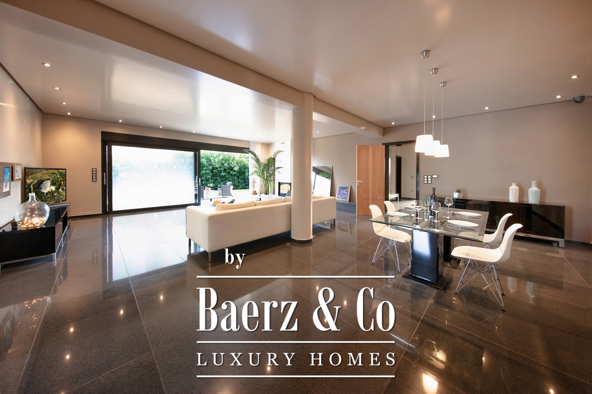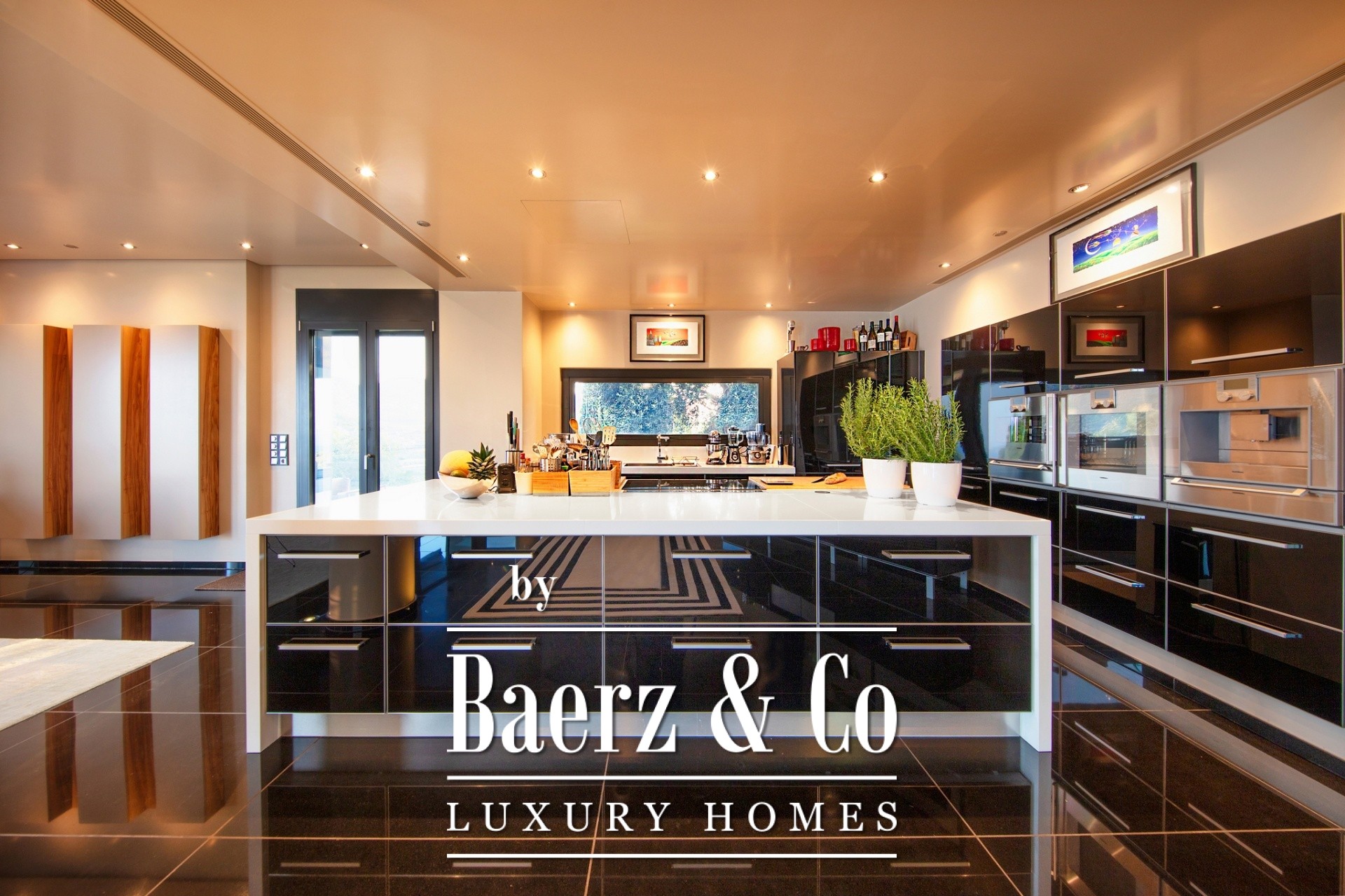 A 155 m² guesthouse on the ground floor creates autonomy for visitors, while storage and utility areas total 170 m². Underfloor heating, geothermal systems, and Gaggenau and Siemens kitchen appliances speak to both efficiency and elevated functionality. The grounds, punctuated by olive trees aged between 100 and 600 years, employ automated irrigation, maximizing sustainability.