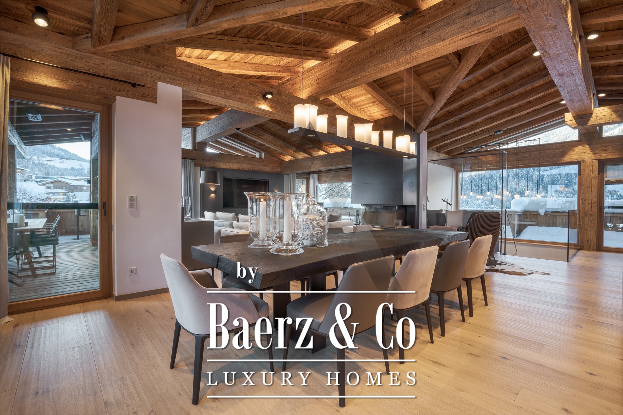 Chalet Kirchberg in Tirol presents an interplay of architecturally refined Alpine living and contemporary design. This property, built in 2018, extends across 312 m² and rests on a gentle slope at the edge of the iconic village, with direct proximity to both the ski slopes and the tranquil Spertental valley. In this chalet, generous spaces invite quiet retreat or convivial gathering, anchored by a vast living, dining, and kitchen area, all framed by exposed reclaimed wood beams and an open stone fireplace. A chef’s kitchen equipped with BORA, teppanyaki grill, Miele appliances, deep fryer, and Liebherr wine cabinets anticipates both culinary craft and simple comfort. Wraparound balconies, partly covered, open the interiors to southern and northern mountain panoramas, ensuring abundant natural light throughout the year.