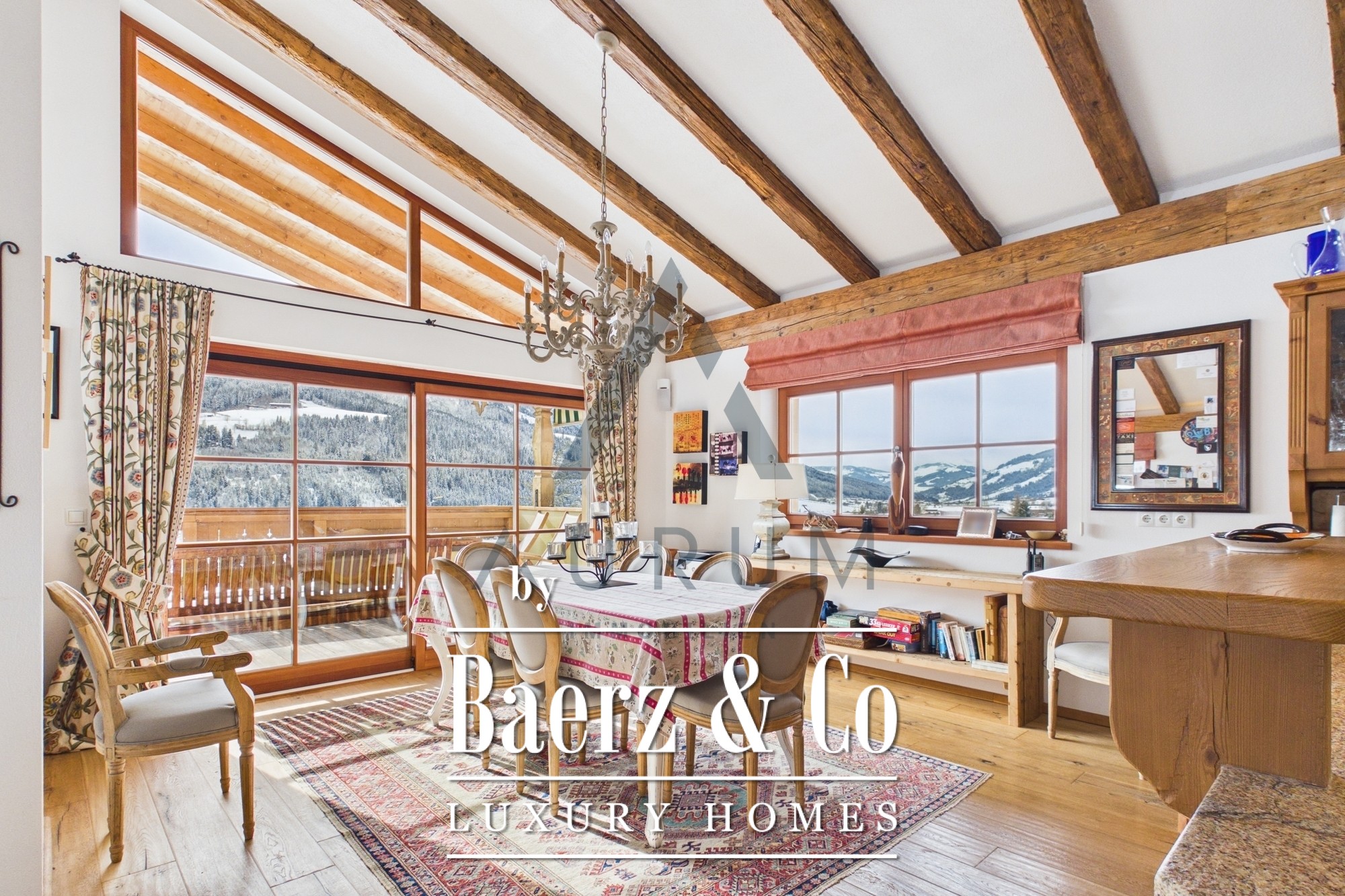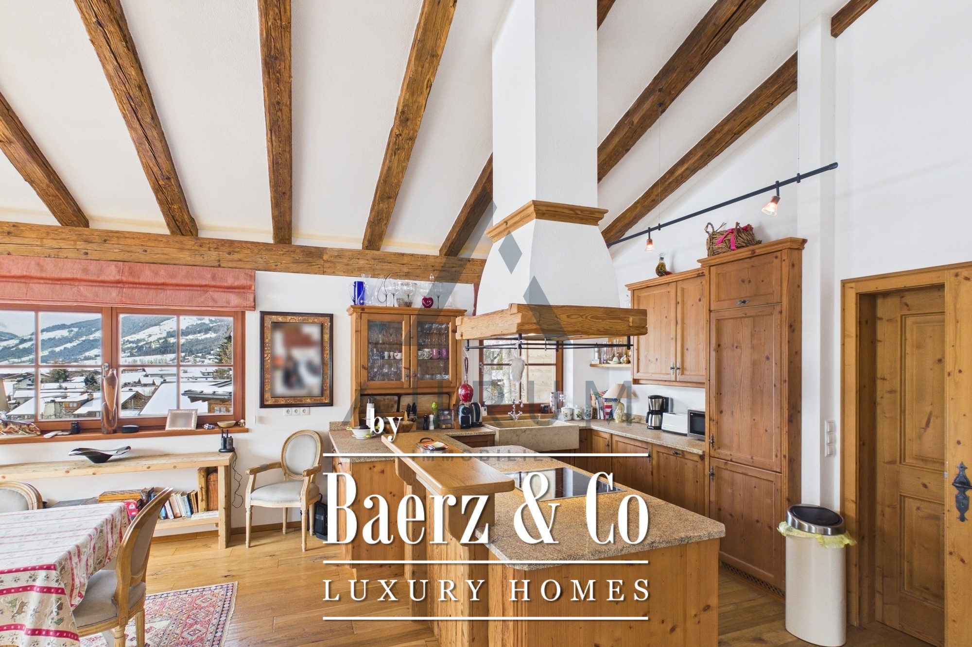 Penthouse maisonette Kirchberg in Tirol stands as a rare alpine residence, offering 197 m² of thoughtfully arranged living space over three floors in a discreet, sunlit position just above the village center. This penthouse maisonette welcomes you with a traditionally inspired, light-filled top floor. A living and dining room, accented by antique wood trusses and an open fireplace, flows into a country-style kitchen and out to a balcony that grants sweeping views of the Großer Rettenstein and Brixental valley. Floor-to-ceiling windows keep the alpine light central, while underfloor heating and solid wood floors create an atmosphere of enduring warmth.