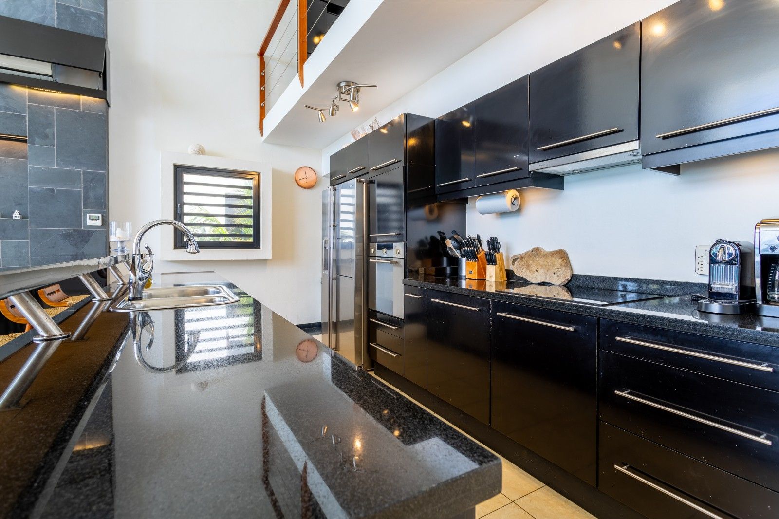 The villa features 4 bedrooms, each with its own en-suite bathroom. The master bedroom, located on the ground floor, includes a private balcony overlooking the Caribbean Sea, as well as a spacious bathroom with both a bathtub and shower. On the upper level, there are three additional bedrooms: one with a king-size bed, one with a queen-size bed, and one with two single beds.