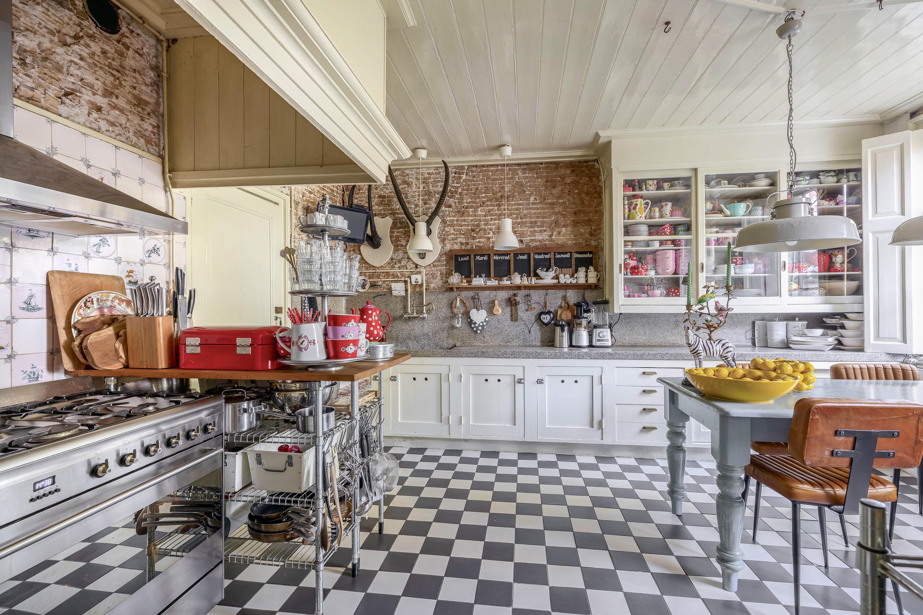 At dike level, you’ll find the charming living room with fireplace and ceiling mural, a dining room connected to the stunning conservatory via sliding doors, a bedroom, and a bathroom with an antique bathtub.