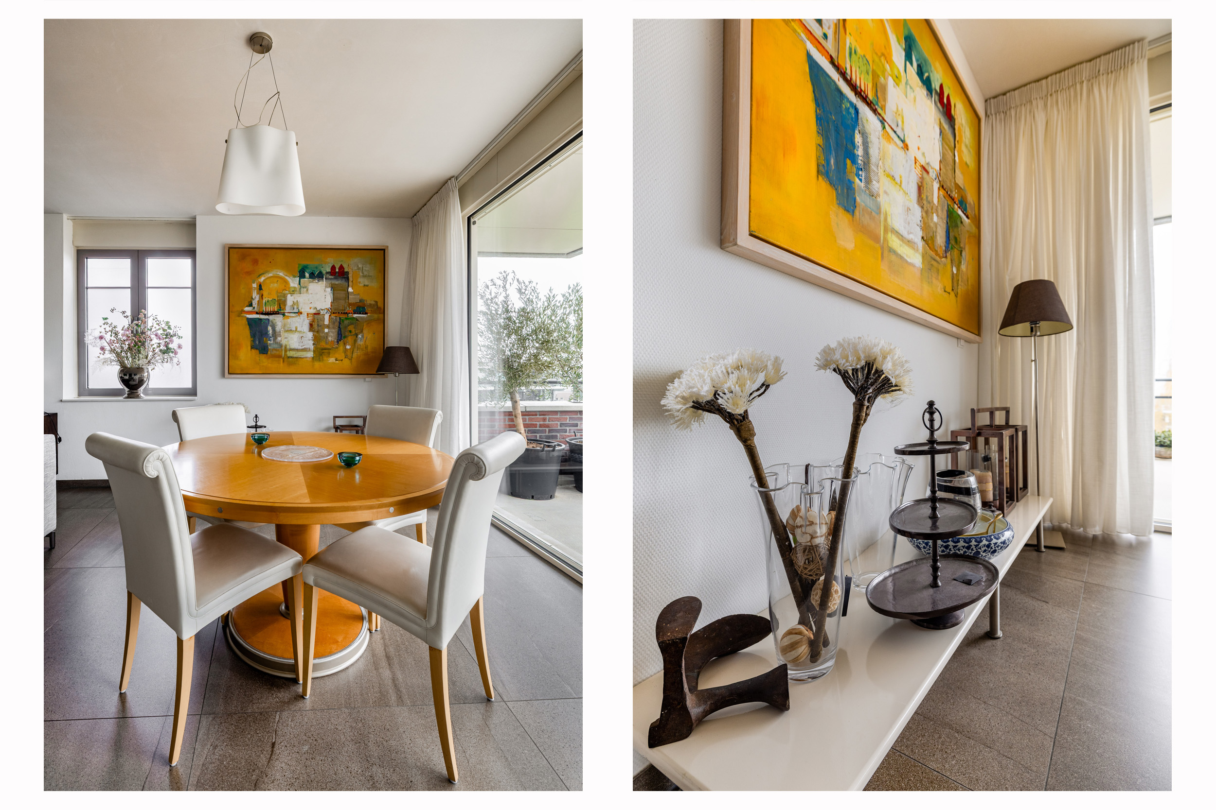The living room is without a doubt the beating heart of the apartment and feels spacious, bright and relaxed. The generous seating area easily accommodates a large lounge setup as well as guests. Through the wide sliding doors, you step directly onto the large southeast-facing terrace. This terrace is truly impressive in size: there is plenty of room for a large dining table, lounge furniture and greenery, making it a perfect place to relax with family and friends.