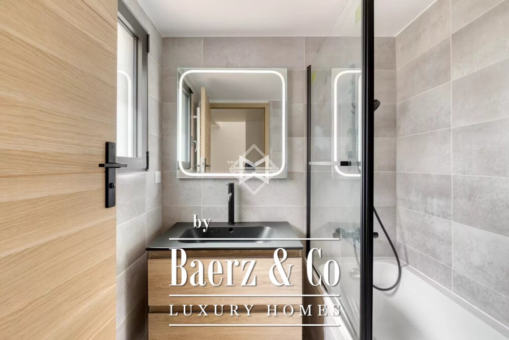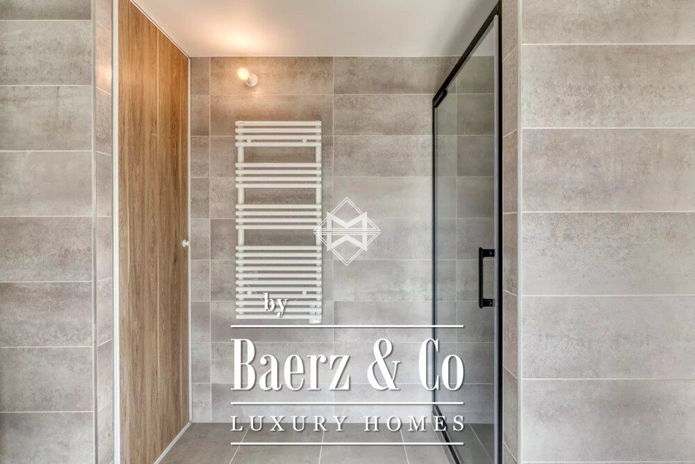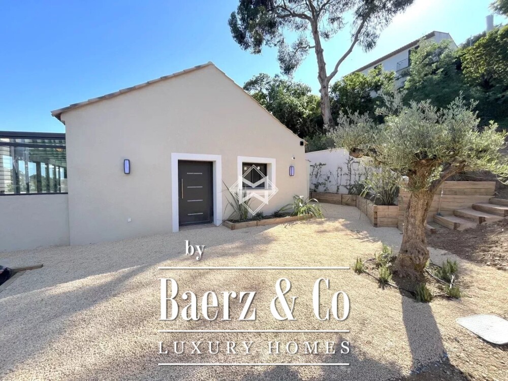 Below, a separate 45 m² apartment offers a living room with open-plan kitchen, an en suite bedroom, and direct garden access. Set on 1,015 m² of landscaped grounds, the villa faces south-east and offers a heated swimming pool, rooftop terrace, carport for two vehicles, and discreet security features including air conditioning, alarm, and surveillance cameras.