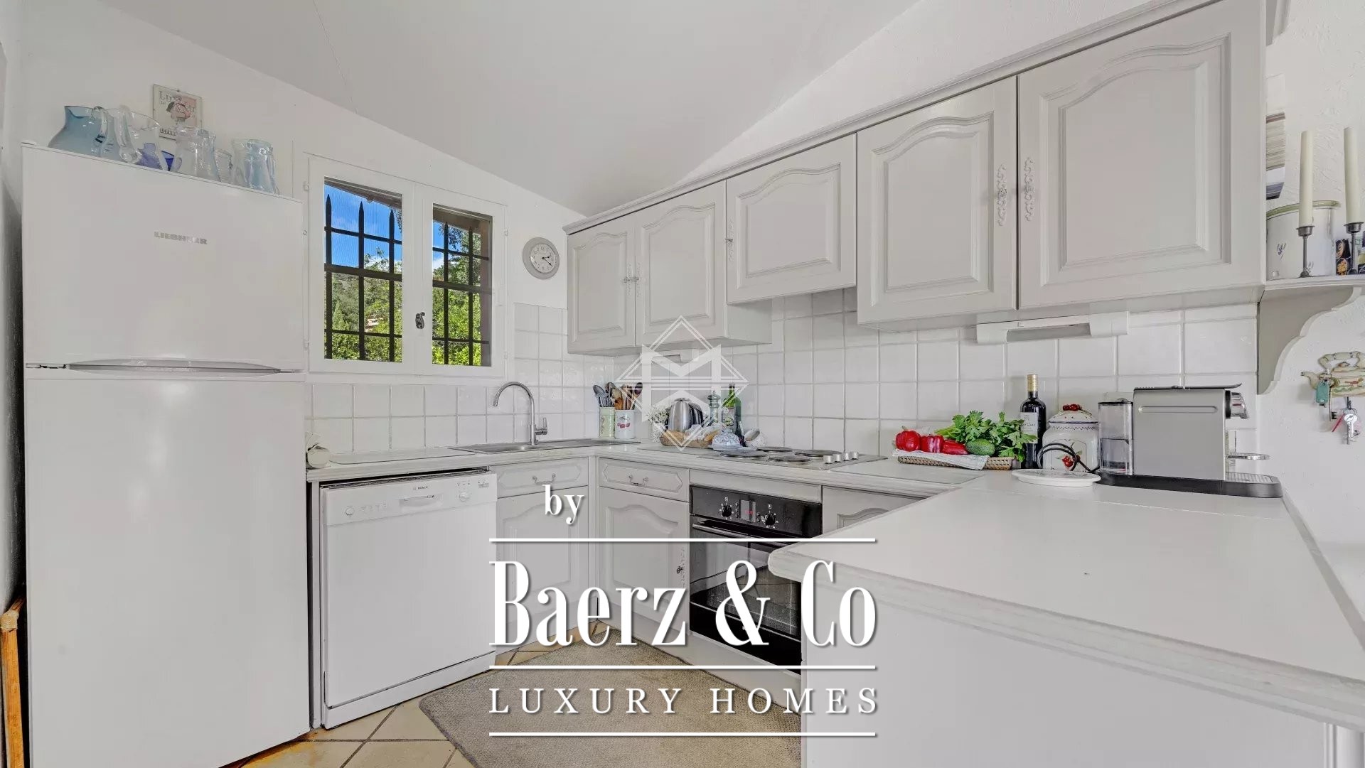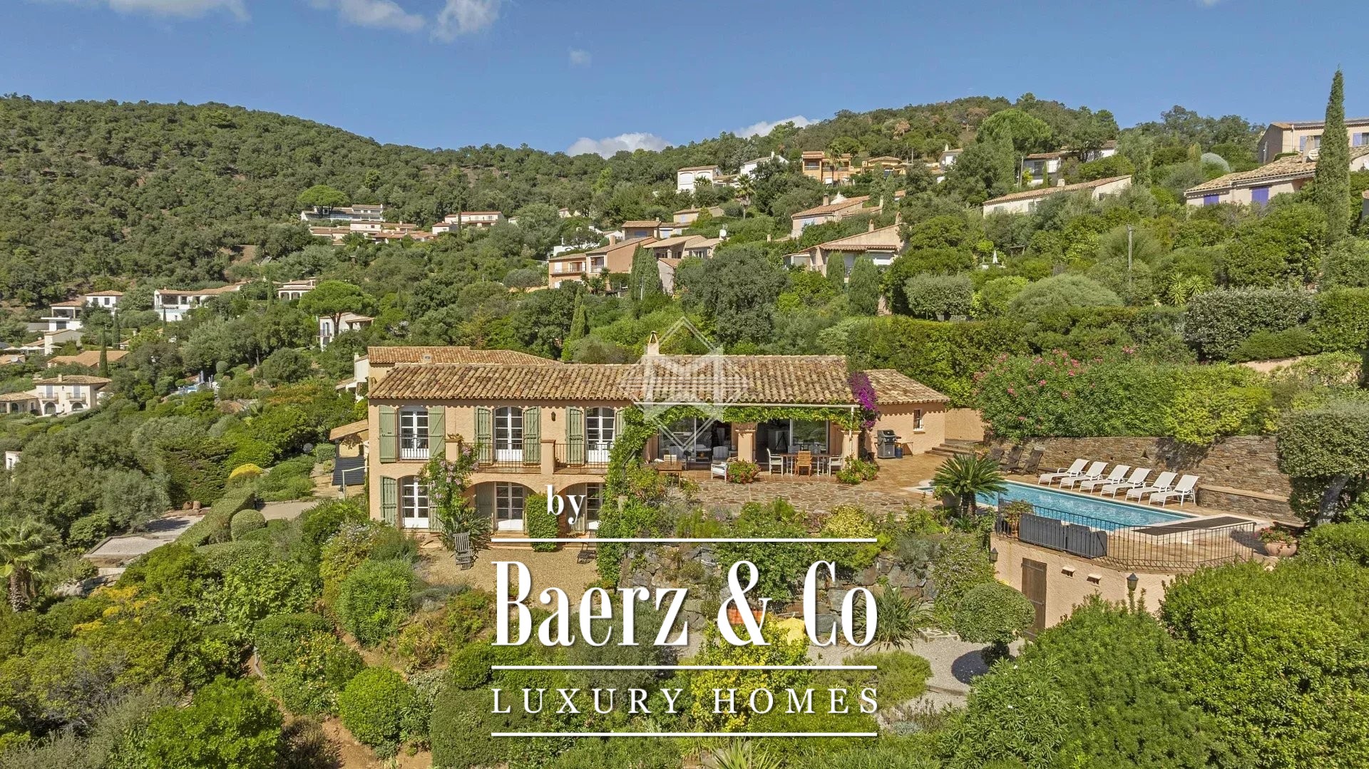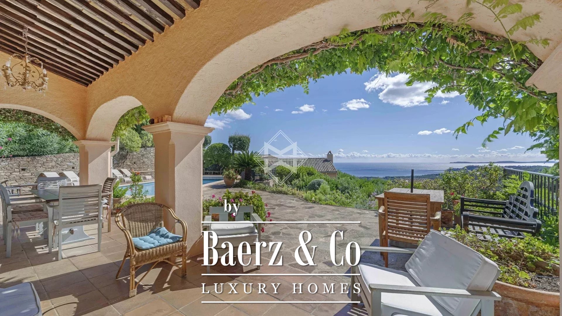 The 2300sqm plot ensures complete privacy and includes a pétanque court, meticulously maintained Mediterranean plants, an 8x4 m swimming pool, double garage and multiple parking spaces, electric gate with intercom, automatic irrigation system, outdoor lighting, and mains drainage.