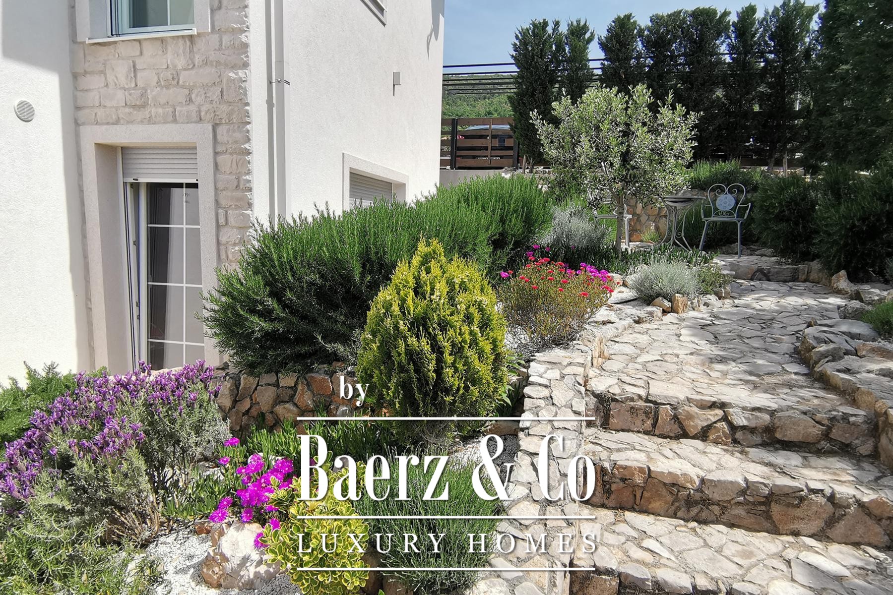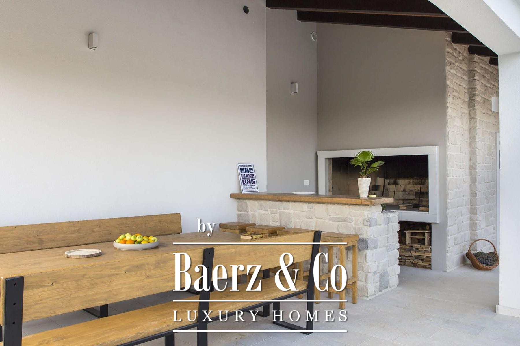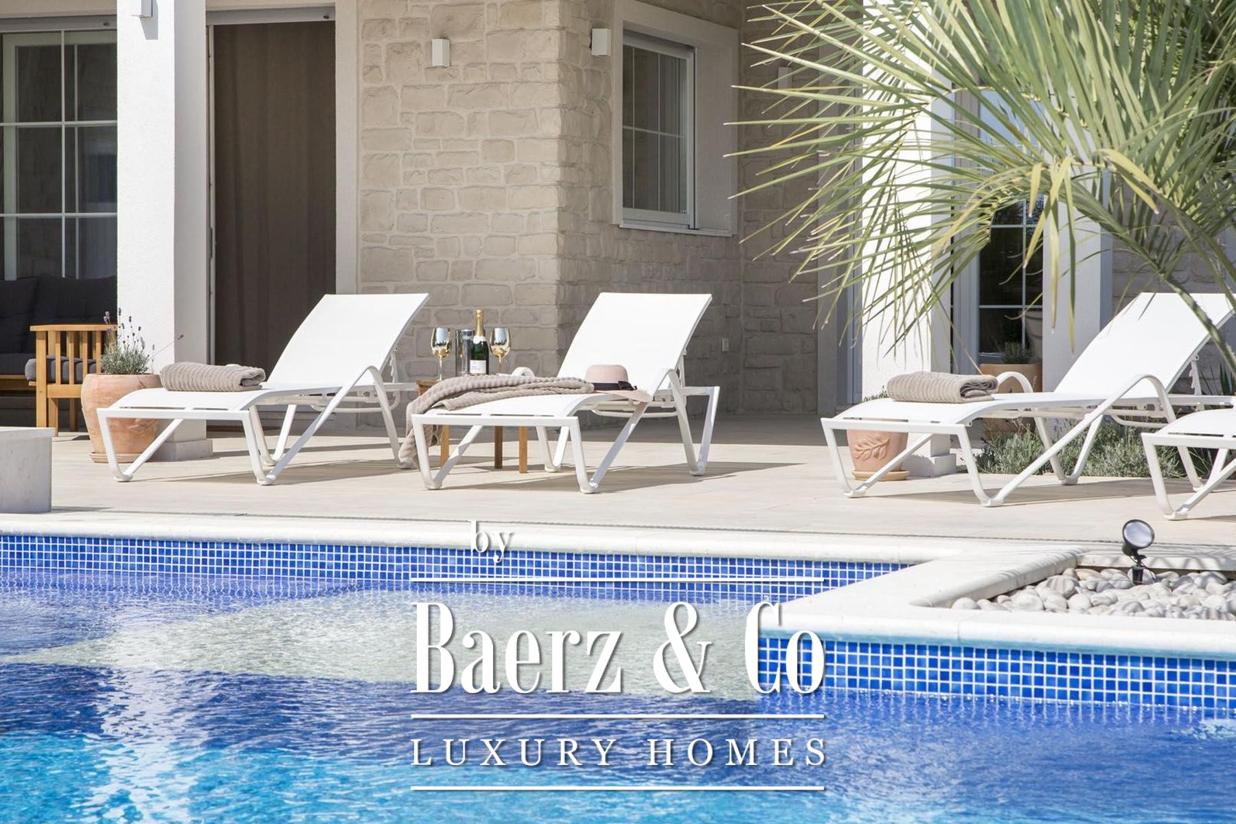 sofas, a Smart TV and a Hi-Fi system, a beautiful fireplace and an underfloor heating system. There is also a nice bar for spending pleasant moments with family and friends in the evening. The real luxury of the villa is the indoor wellness area with a sauna, shower, toilet and heated walls. In the anteroom of the sauna there is a Laconium with a heated relaxation bench and built-in speakers through which you can enjoy soothing music during your stay in the spa area.The villa is located on a 990 m2 large, completely fenced property. From the living room on the ground floor of the villa there is an exit to a spacious, partially covered terrace with an overflow pool of 58 m2, equipped with a massage waterfall, counter-current swimming, a shallow area for children, wide stairs and an underwater bench.The villa's outdoor area also features a 6-person jacuzzi, where relaxing at sunset is a special experience. The outdoor area also includes a covered summer kitchen with a large barbecue, a bar and a massive table and wooden benches, as well as a comfortable lounge area. An additional advantage of the villa is the electric vehicle charger.For additional information and to organize a tour, please contact us.