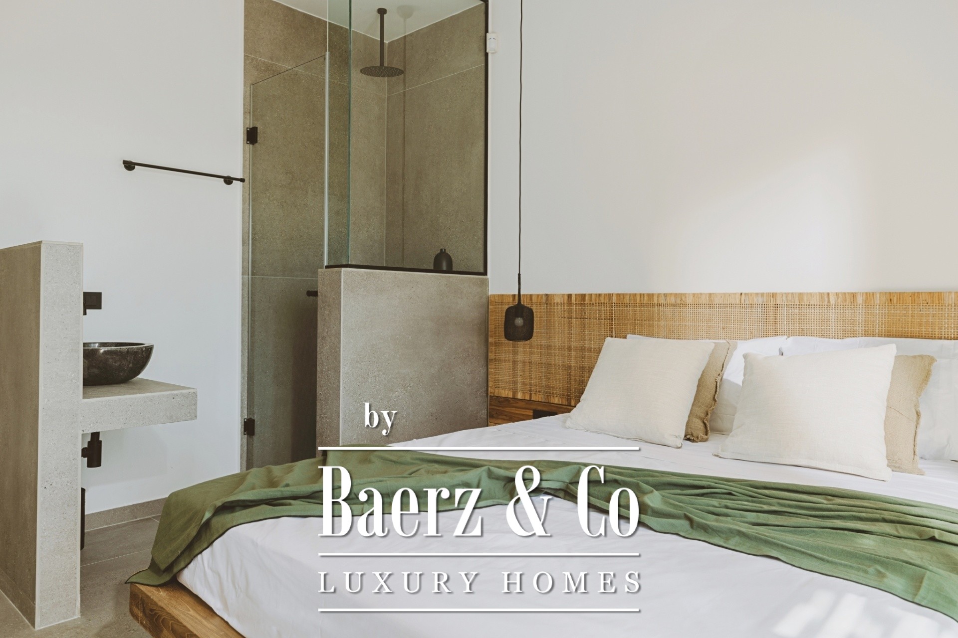 Descending the internal staircase, the pool level unfolds—a cinematic infinity pool creates an illusion of sea blending with sky. At its center, an island lounge invites moments of restful pause. Four generous en-suite bedrooms line this level, each oriented for privacy and outlook. The outdoor dining area beneath a crafted pergola becomes a natural gathering point as sunsets sweep across the terrace and water.