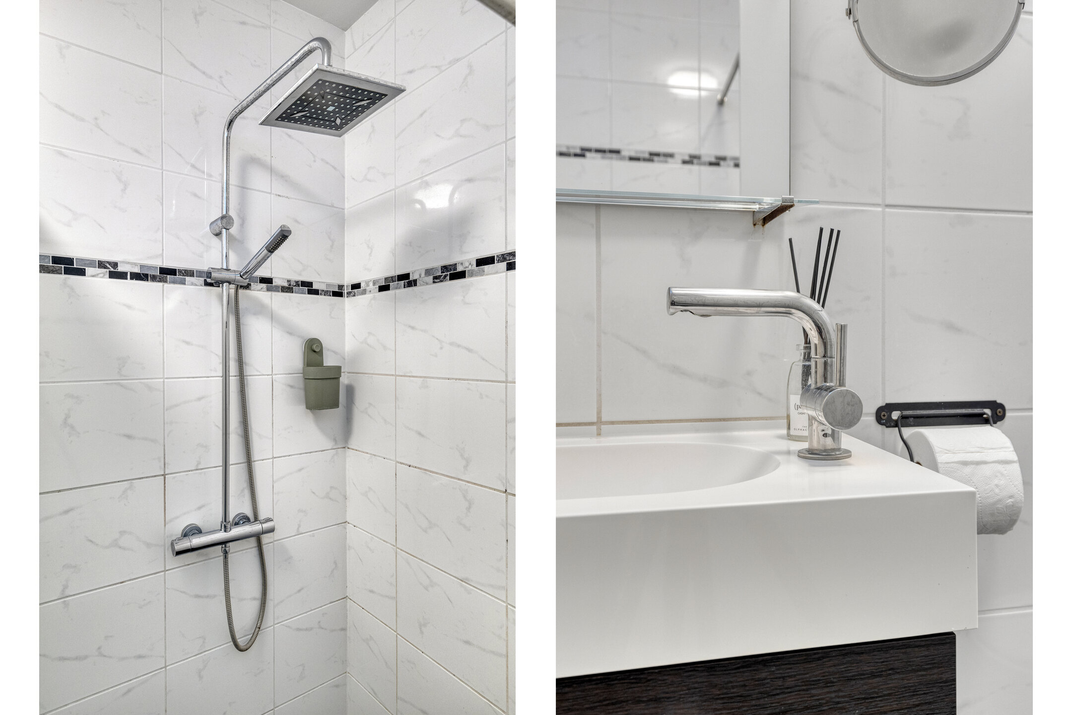 The layout is playful and spacious, spread over several levels. A private entrance at street level leads to the basement, which offers practical space and storage. The living floors contain the kitchen, several bedrooms, and bathrooms, connected by hallways and landings that create a pleasant flow throughout the home. On the top floor, there is a bedroom with direct access to the roof terrace, a wonderful spot offering privacy and views of the historic buildings. There is also a mezzanine that is ideal as a workspace, studio, or additional living space.